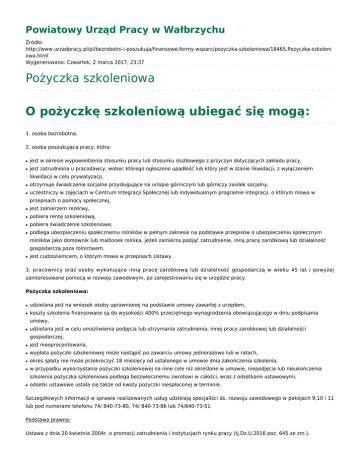 Powiatowy Urząd Pracy w Wałbrzychu Źródło: http://www.urzadpracy.pl/pl/bezrobotni-i-poszukuja/finansowe-formy-wsparc/pozyczka-szkoleniowa/18465,Pozyczka-szkoleni owa.html Wygenerowano: Czwartek, 2 marca 2017, 23:37 Pożyczka szkoleniowa O pożyczkę szkoleniową ubiegać się mogą: 1. osoba bezrobotna, 2. osoba poszukująca pracy, która: ● jest w okresie wypowiedzenia stosunku pracy lub stosunku służbowego z przyczyn dotyczących zakładu pracy, ● jest zatrudniona u pracodawcy, wobec którego ogłoszono upadłość lub który jest w stanie likwidacji, z wyłączeniem likwidacji w celu prywatyzacji, ● otrzymuje świadczenie socjalne przysługujące na urlopie górniczym lub górniczy zasiłek socjalny, ● uczestniczy w zajęciach w Centrum Integracji Społecznej lub indywidualnym programie integracji, o którym mowa w przepisach o pomocy społecznej, ● jest żołnierzem rezerwy, ● pobiera rentę szkoleniową, ● pobiera świadczenie szkoleniowe, ● podlega ubezpieczeniu społecznemu rolników w pełnym zakresie na podstawie przepisów o ubezpieczeniu społecznym rolników jako domownik lub małżonek rolnika, jeżeli zamierza podjąć zatrudnienie, inną pracę zarobkową lub działalność gospodarczą poza rolnictwem. ● jest cudzoziemcem, o którym mowa w przepisach Ustawy. 3. pracownicy oraz osoby wykonujące inną pracę zarobkową lub działalność gospodarczą w wieku 45 lat i powyżej zainteresowane pomocą w rozwoju zawodowym, po zarejestrowaniu się w urzędzie pracy. Pożyczka szkoleniowa: ● udzielana jest na wniosek osoby uprawnionej na podstawie umowy zawartej z urzędem, ● koszty szkolenia finansowane są do wysokości 400% przeciętnego wynagrodzenia obowiązującego w dniu podpisania umowy, ● udzielana jest w celu umożliwienia podjęcia lub utrzymania zatrudnienia, innej pracy zarobkowej lub działalności gospodarczej, ● jest nieoprocentowana, ● wypłata pożyczki szkoleniowej może nastąpić po zawarciu umowy jednorazowo lub w ratach, ● okres spłaty nie może przekroczyć 18 miesięcy od ustalonego w umowie dnia zakończenia szkolenia, ● w przypadku wykorzystania pożyczki szkoleniowej na inne cele niż określone w umowie, niepodjęcia lub nieukończenia szkolenia pożyczka szkoleniowa podlega bezzwłocznemu zwrotowi w całości, wraz z odsetkami ustawowymi, ● odsetki ustawowe ustala się także od kwoty pożyczki niespłaconej w terminie. Szczegółowych informacji w sprawie realizowanych usług udzielają specjaliści ds. rozwoju zawodowego w pokojach 9,10 i 11 lub pod numerami telefonu 74/ 840-73-80, 74/ 840-73-86 lub 74/840-73-51. Podstawa prawna: Ustawa z dnia 20 kwietnia 2004r. o promocji zatrudnienia i instytucjach rynku pracy (tj.Dz.U.2016 poz. 645 ze zm.), Rozporządzenie Ministra Pracy i Polityki Społecznej z dnia 14 maja 2014r. w sprawie szczegółowych warunków realizacji oraz trybu i sposobu prowadzenia usług rynku pracy (Dz. U. 2014.667). Metryka strony Data publikacji 11.03.2009 Data modyfikacji 06.12.2016Rejestr zmian Osoba publikująca: Beata Uhryn Autor: Magdalena Oleś Liczba wejść: 1913 Drukuj Generuj PDF Powiadom znajomego Wstecz