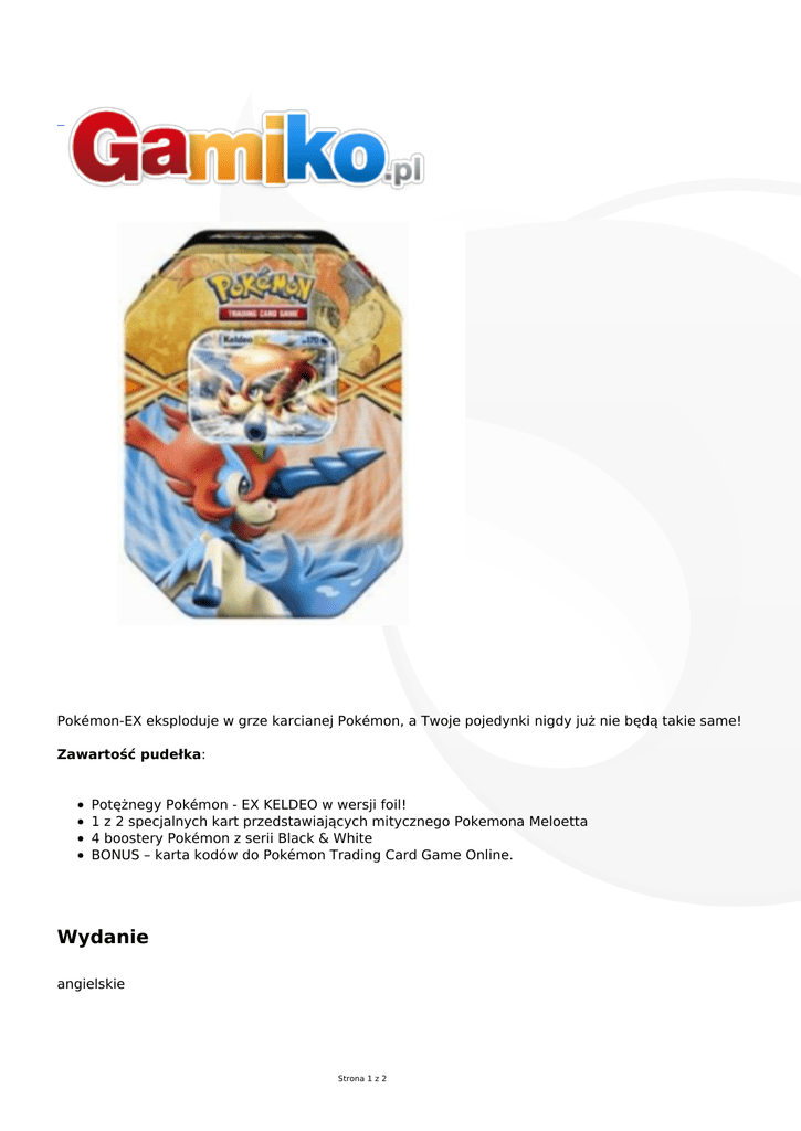 Pokémon-EX eksploduje w grze karcianej Pokémon, a Twoje pojedynki nigdy już nie będą takie same! Zawartość pudełka: Potężnegy Pokémon - EX KELDEO w wersji foil! 1 z 2 specjalnych kart przedstawiających mitycznego Pokemona Meloetta 4 boostery Pokémon z serii Black & White BONUS – karta kodów do Pokémon Trading Card Game Online. Wydanie angielskie Strona 1 z 2 Producent POKEMON USA Strona 2 z 2