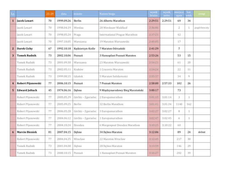 25-29 data miasto Nazwa biegu wynik brutto wynik netto Jacek Lenart 70 1999.09.26 Berlin 26 Alberto Marathon 2:29:51 2:29:51 Jacek Lenart 70 1998.04.19 Werdau 20 Werdauer Waldlauf Jacek Lenart 70 1998.05.24 Praga Jacek Lenart 70 1997.10.05 2 Darek Cichy 67 3 Tomek Rudnik Lp. miejsce kat. open wiek. 69 34 2:36:06 2 1 International Prague Marathon 2:37:21 42 Warszawa 19 Maraton Warszawski 2:40:05 17 1992.10.18 Kędzierzyn-Koźle 7 Maraton Odrzański 2:41:29 7 73 2002.10.06 Poznań 3 Hansaplast Poznań Maraton 2:53:26 53 15 Tomek Rudnik 73 2001.09.30 Warszawa 23 Maraton Warszawski 2:54:21 61 20 Tomek Rudnik 73 2002.05.11 Kraków 1 Cracovia Maraton 2:54:24 22 11 Tomek Rudnik 73 1999.08.15 Gdańsk 5 Maraton Solidarności 2:55:37 34 9 4 Robert Pijanowski 77 2006.10.15 Poznań 7 Poznań Maraton 2:58:00 102 26 5 Edward Jołtuch 45 1974.06.16 Dębno 9 Międzynarodowy Bieg Maratoński 3:00:17 Robert Pijanowski 77 2005.05.29 Görlitz – Zgorzelec 2 Europamarathon 3:01:15 3:01:14 3 1 Robert Pijanowski 77 2005.09.25 Berlin 32 Berlin Marathon 3:01:41 3:01:34 1140 162 Robert Pijanowski 77 2006.05.28 Görlitz – Zgorzelec 3 Europamarathon 3:02:27 3:02:27 8 1 Robert Pijanowski 77 2004.06.12 Görlitz – Zgorzelec 1 Europamarathon 3:02:47 3:02:45 6 1 Robert Pijanowski 77 2004.10.24 Dresden 6 Morgenpost Dresden Marathon 3:10:25 3:10:22 60 Marcin Bieniek 81 2007.04.15 Dębno 34 Dębno Maraton 3:12:06 89 24 Robert Pijanowski 77 2004.04.25 Wrocław 22 Maraton Wrocław 3:12:45 217 30 Tomek Rudnik 73 2001.04.08 Dębno 28 Dębno Maraton 3:13:59 146 29 Tomek Rudnik 73 2000.10.15 Poznań 1 Hansaplast Poznań Maraton 3:16:27 202 39 1 6 2:57:33 uwagi pagórkowaty 73 debiut Robert Pijanowski 77 2006.04.09 Paryż 30 Paris Marathon 3:21:34 4637 Tomek Rudnik 73 2000.08.15 Gdańsk 6 Maraton Solidarności 3:26:15 37 11 Tomek Rudnik 73 1998.10.04 Warszawa 20 Maraton Warszawski 3:27:05 334 77