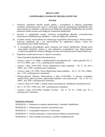 REGULAMIN GOSPODARKI ZASOBAMI MIESZKANIOWYMI WSTĘP 1. Niniejszy regulamin określa zasady ogólne i szczegółowe w zakresie gospodarki zasobami mieszkaniowymi, prawa i obowiązki zarówno administracji Spółdzielni jako reprezentacji jej członków, osób prawnych będących członkami Spółdzielni, jak również najemców lokali użytkowych będących własnością Spółdzielni. 2. Zawarte w regulaminie zasady rozliczeń uwzględniają aktualne uwarunkowania ekonomiczne Spółdzielni jej członków i osób nie będących członkami. 3a/ wszelkie zmiany wprowadzone do mniejszego regulaminu obowiązują w formie aneksu. Zarówno regulamin jak i też wprowadzone do regulaminu aneksy, winny być zatwierdzone przez Radę Nadzorczą. b/ w szczególnych przypadkach, gdzie narażony jest interes Spółdzielni, Zarząd może wprowadzić określone zmiany w celu uniknięcia ewentualnych strat. Wprowadzone w takich przypadkach zmiany podlegają również zatwierdzeniu przez Radę Nadzorczą. 4. Regulamin został opracowany w oparciu o przepisy: — Statut Sanockiej Spółdzielni Mieszkaniowej, — Ustawa z dnia 15.12.2000r. o spółdzielniach mieszkaniowych – (tekst jednolity Dz. U. Nr 119 z 2003r., poz. 1116, z późniejszymi zmianami), — Ustawa z dnia 16.09.1982r. Prawo Spółdzielcze (tekst jednolity – Dz. U. Nr 188 z 2003r., poz. 1848, z późniejszymi zmianami), — Ustawa z dnia 7.07.1994r. Prawo Budowlane (tekst jednolity – Dz. U. Nr 156 z 2006r., poz. 1118, z późniejszymi zmianami), — Rozporządzenie Ministra Infrastruktury z dnia 12.04.2002r. w sprawie warunków technicznych, jakim powinny odpowiadać budynki i ich usytuowanie – Dz. U. Nr 75 z 2002r., poz. 690, z późniejszymi zmianami, — Ustawa z dnia 2.07.1994r. o najmie lokali mieszkalnych i dodatkach mieszkaniowych, — Dz. U. Nr 105 z 1994r. poz. 509, z późniejszymi zmianami, — Ustawa z dnia 23.04.1964r. Kodeks Cywilny – Dz. U. Nr 16 z 1964r. poz. 93, z późniejszymi zmianami, Regulamin obejmuje: ROZDZIAŁ l - Podstawowe zadania administracji i członków Spółdzielni. ROZDZIAŁ 2 - Eksploatacja zasobów mieszkaniowych. ROZDZIAŁ 3 - Gospodarka finansowa i rozliczenia. ROZDZIAŁ 4 - Zasady naliczania i wykorzystania funduszu remontowego. ROZDZIAŁ 5 - Inne warunki korzystania z zasobów spółdzielczych. 1 ROZDZIAŁ l PODSTAWOWE ZADANIA ADMINISTRACJI I CZŁONKÓW SPÓŁDZIELNI 1.1. Zespołem odpowiedzialnym za sprawne zarządzanie zasobami Spółdzielni jest Zakład Gospodarki Zasobami Mieszkaniowymi (ZGZM). Jego strukturę ustala Zarząd Spółdzielni dostosowując ją do potrzeb Spółdzielni tak by zapewnić prawidłową, a jednocześnie oszczędną gospodarkę zasobami mieszkaniowymi i lokalami użytkowymi stanowiącymi własność Spółdzielni. Struktura ta podlega zatwierdzeniu przez Radę Nadzorczą. 1.2. Podstawowe zadania Zakładu Gospodarki Zasobami Mieszkaniowymi: — przejmowanie od wykonawcy budynków do eksploatacji oraz sprawne zasiedlanie lokatorów, — udział w przeglądach gwarancyjnych oraz zapewnienie usuwania wad i usterek ujawnionych w okresie gwarancyjnym i pogwarancyjnym, — utrzymanie czystości i porządku w budynkach i ich otoczeniu, — zapewnienie mieszkańcom możliwości korzystania z niezbędnych usług komunalnych /woda, kanalizacja, wywóz śmieci, centralne ogrzewanie, centralna ciepła woda/, — eksploatacja dźwigów osobowych i towarowych, — zapewnienie dostarczenia sygnału RTV- tzw. pakiet socjalny, — nadzór techniczny nad budynkami i urządzeniami z nimi związanymi, — zapewnienie obsługi administracyjnej poprzez bieżącą konserwację i eksploatację /zakres prac określa niniejszy regulamin - rozdz. 2/, — oraz bezpieczeństwa przeciwpożarowego zapewnienie wykonawstwa robót remontowych. 1.3. Podstawowe obowiązki członków Spółdzielni oraz najemców lokali użytkowych: — przestrzeganie regulaminu porządku domowego oraz przepisów bezpieczeństwa przeciwpożarowego, — przestrzeganie zasad współżycia społecznego, — prawidłowa i oszczędna eksploatacja zajmowanych lokali mieszkalnych i użytkowych, — utrzymanie czystości, — wykonywanie napraw i konserwacji w lokalu, — regulowanie terminowo należności czynszowych, — przestrzeganie zasad rozliczeń finansowych przyjętych w niniejszym regulaminie. 2 ROZDZIAŁ 2 EKSPLOATACJA ZASOBÓW MIESZKANIOWYCH 1. Przejęcie budynków do eksploatacji (od wykonawcy). 1.1. Przyjęcie budynków od wykonawcy. Może być ono dokonane wówczas, gdy przyjmowany obiekt wraz z zagospodarowaniem terenu spełnia warunki do umożliwienia jego eksploatacji. Do podstawowych warunków jakie winny być spełnione przy dokonaniu odbioru należy zaliczyć: — wykonanie kompleksowo zakresu robót zgodnie z umową i dokumentacją techniczną, — wykonanie robót zgodnie z zasadami określonymi w warunkach technicznych wykonania i odbioru, — przygotowanie do odbioru obiektu oraz niezbędnej dokumentacji, do której należy zaliczyć: a) umowę pomiędzy wykonawcą a inwestorem, aneksy określające zakres robót dodatkowych i robót niewykonanych, b) sprawozdanie z budowy z wykazem zmian w stosunku do projektu, zestawienie wad nie dających się usunąć, c) inwentaryzacja obiektów i uzbrojenia w sieci podziemne i nadziemne, d) dokumentacja techniczna, e) dziennik budowy, f) ewentualne ekspertyzy wykonane w czasie realizacji, g) protokoły: — technicznych odbiorów międzyoperacyjnych, — sprawdzenia i kontroli przewodów dymowych, spalinowych i wentylacyjnych, — odbioru instalacji centralnego ogrzewania i centralnej ciepłej wody, — protokoły odbioru instalacji elektrycznych, telefonicznych, RTV, — protokoły odbioru instalacji gazowej, — protokoły badań skuteczności zerowania, odgromowych i wyrównawczych, — protokoły innych odbiorów technicznych związanych z przekazaniem obiektu do użytku. oporności izolacji oraz uziemień 1.2. Rękojmia za wady. Do obowiązków Zakładu Gospodar