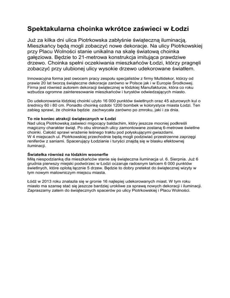 Spektakularna choinka wkrótce zaświeci w Łodzi Już za kilka dni ulica Piotrkowska zabłyśnie świąteczną iluminacją. Mieszkańcy będą mogli zobaczyć nowe dekoracje. Na ulicy Piotrkowskiej przy Placu Wolności stanie unikalna na skalę światową choinka gałęziowa. Będzie to 21-metrowa konstrukcja imitująca prawdziwe drzewo. Choinka spełni oczekiwania mieszkańców Łodzi, którzy pragnęli zobaczyć przy ulubionej ulicy wysokie drzewo udekorowane światłem. Innowacyjna forma jest owocem pracy zespołu specjalistów z firmy Multidekor, którzy od prawie 20 lat tworzą świąteczne dekoracje zarówno w Polsce jak i w Europie Środkowej. Firma jest również autorem dekoracji świątecznej w łódzkiej Manufakturze, która co roku wzbudza ogromne zainteresowanie mieszkańców i turystów odwiedzających miasto. Do udekorowania łódzkiej choinki użyto 16 000 punktów świetlnych oraz 45 ażurowych kul o średnicy 60 i 80 cm. Ponadto choinkę ozdobi 1200 bombek w kolorystyce miasta Łodzi. Ten zabieg sprawi, że choinka będzie zachwycała zarówno po zmroku, jaki i za dnia. To nie koniec atrakcji świątecznych w Łodzi Nad ulicą Piotrkowską zaświeci migocący baldachim, który jeszcze mocniej podkreśli magiczny charakter świąt. Po obu stronach ulicy zamontowane zostaną 6-metrowe świetlne choinki. Całość sprawi wrażenie leśnego traktu pod połyskującymi gwiazdami. W 4 miejscach ul. Piotrkowskiej przechodnie będą mogli podziwiać przestrzenne zaprzęgi reniferów z saniami. Spacerujący Łodzianie i turyści znajdą się w blasku efektownej iluminacji. Światełka również na łódzkim woonerfie Miłą niespodzianką dla mieszkańców stanie się świąteczna iluminacja ul. 6. Sierpnia. Już 6 grudnia pierwszy miejski podwórzec w Łodzi oczaruje radosnym tańcem 6 000 punktów świetlnych, które oplotą łącznie 5 drzew. Będzie to dobry pretekst do świątecznej wizyty w tym nowym malowniczym miejscu miasta. Łódź w 2013 roku znalazła się w gronie 16 najlepiej udekorowanych miast. W tym roku miasto ma szansę stać się jeszcze bardziej urokliwe za sprawą nowych dekoracji i iluminacji. Zapraszamy zatem do świątecznych spacerów po ulicy Piotrkowskiej i Placu Wolności. Wizualizacje dekoracji świątecznych w Łodzi: Podstawowe informacje o Multidekor: Od 1996 roku Multidekor, firma założona przez braci Grzegorza i Tomasza Podogrockich, projektuje i produkuje unikatowe dekoracje i iluminacje świąteczne . Głównymi odbiorcami firmy są miasta i gminy oraz centra handlowe i punkty usługowe, ponadto Multidekor dekoruje przestrzeń publiczną oraz prywatną. Na uwagę zasługuje ponowny wybór firmy Multidekor jako generalnego projektanta i wykonawcę iluminacji m.in. Warszawy, Łodzi, Katowic i Gdyni oraz obsługi największych grup zarządzających centrami handlowymi m.in. Metro Properties, MMG Master Management Group, Multi Corporation, Segece, APSYS, Klepierre, DTZ, GTC i Carrefour. Kontakt do mediów: Krzysztof Pietrek, Brand Manager M: +48 512 147 201, E: [email protected] Mariusz Sadurski Koordynator ds. marketingu i PR M: +48 512 330 972, E: [email protected]