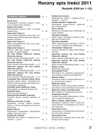 Roczny spis treści 2011 Rocznik XVIII (nr 1–12) Artykuły ogólne nr s. Baruk Jerzy Wspomaganie tworzenia wartości i innowacji strategicznymi relacjami 10 7 Bednarz Krzysztof Wykorzystanie macierzy ADL w rozwoju własnej firmy 11 20 Da˛browski Tomasz J. Cause-related marketing w kreowaniu i komunikowaniu polityki społecznej odpowiedzialności biznesu 3 2 Da˛browski Tomasz J. Marka przedsie˛biorstwa jako nowy paradygmat brandingu 9 2 Da˛browski Tomasz J. Polityka CSR jako element umacniania reputacji. Przykład banków 2 2 Du Cane Dustin, Falkowski Andrzej, Olszewska Justyna Kolor i kształt w identyfikacji marki — cz. 1 4 13 Du Cane Dustin, Falkowski Andrzej, Olszewska Justyna Kolor i kształt w identyfikacji marki — cz. 2 5 16 Falkowski Andrzej, Du Cane Dustin, Olszewska Justyna Kolor i kształt w identyfikacji marki — cz. 1 4 13 Falkowski Andrzej, Du Cane Dustin, Olszewska Justyna Kolor i kształt w identyfikacji marki — cz. 2 5 16 Gorbaniuk Oleg, Stachoń-Wójcik Maria Zgodność obrazu siebie i wizerunku konsumenta. Wartość predykcyjna różnych metod pomiaru kongruencji 6 17 Gurziński Jacek, Rudzewicz Adam Rola zaufania w relacjach biznesowych 2 19 Kamiński Jacek Kiedy powstał marketing? 6 2 Kańczukowska-Stadnik Agnieszka Czynniki sukcesu nowego produktu na rynku 9 15 Kłosiewicz-Górecka Urszula Stymulatory rozwoju małych przedsie˛biorstw w okresie chwiejnego rozwoju gospodarczego 7 2 Komor Marcin Segmentacja europejskich konsumentów według teorii stylu życia 7 14 Koniorczyk Grażyna Marketing dla rynków o najniższych dochodach — cze˛ść I 10 2 Koniorczyk Grażyna Marketing dla rynków o najniższych dochodach — cze˛ść II 11 2 Lisińska-Kuśnierz Małgorzata Postrzeganie bezpieczeństwa opakowań przez konsumentów 1 18 Meyer Maciej Kulturowe uwarunkowania marketingu na rynku chińskim 4 7 Mirońska Dominika Jakość usług z perspektywy klienta. Przegla˛d metod badawczych 6 10 Mirońska Dominika Obraz współczesnego darczyńcy w Polsce i na świecie. Implikacje dla marketingu 12 7 Niesiobe˛dzka Małgorzata Nastrój a skłonność do kupowania kompulsywnego 9 9 Olszewska Justyna, Du Cane Dustin, Falkowski Andrzej Kolor i kształt w identyfikacji marki — cz. 1 4 13 Olszewska Justyna, Du Cane Dustin, Falkowski Andrzej Kolor i kształt w identyfikacji marki — cz. 2 5 16 Pabian Arnold Marketing sensoryczny 1 2 Pietrasieński Paweł Rola państw we wspieraniu internacjonalizacji małych i średnich przedsie˛biorstw 2 10 Razmus Wiktor Wizerunek marki na niskowysiłkowym torze przetwarzania danych 8 16 Rudawska Edyta Afektywny wymiar relacji mie˛dzy instytucjami finansowymi a klientami biznesowymi 12 16 Rudzewicz Adam, Gurziński Jacek Rola zaufania w relacjach biznesowych 2 19 Siemieniako Dariusz Lojalność relacyjna a zobowia˛zanie w złożonych zwia˛zkach usługowych 8 10 Sikora Tadeusz, Za˛bek Janusz Satysfakcja i lojalność. Istota i trendy percepcji klientów w zmieniaja˛cym sie˛ otoczeniu organizacji 8 2 Skowronek Iwona Atmosferyka w kształtowaniu prowizerunkowych postaw klientów 3 9 Skowronek Iwona Oddziaływanie zapachem jako forma marketingu sensorycznego 1 6 12 /2011 37 Stachoń-Wójcik Maria, Gorbaniuk Oleg Zgodność obrazu siebie i wizerunku konsumenta. Wartość predykcyjna różnych metod pomiaru kongruencji 6 17 Szreder Mirosław O niektórych źródłach i konsekwencjach braków odpowiedzi w badaniach ankietowych 5 2 Szwajca Danuta Czy można skutecznie zarza˛dzać reputacja˛ firmy? 7 8 Ucherek Marzena Opakowania inteligentne i ich postrzeganie przez konsumentów 1 12 Wie˛cek-Janka Ewa Komunikacja mie˛dzykulturowa 4 2 Wie˛cek-Janka Ewa Konflikt mie˛dzykulturowy jako forma zaburzonej komunikacji 5 6 Wojciechowski Tadeusz Koncepcja zmiany definicji reklamy 12 2 Woźniczka Jarosław Postawa wobec reklamy a postawa wobec marki w świetle wyników badania efektów komunikacyjnych sieci detalicznych 11 10 Woźniczka Jarosław Wykorzystanie tzw. zwykłych ludzi i znanych postaci w kreacji reklamowej a efekty komunikacyjne reklamy 10 14 Za˛bek Janusz, Sikora Tadeusz Satysfakcja i lojalność. Istota i trendy percepcji klientów w zmieniaja˛cym sie˛ otoczeniu organizacji 8 2 Żabiński Ryszard Spowolnienie gospodarcze na rynku medialnym 3 15 Marketing w praktyce Drapińska Anna Komunikacja marketingowa pomie˛dzy szkoła˛ wyższa˛ a studentami 5 Dudek Andrzej, Michalska-Dudek Izabela Model przewidywania lojalności klientów biur podróży z wykorzystaniem sieci neuronowej typu MLP 8 Jaciow Magdalena Polski e-konsument. Założenia metodologiczne badań 5 Lotko Aleksander Zarza˛dzanie reklamacjami w centrach kontaktu z klientem 1 Michalczyk Leszek Advergaming jako internetowe źródło strategii marketingowych 12 38 21 21 27 23 20 Michalska-Dudek Izabela, Dudek Andrzej Model przewidywania lojalności klientów biur podróży z wykorzystaniem sieci neuronowej typu MLP 8 21 Michałowska Ewelina, Tarant Szymon Koncepcja kompleksowych działań promocyjnych ukierunkowanych na studentów 3 23 Sagan Mariusz, Zarzycka Anna M. Pomiar najlepszych praktyk marketingowych 7 20 Szymańska Anna Irena Badania preferencji konsumentów z wykorzystaniem kompozycyjnej metody badań MDPREF 10 23 Tarant Szymon, Michałowska Ewelina Koncepcja kompleksowych działań promocyjnych ukierunkowanych na studentów 3 23 Tarka Piotr Skuteczność badań marketingowych i marketing intelligence 4 19 Wiśniewska Sylwia Innowacje marketingowe w polskich przedsie˛biorstwach 11 30 Zarzycka Anna M., Sagan Mariusz Pomiar najlepszych praktyk marketingowych 7 20 Realia rynku Adamczyk Grażyna, Anioła Paulina Klasyfikacja typów zachowań ludzi młodych na rynku usług bankowych z zastosowaniem wielowymiarowych metod analizy danych 10 30 Anioła Paulina, Adamczyk Grażyna Klasyfikacja typów zachowań ludzi młodych na rynku usług bankowych z zastosowaniem wielowymiarowych metod analizy danych 10 30 Białoskurski Sebastian Wpływ jakości produktów