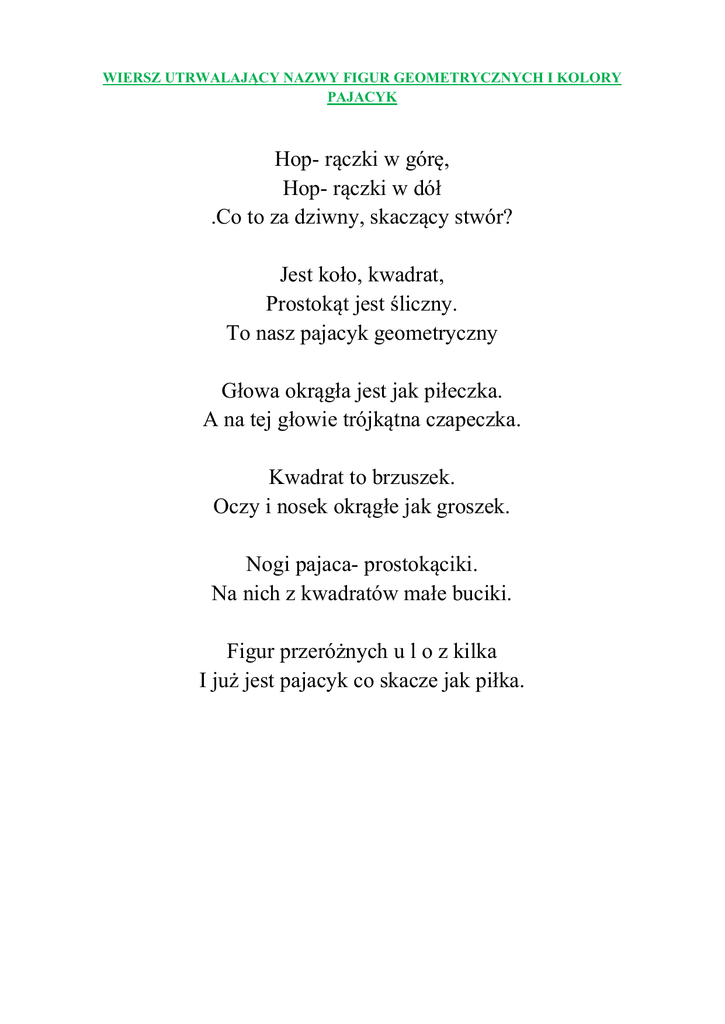 WIERSZ UTRWALAJĄCY NAZWY FIGUR GEOMETRYCZNYCH I KOLORY PAJACYK Hop- rączki w górę, Hop- rączki w dół .Co to za dziwny, skaczący stwór? Jest koło, kwadrat, Prostokąt jest śliczny. To nasz pajacyk geometryczny Głowa okrągła jest jak piłeczka. A na tej głowie trójkątna czapeczka. Kwadrat to brzuszek. Oczy i nosek okrągłe jak groszek. Nogi pajaca- prostokąciki. Na nich z kwadratów małe buciki. Figur przeróżnych u l o z kilka I już jest pajacyk co skacze jak piłka.
