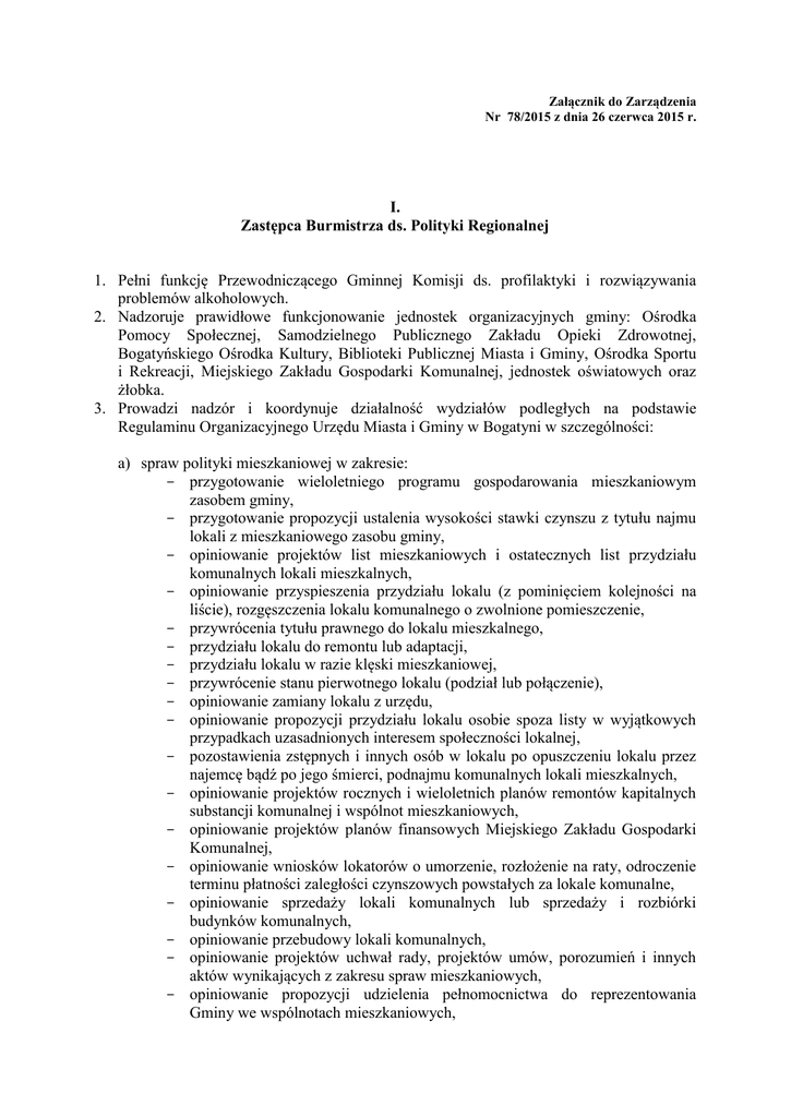 Załącznik do Zarządzenia Nr 78/2015 z dnia 26 czerwca 2015 r. I. Zastępca Burmistrza ds. Polityki Regionalnej 1. Pełni funkcję Przewodniczącego Gminnej Komisji ds. profilaktyki i rozwiązywania problemów alkoholowych. 2. Nadzoruje prawidłowe funkcjonowanie jednostek organizacyjnych gminy: Ośrodka Pomocy Społecznej, Samodzielnego Publicznego Zakładu Opieki Zdrowotnej, Bogatyńskiego Ośrodka Kultury, Biblioteki Publicznej Miasta i Gminy, Ośrodka Sportu i Rekreacji, Miejskiego Zakładu Gospodarki Komunalnej, jednostek oświatowych oraz żłobka. 3. Prowadzi nadzór i koordynuje działalność wydziałów podległych na podstawie Regulaminu Organizacyjnego Urzędu Miasta i Gminy w Bogatyni w szczególności: a) spraw polityki mieszkaniowej w zakresie: - przygotowanie wieloletniego programu gospodarowania mieszkaniowym zasobem gminy, - przygotowanie propozycji ustalenia wysokości stawki czynszu z tytułu najmu lokali z mieszkaniowego zasobu gminy, - opiniowanie projektów list mieszkaniowych i ostatecznych list przydziału komunalnych lokali mieszkalnych, - opiniowanie przyspieszenia przydziału lokalu (z pominięciem kolejności na liście), rozgęszczenia lokalu komunalnego o zwolnione pomieszczenie, - przywrócenia tytułu prawnego do lokalu mieszkalnego, - przydziału lokalu do remontu lub adaptacji, - przydziału lokalu w razie klęski mieszkaniowej, - przywrócenie stanu pierwotnego lokalu (podział lub połączenie), - opiniowanie zamiany lokalu z urzędu, - opiniowanie propozycji przydziału lokalu osobie spoza listy w wyjątkowych przypadkach uzasadnionych interesem społeczności lokalnej, - pozostawienia zstępnych i innych osób w lokalu po opuszczeniu lokalu przez najemcę bądź po jego śmierci, podnajmu komunalnych lokali mieszkalnych, - opiniowanie projektów rocznych i wieloletnich planów remontów kapitalnych substancji komunalnej i wspólnot mieszkaniowych, - opiniowanie projektów planów finansowych Miejskiego Zakładu Gospodarki Komunalnej, - opiniowanie wniosków lokatorów o umorzenie, rozłożenie na raty, odroczenie terminu płatności zaległości czynszowych powstałych za lokale komunalne, - opiniowanie sprzedaży lokali komunalnych lub sprzedaży i rozbiórki budynków komunalnych, - opiniowanie przebudowy lokali komunalnych, - opiniowanie projektów uchwał rady, projektów umów, porozumień i innych aktów wynikających z zakresu spraw mieszkaniowych, - opiniowanie propozycji udzielenia pełnomocnictwa do reprezentowania Gminy we wspólnotach mieszkaniowych, - opiniowanie wniosków w sprawach zabezpieczenia środków finansowych na zadania remontowe wynikające z nakazów PINB bądź innych zdarzeń losowych, - opiniowanie wniosków dotyczących rozliczenia dotacji przedmiotowej do utrzymania 1 m² substancji komunalnej. b) realizacji budżetu gminy w zakresie: - opiniowania projektu budżetu oraz zmian budżetu gminy podległych wydziałów oraz nadzorowanych jednostek organizacyjnych gminy, - opiniowania harmonogramów wydatków podległych wydziałów, - opiniowania wniosków o dofinansowanie działalności organizacji społecznych i innych podmiotów, - opiniowania analiz finansowo - rzeczowych nadzorowanych jednostek organizacyjnych gminy, - opiniowania projektów aktów ustrojowych nadzorowanych jednostek organizacyjnych gminy, c) lecznictwa, opieki społecznej, kultury, sportu, turystyki i współpracy przygranicznej w zakresie: - opiniowanie wniosków do Burmistrza w zakresie lecznictwa, opieki społecznej i opieki nad dziećmi w wieku do lat 3, - opiniowanie projektów uchwał rady w zakresie lecznictwa, pomocy społecznej i opieki nad dziećmi w wieku do lat 3, - opiniowanie projektów umów, porozumień w zakresie lecznictwa, opieki społecznej i opieki nad dziećmi w wieku do lat 3, - opiniowanie gminnych programów profilaktycznych dla mieszkańców miasta i gminy Bogatynia, - przyjmowanie informacji w zakresie funkcjonowania służby zdrowia w gminie, - potwierdzenia prawa do świadczeń opieki zdrowotnej, - przedstawianie propozycji dotyczących zaspokajania potrzeb mieszkańców w zakresie pomocy społecznej. d) w zakresie współdziałania z jednostkami samorządu terytorialnego i innymi organizacjami społecznymi: - przedstawiania propozycji tworzenia wspólnych zespołów o charakterze doradczym i inicjatywnym w celu konsultowania z organizacjami społecznymi sfery zadań publicznych przyjmowanych corocznie przez gminę do realizacji, - przedstawiania projektów uchwał określających zakres rocznego programu współpracy z organizacjami pozarządowymi i innymi podmiotami prowadzącymi działalność pożytku publicznego, - opiniowania projektów uchwał rady, projektów umów porozumień i innych aktów wynikających z zakresu współdziałania z jednostkami samorządu terytorialnego i innymi organizacjami społecznymi. e) spraw oświatowych w zakresie: - zatwierdzania projektów i aneksów do projektów organizacyjnych szkół i przedszkoli. - przedstawiania propozycji: ogłaszania konkursów na dyrektorów jednostek, powoływania na stanowisko dyrektora szkoły osoby nie będącej nauczycielem, - powierzania stanowiska dyrektora szkoły, powierzania pełnienia obowiązków dyrektora szkoły, określania regulaminu konkursu oraz powoływania komisji konkursowej w celu wyłonienia kandydata na stanowisko dyrektora szkoły lub przedszkola, przedłużania powierzenia stanowiska dyrektora, odwoływania dyrektora ze stanowiska kierowniczego, porozumiewania się z dyrektorem liceum profilowanego w sprawie profili kształcenia prowadzonych w tym liceum, porozumiewania się z dyrektorem szkoły prowadzącej kształcenie zawodowe w sprawie zawodów, w których kształcić będzie szkoła, przedstawiania propozycji zawarcia porozumień w sprawie utworzenia zespołu, w którego skład wchodzą szkoły lub placówki albo szkoły i placówki prowadzone przez różne organy, powoływania komisji egzaminacyjnej dla nauczycieli ubiegają