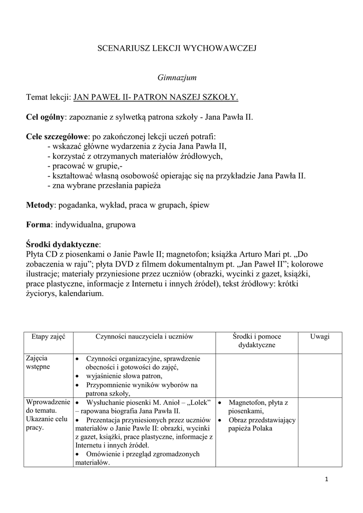 SCENARIUSZ LEKCJI WYCHOWAWCZEJ Gimnazjum Temat lekcji: JAN PAWEŁ II- PATRON NASZEJ SZKOŁY. Cel ogólny: zapoznanie z sylwetką patrona szkoły - Jana Pawła II. Cele szczegółowe: po zakończonej lekcji uczeń potrafi: - wskazać główne wydarzenia z życia Jana Pawła II, - korzystać z otrzymanych materiałów źródłowych, - pracować w grupie,- kształtować własną osobowość opierając się na przykładzie Jana Pawła II. - zna wybrane przesłania papieża Metody: pogadanka, wykład, praca w grupach, śpiew Forma: indywidualna, grupowa Środki dydaktyczne: Płyta CD z piosenkami o Janie Pawle II; magnetofon; książka Arturo Mari pt. „Do zobaczenia w raju”; płyta DVD z filmem dokumentalnym pt. „Jan Paweł II”; kolorowe ilustracje; materiały przyniesione przez uczniów (obrazki, wycinki z gazet, książki, prace plastyczne, informacje z Internetu i innych źródeł), tekst źródłowy: krótki życiorys, kalendarium. Etapy zajęć Zajęcia wstępne Czynności nauczyciela i uczniów Środki i pomoce dydaktyczne Uwagi Czynności organizacyjne, sprawdzenie obecności i gotowości do zajęć, wyjaśnienie słowa patron, Przypomnienie wyników wyborów na patrona szkoły, Wprowadzenie Wysłuchanie piosenki M. Anioł – „Lolek” Magnetofon, płyta z do tematu. – rapowana biografia Jana Pawła II. piosenkami, Ukazanie celu Prezentacja przyniesionych przez uczniów Obraz przedstawiający pracy. materiałów o Janie Pawle II: obrazki, wycinki papieża Polaka z gazet, książki, prace plastyczne, informacje z Internetu i innych źródeł. Omówienie i przegląd zgromadzonych materiałów. 1 Praca poznawcza – Praca z tekstem źródłowym Rozmowa kierowana na podstawie poznanych tekstów Utrwalenie Zakończenie Nauczyciel streszcza najważniejsze wydarzenia z życia Karola Wojtyły: - lata młodzieńcze w Wadowicach i w Krakowie; - pierwsze lata kapłaństwa; - sakra biskupia; - powołanie na Stolicę Piotrową; - pontyfikat Jana Pawła II, - podróże apostolskie, - nauczanie. Nauczyciel zadaje pytania dotyczące życia i dokonań papieża, objaśnia niezrozumiałe kwestie, uczniowie odpowiadają: - kim jest papież i gdzie mieszka, - gdzie urodził się Karol Wojtyła, - co to jest pontyfikat i ile trwał pontyfikat Jana Pawła II, - gdzie i po co odbywał podróże apostolskie papież Polak, - kiedy umarł Jan Paweł II. Praca w grupach - kalendarium, uzupełnianie tekstu luk, podsumowanie i ocena wykonanych prac. Wspólny śpiew piosenki: „Barka”. Fragm. filmu dokumentalnego pt. „Jan Paweł II”, Fragm. książki A. Mari pt. „Do zobaczenia w raju”, Krzyżówka, Plakat herbu papieskiego, kalendarium, Tekst luk Tekst obliczanka. Magnetofon, płyta CD z podkładem Załączniki dostosowane do poziomu i potrzeb edukacyjnych uczniów (wg uznania nauczyciela): 1. Życiorys Karola Wojtyły, 2. fragm. książki A. Mari, „Do zobaczenia w raju”, 3. Krzyżówka, 4. Tekst luk, 5. Tekst obliczanka Opracowała: Grażyna Janowicz 2 1. ŻYCIORYS... Jan Paweł II (łac. Ioannes Paulus II) - wł. Karol Józef Wojtyła. Urodzony 18 maja 1920 w Wadowicach. Syn Karola Wojtyły i Emilii z Kaczorowskich. Karol Wojtyła ochrzczony został dnia 20 czerwca 1920. Był chłopcem bardzo utalentowanym i wysportowanym. Regularnie grał w piłkę nożną oraz jeździł na nartach. Bardzo ważnym elementem życia Karola były wycieczki krajoznawcze, a także spacery po okolicy Wadowic. Jego matka zmarła 13 kwietnia 1929 roku, w wieku 45 lat. Trzy lata później, w 1932 r., zmarł na szkarlatynę w wieku 26 lat brat Edmund Od września 1930 roku Karol Wojtyła rozpoczął naukę w 8-letnim Państwowym Gimnazjum Męskim im. Marcina Wadowity w Wadowicach. W pierwszej klasie zachęcony przez ks. Kazimierza Figlewicza K.W. przystąpił do kółka ministranckiego, którego stał się prezesem. Podczas nauki w gimnazjum Karol zainteresował się teatrem. 14 maja 1938 Karol Wojtyła zakończył naukę w gimnazjum otrzymując świadectwo maturalne z oceną celującą. Następnie Karol Wojtyła rozpoczął studia w październiku 1938 roku - Wydział Filozoficzny Uniwersytetu Jagiellońskiego. Dnia 18 lutego 1941 roku po długiej chorobie zmarł jego ojciec. Wybuch wojny odebrała Karolowi Wojtyle możliwość kontynuowania studiów. Jesienią roku 1941 Karol wraz z przyjaciółmi założył Teatr Rapsodyczny, który swoje pierwsze przedstawienie wystawił 1 listopada 1941. Rozstanie Wojtyły z teatrem nastąpiło nagle w roku 1942, gdy postanowił on studiować teologię i wstąpił do tajnego Metropolitalnego Seminarium Duchownego w Krakowie gdzie 1 listopada 1946 otrzymał święcenia kapłańskie. W tym samym czasie rozpoczął w konspiracji studia na Wydziale Teologicznym Uniwersytetu Jagiellońskiego. W okresie od kwietnia 1945 do sierpnia 1946 roku Karol Wojtyła pracował na uczelni jako asystent i prowadził seminaria z historii dogmatu. 1 listopada 1946 roku kardynał Adam Stefan Sapieha wyświęcił Karola Wojtyłę na księdza. 15 listopada Karol Wojtyła wraz z klerykiem Stanisławem Starowieyskim poprzez Paryż wyjechał do Rzymu, aby kontynuować studia na uczelni Instituto Internazionale Angelicum. W roku 1958 Karol Wojtyła został mianowany biskupem tytularnym Ombrii, a także biskupem pomocniczym Krakowa. Na okres biskupstwa Karola Wojtyły przypadły także obrady Soboru Watykańskiego II, w których aktywnie uczestniczył. 30 grudnia 1963, półtora roku po śmierci swego poprzednika, arcybiskupa Eugeniusza Baziaka, Karol Wojtyła został mianowany arcybiskupem metropolitą krakowskim. Na zwołanym po śmierci Jana Pawła I drugim konklawe w roku 1978 Wojtyła został wybrany na papieża i przybrał imię Jana Pawła II. Wynik wyboru ogłoszono 16 października o 16:16. od 16 października 1978 do 2 kwietnia 2005 – papież. Jan Paweł II Był papieżem przez 26 i pół roku (9666 dni), beatyfikował i kanonizował o wiele więcej osób niż jakikolwiek poprzedni papież. 