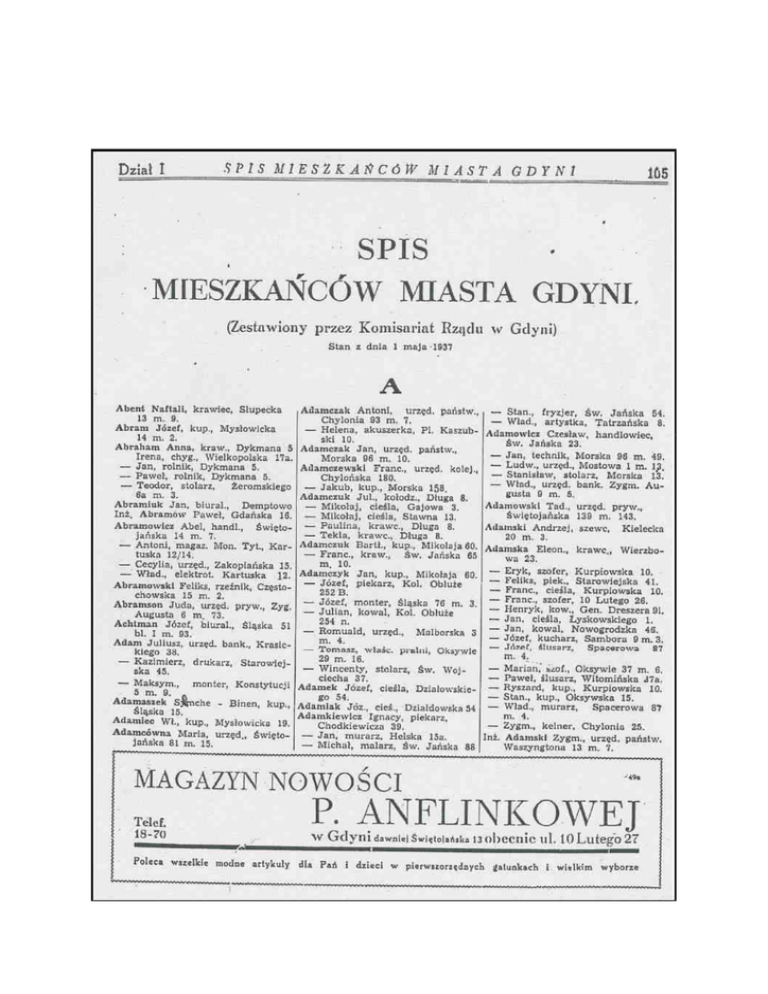 A 1. 2. 3. 4. 5. 6. 7. 8. 9. 10. 11. 12. 13. 14. 15. 16. 17. 18. 19. 20. 21. 22. 23. 24. 25. 26. 27. 28. 29. 30. 31. 32. 33. 34. 35. 36. 37. 38. 39. 40. 41. 42. 43. 44. 45. Abent Abraham Abraham Abraham Abraham Abraham Abram Abramiuk Abramow Abramowicz Abramowicz Abramowicz Abramowicz Abramowski Abramski Abramson Achtman Adam Adam Adam Adamaszek Adamcówna Adamczak Adamczak Adamczak Adamczewski Adamczewski Adamczuk Adamczuk Adamczuk Adamczuk Adamczuk Adamczuk Adamczuk Adamczyk Adamczyk Adamczyk Adamczyk Adamczyk Adamczyk Adamczyk Adamek Adamiak Adamiec Adamkiewicz Naftali Anna Irena Jan Paweł Teodor Józef Jan Paweł Abel Antoni Cecylia Władysław Feliks Leon Juda Józef Juliusz Kazimierz Maksymilian Symche-Binen Maria Antoni Helena Jan Franciszek Jakub Bartłomiej Franciszek Julian Mikołaj Mikołaj Paulina Tekla Jan Józef Józef Julian Romuald Tomasz Wincenty Józef Józef Władysław Ignacy Słupecka 13 m. 9 Dickmana 5 Wielkopolska 17a Dickmana 5 Dickmana 5 Żeromskiego 6a m. 3 Mysłowicka 14 m. 2 Demptowo Gdańska 16 Świętojańska 14 m. 7 Kartuska 12 m. 14 Zakopiańska 15 Kartuska 12 Częstochowska 15 m. 2 Turystyczna 6 m. 7 Zygmunta Augusta 6 m. 73 Śląska 51 bl I m. 93 Krasickiego 38 Starowiejska 45 Plac Konstytucji 5 m. 9 Śląska 15 Świętojańska 81 m. 15 Chylonia 93 m. 7 Plac Kaszubski 10 Morska 96 m. 10 Chylońska 180 Morska 158 Mikołaja 60 Świętojańska 65 m. 10 Długa 8 Gajowa 3 Stawna 13 Długa 8 Długa 8 Mikołaja 60 Kolonia Obłuska 252b Śląska 76 m. 3 Kolonia Obłuska 254n Malborska 3 m. 4 Oksywie 29 m. 16 Św. Wojciecha 37 Działowskiego 54 Działdowska 54 Mysłowicka 19 Chodkiewicza 39 krawiec krawcowa higienistka rolnik rolnik stolarz kupiec biuralista inżynier handlowiec magazynier urzędniczka elektrotechnik rzeźnik kupiec urzędnik pryw. biuralista urzędnik bankowy drukarz monter kupiec urzędniczka urzędnik państwowy akuszerka urzędnik państwowy urzędnik kolejowy kupiec kupiec krawiec kołodziej cieśla cieśla krawcowa krawcowa kupiec piekarz monter kowal urzędnik właściciel pralni stolarz cieśla cieśla kupiec piekarz 46. 47. 48. 49. 50. 51. 52. 53. 54. 55. 56. 57. 58. 59. 60. 61. 62. 63. 64. 65. 66. 67. 68. 69. 70. 71. 72. 73. 74. 75. 76. 77. 78. 79. 80. 81. 82. 83. 84. 85. 86. 87. 88. 89. 90. 91. 92. Adamkiewicz Adamkiewicz Adamkiewicz Adamkiewicz Adamowicz Adamowicz Adamowicz Adamowicz Adamowicz Adamowski Adamska Adamski Adamski Adamski Adamski Adamski Adamski Adamski Adamski Adamski Adamski Adamski Adamski Adamski Adamski Adamski Adamski Adamski Adler Adler Adler Adler Adrian Adrian Adrianówna Adryanów Adrych Adwentowicz Afeltowicz Agatowski Ajzenberg Ajzensztok Albanowski Albertin Albin Albiński Albiński Jan Michał Stanisław Władysława Czesław Jan Ludwik Stanisław Władysław Tadeusz Eleonora Andrzej Eryk Feliks Franciszek Franciszek Henryk Jan Jan Józef Józef Marian Paweł Ryszard Stanisław Władysław Zygmunt Zygmunt Edward Fritz Georg Gotfryd Jan Jan Waleria Eugeniusz Anastazy Janina Henryk Antoni Icek Belia Stanisław Teodor Roman Edward Leon Helska 15a Świętojańska 88 Świętojańska 54 Tatrzańska 8 Świętojańska 23 Morska 96 m. 49 Mostowa 1 m. 13 Morska 13 Zygmunta Augusta 9 m. 5 Świętojańska 139 m. 143 Wierzbowa 23 Kielecka 20 m. 3 Kurpiowska 10 Starowiejska 41 Kurpiowska 10 10 Lutego 26 Gen. Orlicz-Dreszera 9i Łyskowskiego 1 Nowogrodzka 46 Sambora 9 m. 3 Spacerowa 87 m. 4 Oksywie 37 m. 6 Witomińka 37a Kurpiowska 10 Oksywska 15 Spacerowa 87 m. 4 Chylonia 25 Waszyngtona 13 m. 7 Orłowska 17 Orłowska 17 Orłowska 12 Orłowska 12 Nowogrodzka 2 1 m. 6 Kolonia Obłuska 227 Śląska 51 bl. I m. 67 Kilińskiego 12 m. 6 Dembińskiego 154a Sienkiewicza 2 Folwarczna 12 Śląska 33 m. 55 Abrahama 20 m. 3 Władysława IV 23 m. 34 Olsztyńska 34 Śląska 51 bl. III m. 118 Łączna 4a Słupecka 28 Kurpiowska 25a murarz malarz fryzjer artystka handlowiec technik urzędnik stolarz urzędnik bankowy urzędnik pryw. krawcowa szewc szofer piekarz cieśla szofer kowal cieśla kowal kucharz ślusarz szofer ślusarz kupiec kupiec murarz kelner urzędnik państwowy rybak rybak cukiernik piekarz ślusarz krawcowa krawcowa elektrotechnik czeladnik kowalski artystka dramatyczna ogrodnik urzędnik kolejowy krawiec kupiec rolnik technik elektromonter rewizor ks. handlowych kowal 93. 94. 95. 96. 97. 98. 99. 100. 101. 102. 103. 104. 105. 106. 107. 108. 109. 110. 111. 112. 113. 114. 115. 116. 117. 118. 119. 120. 121. 122. 123. 124. 125. 126. 127. 128. 129. 130. 131. 132. 133. 134. 135. 136. 137. 138. 139. Albrecht Alejski Aleksandczak Aleksandrowicz Aleksandrów Alfanas Alfuth Alfuth Alfuth Alfuth Allen Allweil Alper Alwast Ałaszewski Ałaszewski Ałunowski Ambros Ambros Ambroszczyk Ambroziewicz Amernik Amernik Ananjew Ancer Anczykowski Andersz Andersz Andrecki Androwicz Andruszkiewicz Andruszkiewicz Andryjaszew Andrykowski Andrys Andrzejczak Andrzejczak Andrzejewska Andrzejewski Andrzejewski Andrzejewski Andrzejewski Andrzejewski Andrzejewski Andrzejewski Andrzejewski Andrzejewski Edmund Zygmunt Feliks Brunon Jerzy Mikołaj Bernard Franciszek Franciszek Wacław Robert Leon Aleksander Wacław Józef Walerian Jan Krystyna Witold Wojciech Aleksander Antoni Józef Jan Hana Antoni Józef Stanisław Franciszek Stefan Kazimierz Zygmunt Walenty Jan Stefan Tomasz Walenty Elżbieta Adam Alfons Alojzy Aniela Feliks Florian Franciszek Jan Leon Długa 27 Zygmunta Augusta 9 m. 19 Głogowska 7 Portowa 8 Abrahama 105 Witomińska 2 10 Lutego 25 m. 8 Leśna 3 Śląska 60 m. 6 Świętojańska 102 Olsztyńska 35 m. 5 Centralna 7 Miernicza 12 Hetmańska 14 Kalksteinów 12 m. 6 Działowskiego 19 m. 4 Wiklinowa 36 10 Lutego 13 Leśna 5 m. 8 Świętojańska 136 Witomińska 33 Pomorska 59 l Niemojewskiego 22 Gen. Zarzyckiego 22 Świętojańska 77 m. 10 Czereśniowa 2 m. 6 Kolonia Obłuska 237i Śląska 54 m. 5 Kasprowicza 15 Błękitna 12 Olsztyńska 36 m. 3 Śląska 51 m. 1 Centralna 9a Wrocławska 65 Śląska 51 bl. I m. 63 Lotników 60 Wąska 22 Łowic