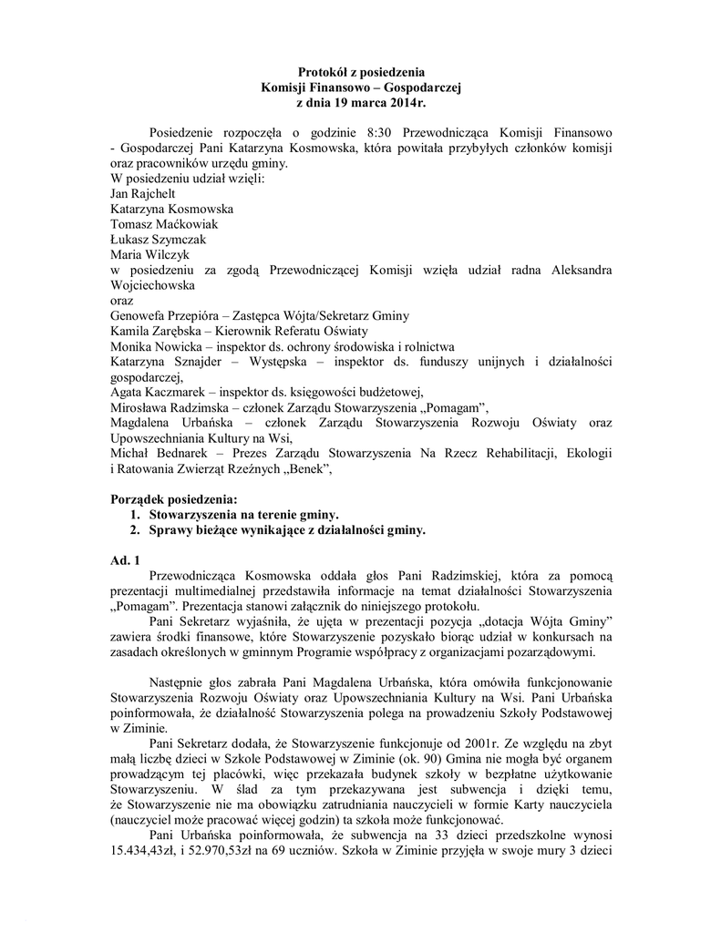 Protokół z posiedzenia Komisji Finansowo – Gospodarczej z dnia 19 marca 2014r. Posiedzenie rozpoczęła o godzinie 8:30 Przewodnicząca Komisji Finansowo - Gospodarczej Pani Katarzyna Kosmowska, która powitała przybyłych członków komisji oraz pracowników urzędu gminy. W posiedzeniu udział wzięli: Jan Rajchelt Katarzyna Kosmowska Tomasz Maćkowiak Łukasz Szymczak Maria Wilczyk w posiedzeniu za zgodą Przewodniczącej Komisji wzięła udział radna Aleksandra Wojciechowska oraz Genowefa Przepióra – Zastępca Wójta/Sekretarz Gminy Kamila Zarębska – Kierownik Referatu Oświaty Monika Nowicka – inspektor ds. ochrony środowiska i rolnictwa Katarzyna Sznajder – Występska – inspektor ds. funduszy unijnych i działalności gospodarczej, Agata Kaczmarek – inspektor ds. księgowości budżetowej, Mirosława Radzimska – członek Zarządu Stowarzyszenia „Pomagam”, Magdalena Urbańska – członek Zarządu Stowarzyszenia Rozwoju Oświaty oraz Upowszechniania Kultury na Wsi, Michał Bednarek – Prezes Zarządu Stowarzyszenia Na Rzecz Rehabilitacji, Ekologii i Ratowania Zwierząt Rzeźnych „Benek”, Porządek posiedzenia: 1. Stowarzyszenia na terenie gminy. 2. Sprawy bieżące wynikające z działalności gminy. Ad. 1 Przewodnicząca Kosmowska oddała głos Pani Radzimskiej, która za pomocą prezentacji multimedialnej przedstawiła informacje na temat działalności Stowarzyszenia „Pomagam”. Prezentacja stanowi załącznik do niniejszego protokołu. Pani Sekretarz wyjaśniła, że ujęta w prezentacji pozycja „dotacja Wójta Gminy” zawiera środki finansowe, które Stowarzyszenie pozyskało biorąc udział w konkursach na zasadach określonych w gminnym Programie współpracy z organizacjami pozarządowymi. Następnie głos zabrała Pani Magdalena Urbańska, która omówiła funkcjonowanie Stowarzyszenia Rozwoju Oświaty oraz Upowszechniania Kultury na Wsi. Pani Urbańska poinformowała, że działalność Stowarzyszenia polega na prowadzeniu Szkoły Podstawowej w Ziminie. Pani Sekretarz dodała, że Stowarzyszenie funkcjonuje od 2001r. Ze względu na zbyt małą liczbę dzieci w Szkole Podstawowej w Ziminie (ok. 90) Gmina nie mogła być organem prowadzącym tej placówki, więc przekazała budynek szkoły w bezpłatne użytkowanie Stowarzyszeniu. W ślad za tym przekazywana jest subwencja i dzięki temu, że Stowarzyszenie nie ma obowiązku zatrudniania nauczycieli w formie Karty nauczyciela (nauczyciel może pracować więcej godzin) ta szkoła może funkcjonować. Pani Urbańska poinformowała, że subwencja na 33 dzieci przedszkolne wynosi 15.434,43zł, i 52.970,53zł na 69 uczniów. Szkoła w Ziminie przyjęła w swoje mury 3 dzieci z orzeczeniem niepełnosprawności, 1 dziecko z dziecięcym porażeniem mózgowym. Pani Urbańska zaznaczyła, że przeszkodą przyjęcia do szkoły dziecka z niepełnosprawnością ruchową są bariery architektoniczne. Pani Sekretarz zauważyła, że subwencja przekazywana na dziecko niepełnosprawne jest wyższa, ale jest to też duża odpowiedzialność, należy bowiem spełniać odpowiednie wymagania, aby dziecko miało wszystko czego potrzebuje. Radna Kosmowska zauważyła, że przyjmowanie do szkoły dzieci niepełnosprawnych ruchowo wymagałoby dostosowania toalet, drzwi, czy wykonania podjazdów. Pani Urbańska poinformowała, że w przypadku oddziałów przedszkolnych liczba zgłaszanych dzieci przekracza możliwości szkoły. W związku z tym planuje się przeniesienie sali komputerowej do dolnej części szkoły, a w jej miejscu utworzenie kolejnej sali przedszkolnej. Planuje się także powstanie świetlicy szkolnej jako odpowiedź na zapotrzebowanie zgłaszane przez rodziców. Pani Urbańska podkreśliła ogromne zaangażowanie społeczności lokalnej w utworzenie, a następnie utrzymanie szkoły w Ziminie. Szkoła ma zatem nie tylko wymiar oświatowy, ale i sentymentalny dla części mieszkańców gminy. Pani Sekretarz podkreśliła także kulturalny wymiar szkoły dla miejscowości Zimin, oraz poinformowała, że Gmina bezpłatnie dowozi dzieci do tej placówki, stworzyła boisko na terenie Zimina, oraz salę do nauki języków obcych. Pani Urbańska stwierdziła, że organizacja szkoły w znacznej mierze uzależniona jest od komunikacji gminnej. Pani Sekretarz zapewniła, że potrzeby szkoły w Ziminie brane są pod uwagę przy konstruowaniu nowego rozkładu jazdy autobusów komunikacji gminnej. Przedstawicielka Stowarzyszenia podkreśliła bardzo dobrą współpracę z władzami gminy oraz z rodzicami uczniów. Pani Urbańska przedstawiła wysokość tegorocznych wpływów finansowych Stowarzyszenia na dzień 28 lutego 2014r.: - działalność własna 19.839,24zł, - składki członkowskie 4.500zł, - darowizny 234zł. Pani Sekretarz nadmieniła, że szkoła w Ziminie podjęła bardzo ciekawy projekt „Z małej szkoły w wielki świat”. Radna Kosmowska zapytała z czego wynikał gwałtowny spadek poziomu nauczania, który widoczny był w zestawieniach przedstawionych przez Kierownika Referatu Oświaty podczas Sesji Rady Gminy Kleszczewo w dniu 4 września 2013r. Pani Urbańska wyjaśniła, że w ubiegłym roku w wyniku stwierdzonych podczas kontroli nieprawidłowości doszło do zmiany Zarządu Stowarzyszenia, a zawirowania w prowadzeniu placówki za kadencji poprzednich władz odbiły się negatywnie na wynikach dzieci. Pani Urbańska podkreśliła, że 4 członków obecnego Zarządu to ludzie nie związani z placówką oświatową, którzy dopiero wdrażają się w funkcjonowanie szkoły. Pani Sekretarz zapytała czy poprzedni pedagodzy nie realizowali ramy programowej? Pani Urbańska wyjaśniła, że brakowało odpowiedniej kontroli. Obecnie placówką kieruje nowy dyrektor, oraz powołana została Komisja Rewizyjna w składzie: Ewa Lesińska, Maria Wilczyk, Agnieszka Piskorska, Małgorzata Ruszała. Pani Urbańska stwierdziła, że w okresie wakacyjnym szkołę czekają prace remontowe związane