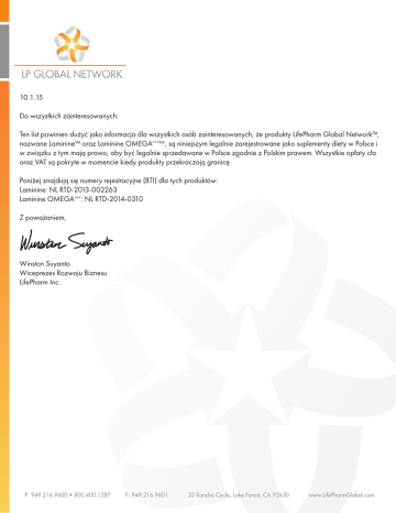10.1.15 Do wszystkich zainteresowanych: Ten list powinien służyć jako informacja dla wszystkich osób zainteresowanych, że produkty LifePharm Global Network™, nazwane Laminine™ oraz Laminine OMEGA+++™, są niniejszym legalnie zarejestrowane jako suplementy diety w Polsce i w związku z tym mają prawo, aby być legalnie sprzedawane w Polsce zgodnie z Polskim prawem. Wszystkie opłaty cła oraz VAT są pokryte w momencie kiedy produkty przekraczają granicę. Poniżej znajdują się numery rejestracyjne (BTI) dla tych produktów: Laminine: NL RTD-2013-002263 Laminine OMEGA+++: NL RTD-2014-0310 Z poważaniem, Winston Suyanto Wiceprezes Rozwoju Biznesu LifePharm Inc. P: 949.216.9600 • 800.400.1287 F: 949.216.9601 32 Rancho Circle, Lake Forest, CA 92630 www.LifePharmGlobal.com