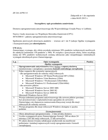 ZP.341-4/PW/15 Załącznik nr 1 do zapytania z dnia 04.05.2015 r. Szczegółowy opis przedmiotu zamówienia Dostawa oprogramowania antywirusowego dla Wojewódzkiego Urzędu Pracy w Lublinie. Nazwy i kody stosowane we Wspólnym Słowniku Zamówień (CPV): 48761000-0 – pakiety oprogramowania antywirusowego Spełnienie pierwszych dziewięciu punktów – wiersze od 1 do 9 (sekcje Ogólne wymagania i licencjonowanie) jest obowiązkowe. UWAGA: Zamawiający wymaga, aby oferta uzyskała minimum 50% punktów technicznych możliwych do zdobycia (minimum 150 punktów z 300). W związku z powyższym oferty, które uzyskają mniej niż 50% punktów technicznych zostaną odrzucone jako niespełniające minimalnych wymagań określonych przez Zamawiającego. L.p. 1. 2. 3. 4. 5. 6. 7. Opis wymagania Ogólne wymagania Oprogramowanie antywirusowe klasy biznes z zaporą sieciową monitorowane i zarządzane z poziomu konsoli centralnego zarządzania Pełne wsparcie dla systemów operacyjnych: - dla oprogramowania do ochrony stacji roboczych: Microsoft Windows XP Home/Professional SP3 (32bit) Microsoft Windows Vista Business (32bit) Microsoft Windows 7 Professional (32bit/64bit) Microsoft Windows 8.1 Professional (32bit/64bit) - dla serwerów plików: Microsoft Windows Server 2003 SBS Microsoft Windows Server 2003 R2 Microsoft Windows Server 2008 R2 Microsoft Windows Server 2012 Wersja (odmiana) programu antywirusowego dla serwera plików powinna być przystosowana i zoptymalizowana specjalnie do serwerów. Zamawiający nie dopuszcza zastosowania klasycznej wersji dla stacji roboczych do ochrony serwera. Wersja programu dla stacji roboczych Windows dostępna w języku polskim Licencjonowanie Okres aktualizacji oprogramowania – 2 lata od daty dostawy Liczba wymaganych przez Zamawiającego licencji: 300 na okres 24 miesięcy (285 dla stacji roboczych, 15 dla serwerów) W całym okresie trwania subskrypcji użytkownik ma możliwość pobierania i instalacji najnowszych wersji oprogramowania i konsoli zarządzającej. Punkty - - - - L.p. 8. 9. 10. 11. 12. 13. 14. 15. 16. 17. 18. 19. 20. 21. 22. 23. 24. 25. 26. Opis wymagania W razie konieczności producent ma obowiązek dostarczyć nowe klucze licencyjne, jeśli dotychczasowe nie będą zgodne z nową wersją programu mimo ważnej licencji. Wsparcie techniczne W całym okresie trwania subskrypcji użytkownik ma prawo do korzystania z bezpłatnej pomocy technicznej świadczonej za pośrednictwem telefonu i poczty elektronicznej, realizowanej w języku polskim przez producenta programu lub autoryzowanego dystrybutora. Informacja o dotychczas stosowanym rozwiązaniu Zamawiający korzystał z oprogramowania AVG Internet Security Business Edition (300 licencji) Ochrona antywirusowa stacji roboczych Ochrona przed wirusami, robakami, trojanami i innymi zagrożeniami Wykrywanie i usuwanie niebezpiecznych aplikacji typu botnet, malware, adware, spyware, dialer, narzędzi hakerskich itp. Wbudowana ochrona przed rootkitami Heurystyczna technologia do wykrywania nowych, nieznanych zagrożeń Ochrona przed złośliwym kodem na stronach WWW (np. Java, ActiveX, PHP). Monitor antywirusowy uruchamiany automatycznie w momencie startu systemu operacyjnego komputera działający nieprzerwanie do momentu zamknięcia systemu operacyjnego. Skanowanie w czasie rzeczywistym otwieranych, zapisywanych i wykonywanych plików Możliwość skanowania całego dysku, wybranych katalogów lub pojedynczych plików "na żądanie" lub według harmonogramu Skanowanie "na żądanie" pojedynczych plików lub katalogów przy pomocy skrótu w menu kontekstowym System ma oferować administratorowi możliwość definiowania zadań w harmonogramie w taki sposób, aby zadanie przed wykonaniem sprawdzało czy komputer pracuje na zasilaniu bateryjnym i jeśli tak – nie wykonywało danego zadania Możliwość wywoływania skanowania po określonym czasie bezczynności komputera Możliwość ręcznego określenia dozwolonego użycia zasobów systemowych (np. niskie, średnie, wysokie) podczas skanowania „na żądanie” i według harmonogramu Możliwość dynamicznej zmiany użycia zasobów systemowych w zależności od obciążenia systemu przez aplikacje użytkownika Wbudowany moduł skanujący protokoły POP3, SMTP, IMAP niezależnie od klienta pocztowego Skaner poczty może działać też jako dodatek aplikacji poczty e-mail (w szczególności programu Microsoft Outlook) Wbudowany moduł skanujący ruch HTTP w czasie rzeczywistym niezależnie od przeglądarki Punkty - - nie dotyczy 2 2 2 2 2 2 2 2 2 2 1 2 2 2 2 2 2 L.p. 27. 28. 29. 30. 31. 32. 33. 34. 35. 36. 37. 38. 39. 40. 41. 42. 43. 44. 45. Opis wymagania Program ma umożliwiać skanowanie ruchu sieciowego wewnątrz szyfrowanych protokołów HTTPS, POP3S, IMAPS Skaner poczty powinien mieć możliwość zmiany nazwy lub usuwania określonych typów załączników Wbudowany moduł skanujący ruch popularnych komunikatorów internetowych Możliwość skanowania dysków sieciowych i dysków przenośnych Skanowanie plików spakowanych i skompresowanych Skanowanie archiwów i plików spakowanych niezależnie od poziomu ich zagnieżdżenia W momencie podłączenia zewnętrznego nośnika aplikacja musi umożliwić natychmiastowe przeskanowanie całej zawartości podłączanego nośnika W przypadku wykrycia wirusa program może automatycznie podejmować zalecane działanie, w tym: próbować leczyć, a jeżeli nie jest to możliwe usuwać obiekt rejestrować w dzienniku informację o wykryciu wirusa poddać kwarantannie podejrzany obiekt wysłanie e-maila do administratora Możliwość umieszczenia na liście wyłączeń ze skanowania wybranych plików, katalogów lub plików o określonych rozszerzeniach Możliwość automatycznego wyłączenia komputera po zakończonym skanowaniu Możliwość tymczasowego wyłączenia ochrony na pewien czas (np. 10 minut) Możliwość tymczasowego wyłączenia ochrony na pewien czas do ponownego uruchomienia komputer