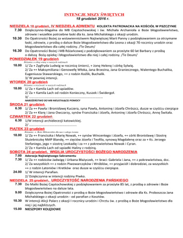 INTENCJE MSZY ŚWIĘTYCH 18 grudzień 2016 r. NIEDZIELA 18 grudzień, IV NIEDZIELA ADWENTU KOLEKTA PATRONACKA NA KOŚCIÓŁ W PSZCZYNIE 7.30 Dziękczynno-błagalna do MB Częstochowskiej i św. Michała Archanioła o Boże błogosławieństwo, zdrowie i wszelkie potrzebne łaski dla ks. Jana Michalskiego z okazji urodzin. 10.30 Do Opatrzności Bożej za wstawiennictwem Najświętszej Marii Panny z podziękowaniem za otrzymane łaski, zdrowie, z prośbą o dalsze Boże błogosławieństwo dla Leona z okazji 70 rocznicy urodzin oraz błogosławieństwo dla całej rodziny. /Te Deum/ 16.30 Do Opatrzności Bożej i MB Różańcowej z podziękowaniem za przeżyte 60 lat Barbary z prośbą o dalszą Bożą opiekę i błogosławieństwo dla niej i całej rodziny. /Te Deum/ PONIEDZIAŁEK 19 grudzień Różaniec o silną wiarę w naszych rodzinach 18.00 1/ Za + Zygfryda Ludwig w rocznicę śmierci, + żonę Helenę i córkę Sylwię. 2/ Za ++ Maksymiliana i Genowefę Włoka, Jana Brzezina, Jana Graniecznego, Walentego Buchalika, Eugeniusza Stawarskiego, ++ z rodzin Koźlik, Buchalik. 3/ W pewniej intencji. WTOREK 20 grudzień Różaniec o trzeźwość w naszych rodzinach 18.00 1/ Za + Kamila Lach od sąsiadów. 2/ Za + Kamila Lach od rodzin Konieczny, Kuszek i Świdergoł. 3/ …………………………………………………………………………… NABOŻEŃSTWO DO MB NIEUSTAJĄCEJ POMOCY ŚRODA 21 grudzień 6.30 1/ Za ++ Pawła i Bronisławę Kuczera, syna Pawła, Antoninę i Józefa Chrószcz, dusze w czyśćcu cierpiące 2/ Za ++ Klarę i Jana Owczarzy, synów Franciszka i Józefa, Antoninę i Józefa Chrószcz, Annę Świtała. CZWARTEK 22 grudzień 6.30 1/W intencji archidiecezji katowickiej. 2/ ……………………………………………….. PIĄTEK 23 grudzień Różaniec o Boże Miłosierdzie dla nas i całego świata 18.00 1/ Za ++ Franciszka i Marię Nowak, ++ synów Wincentego i Józefa, ++ córki Bronisławę i Siostrę Służebniczkę NMP Blandę, ++ zięciów Józefa i Teofila, synową Magdalenę oraz za + Ks. Jerzego Stefaniego, jego + siostrę Leokadię i za ++ z pokrewieństwa Nowak i Cyran. 2/ Za + Kamila Lach od sąsiadki Haliny z rodziną. SOBOTA 24 grudzień, WIGILIA UROCZYSTOŚCI BOŻEGO NARODZENIA 7.00 Adoracja Najświętszego Sakramentu 7.30 1/ Za ++ rodziców Jadwigę i Urbana Błażyczek, ++ braci: Gabriela i Jana, ++ z pokrewieństwa, dcc. 2/ Za wszystkich ++ z rodzin Piwowarczyków i Wróblów, ++ przyjaciół i dobrodziei, za wszystkich ++ z rodzin Latoniów i Kretków oraz dusze w czyśćcu cierpiące. 24.00 1/ W intencji Parafian. 2/ Dziękczynna w intencji rodziny Piwko. NIEDZIELA 25 grudzień, UROCZYSTOŚĆ NARODZENIA PAŃSKIEGO 7.30 Do Matki Bożej Częstochowskiej z podziękowaniem za przeżyte 85 lat, z prośbą o zdrowie i Boże błogosławieństwo na dalsze lata. 9.00 Dziękczynna Bożej Opatrzności z prośbą o Boże błogosławieństwo i zdrowie dla Ks. Proboszcza Jana Michalskiego z okazji urodzin - od parafian z Kosztów. 10.30 W intencji Alicji Palarz z okazji I rocznicy urodzin i Chrztu św. z prośbą o Boże błogosławieństwo dla niej i jej najbliższych. 15.00 NIESZPORY KOLĘDOWE OGŁOSZENIA DUSZPASTERSKIE IV NIEDZIELA ADWENTU 18 grudzień 2016 r. 1. Dziś IV Niedziela Adwentu. 2. Kolekta dzisiejsza przeznaczona jest na budowę kościoła w Pszczynie. Bóg zapłać za złożone ofiary. 3. Zapraszam na dzieci, młodzież i dorosłych na ostatnie msze święte roratnie w poniedziałek, wtorek i piątek o godz. 18.00; natomiast w środę i czwartek 6.30. 4. Zapraszam do budowania stajenki wszystkich chętnych: stałych twórców jak i wszystkich chętnych, jutro - 19 grudnia - od godziny 8.00. 5. Okazja do spowiedzi przed świętami: jest jak zawsze przynajmniej pół godziny przed Mszami świętymi i po jak długo będą wierni. Spowiedzi dzieci ze szkoły podstawowej i gimnazjum będzie we wtorek 20 grudnia od godz. 14.30 . Dzień spowiedzi dla dorosłych w czwartek 22 grudnia od 16.30. Będzie 6 kapłanów. 6. Odwiedziny chorych 23 grudnia od 7.30. Zgłoszenia chorych w zakrystii. 7. Zapraszam do prowadzenie różańca przed mszami Róże Różańcowe z Suminy. Dziękuję za Różanie w ubiegłym tygodniu. 8. W dzień Wigilii Bożego Narodzenia gromadzimy się przy wieczerzy wigilijnej. Sięgnijmy po tekst Pisma Świętego mówiący o narodzeniu Pana Jezusa. Odmawiając wspólnie modlitwę, miejmy w sercu łaskę Bożą. W Wigilię - tradycyjnie zachowajmy post. 9. Sołtysi zapraszają na tradycyjne wspólne kolędowanie przy kaplicach w Wigilię Bożego Narodzenia: w Suminie o 21.00 w Nowej Wsi o 20.30 w Bogunicach o 20.30 Zaproszenie kierowane jest do wszystkich mieszkańców! Niechaj nie zabraknie dzieci, młodzieży, dorosłych. Całych rodzin. 10. Zapraszam na Pasterkę składaną w intencji Parafian. Kolekta podczas Pasterki przeznaczona jest na Fundusz Obrony Życia. W drugie święto kolekta na Wydział Teologiczny Uniwersytetu Śląskiego. Bóg zapłać za złożone ofiary. 11. W Pierwsze Święto Bożego Narodzenia msze św. Pasterka o północy, następnie o 7.30, 9.00 i 10.30. O godzinie 15.00 zapraszam na Nieszpory kolędowe - zapraszam do kolędowania całe rodziny i waszych gości! 12. W drugi dzień Świąt przypada święto św. Szczepana, pierwszego męczennika. Msze św. o 7.30, 9.00 i 10.30. Podczas mszy św. poświęcenie owsa. 13. Kolędnicy Misyjni odwiedzą nasze domy 28 grudnia. Zapraszam dorosłych do włączenia w to dzieło misyjne jako opiekunowie grup. Zgłoszenia u Ks. Proboszcza lub Pań Katechetek. Rozesłanie kolędników będzie w święto św. Młodzianków, zaś podziękowanie z uroczystość Trzech Króli. 14. Zachęcam do czytania Gościa Niedzielnego, Apostolstwo Chorych, Miłujcie się!, „Droga” dla młodzieży, O`Losservatore Romano. 15. Dziękuję za przygotowanie kościoła do niedzieli. Zapraszam kolejną grupę Parafian. 16. Kolejny koncert „Betlejem w Spodku” będzie 29 g
