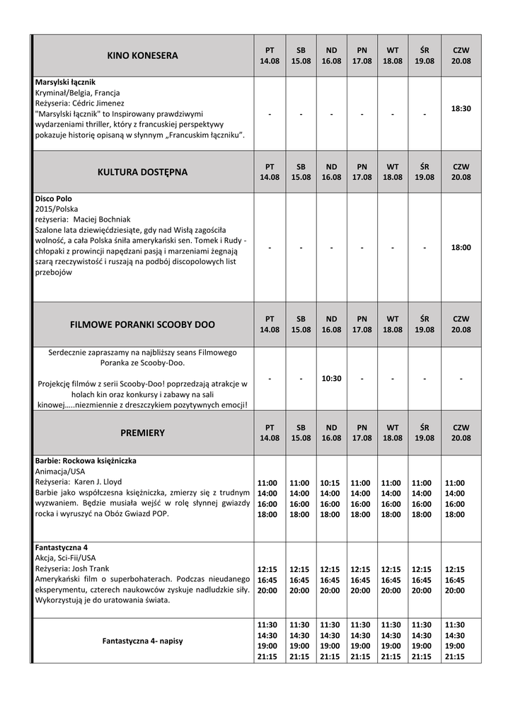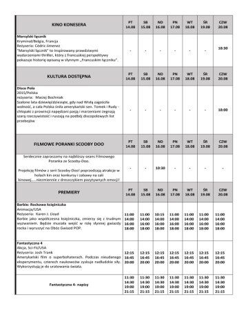 PT 14.08 SB 15.08 ND 16.08 PN 17.08 WT 18.08 ŚR 19.08 - - - - - - PT 14.08 SB 15.08 ND 16.08 PN 17.08 WT 18.08 ŚR 19.08 CZW 20.08 - - - - - - 18:00 PT 14.08 SB 15.08 ND 16.08 PN 17.08 WT 18.08 ŚR 19.08 CZW 20.08 - - 10:30 - - - - PREMIERY PT 14.08 SB 15.08 ND 16.08 PN 17.08 WT 18.08 ŚR 19.08 CZW 20.08 Barbie: Rockowa księżniczka Animacja/USA Reżyseria: Karen J. Lloyd Barbie jako współczesna księżniczka, zmierzy się z trudnym wyzwaniem. Będzie musiała wejść w rolę słynnej gwiazdy rocka i wyruszyć na Obóz Gwiazd POP. 11:00 14:00 16:00 18:00 11:00 14:00 16:00 18:00 10:15 14:00 16:00 18:00 11:00 14:00 16:00 18:00 11:00 14:00 16:00 18:00 11:00 14:00 16:00 18:00 11:00 14:00 16:00 18:00 12:15 16:45 20:00 12:15 16:45 20:00 12:15 16:45 20:00 12:15 16:45 20:00 12:15 16:45 20:00 12:15 16:45 20:00 11:30 14:30 19:00 21:15 11:30 14:30 19:00 21:15 11:30 14:30 19:00 21:15 11:30 14:30 19:00 21:15 11:30 14:30 19:00 21:15 11:30 14:30 19:00 21:15 KINO KONESERA Marsylski łącznik Kryminał/Belgia, Francja Reżyseria: Cédric Jimenez "Marsylski łącznik" to Inspirowany prawdziwymi wydarzeniami thriller, który z francuskiej perspektywy pokazuje historię opisaną w słynnym „Francuskim łączniku”. KULTURA DOSTĘPNA Disco Polo 2015/Polska reżyseria: Maciej Bochniak Szalone lata dziewięćdziesiąte, gdy nad Wisłą zagościła wolność, a cała Polska śniła amerykański sen. Tomek i Rudy chłopaki z prowincji napędzani pasją i marzeniami żegnają szarą rzeczywistość i ruszają na podbój discopolowych list przebojów FILMOWE PORANKI SCOOBY DOO CZW 20.08 18:30 Serdecznie zapraszamy na najbliższy seans Filmowego Poranka ze Scooby-Doo. Projekcję filmów z serii Scooby-Doo! poprzedzają atrakcje w holach kin oraz konkursy i zabawy na sali kinowej…..niezmiennie z dreszczykiem pozytywnych emocji! Fantastyczna 4 Akcja, Sci-Fii/USA Reżyseria: Josh Trank 12:15 Amerykański film o superbohaterach. Podczas nieudanego 16:45 eksperymentu, czterech naukowców zyskuje nadludzkie siły. 20:00 Wykorzystują je do uratowania świata. Fantastyczna 4- napisy 11:30 14:30 19:00 21:15 Nieracjonalny mężczyzna USA Reżyseria: Woody Allen Kolejny film Woody'ego Allena. Profesor filozofii z Rhode Island, spotyka się z jedną ze swoich studentek. Jego życie zaczyna się komplikować. Czego dusza zapragnie Komedia, Sci-Fi/USA Reżyseria: Terry Jones Neil Clark nauczyciel gimnazjum uczestniczy w eksperymencie przeprowadzonym przez obcych. W efekcie tego doświadczenia zostaje obdarzony magicznymi mocami. POZOSTAŁE TYTUŁY 12:00 16:30 18:45 21:00 12:00 16:30 18:45 21:00 12:00 16:30 18:45 21:00 12:00 16:30 18:45 21:00 12:00 16:30 18:45 21:00 12:00 16:30 18:45 21:00 12:00 16:30 18:45 21:00 13:00 15:00 19:30 13:00 15:00 19:30 13:00 15:00 19:30 13:00 15:00 19:30 13:00 15:00 19:30 13:00 15:00 19:30 13:00 15:00 19:30 PT 14.08 SB 15.08 ND 16.08 PN 17.08 WT 18.08 ŚR 19.08 CZW 20.08 10:00 12:30 15:00 18:30 10:00 12:30 15:00 18:30 10:00 12:30 15:00 18:30 10:00 12:30 15:00 18:30 10:00 12:30 15:00 18:30 10:00 12:30 15:00 18:30 10:00 12:30 15:00 17:00 17:00 17:00 17:00 17:00 17:00 17:00 10:15 13:00 17:30 20:15 10:15 13:00 17:30 20:15 10:15 13:00 17:30 20:15 10:15 13:00 17:30 20:15 10:15 13:00 17:30 20:15 10:15 13:00 17:30 20:15 10:15 13:00 17:30 20:15 10:45 15:45 20:45 10:45 15:45 20:45 10:45 15:45 20:45 10:45 15:45 20:45 10:45 15:45 20:45 10:45 15:45 20:45 10:45 15:45 20:45 10:00 10:00 10:00 10:00 10:00 10:00 10:00 Mały Książe Animacja/Francja reżyseria: Mark Osborne Kolejna próba adaptacji książki pt. „Mały Książę”. Film opowiada historię małej dziewczynki, która zaprzyjaźnia się ze staruszkiem z sąsiedztwa. Starszy przyjaciel opowiada jej o tajemniczym świecie, w którym wszystko jest możliwe. Dziewczynka rozpoczyna niezwykłą podróż do krainy wyobraźni. Mały Książę 3D Mission: Impossible 5 Sensacyjny/USA reżyseria: Christopher McQuarrie Film "Mission: Impossible 5", to piąta już część agenta IMF Ethana Hunta Tym razem zmierzy on się z organizacją Syndykat. Dar Dramat/USA reżyseria: Joel Edgerton Dramat opowiadający historię młodego małżeństwa. Simon i Robyn kupują wymarzony dom. Rozpoczynają nowe życie, a na świat za kilka miesięcy ma przyjść ich długo wyczekiwane dziecko. Przypadkowo w nowej okolicy spotykają dawnego przyjaciela Simona, od tego momentu co jakiś czas dostają drobne podarunki. Koko smoko Animacja/Niemcy reżyseria: Nina Wels Animacja o krainie smoków z której niespodziewanie znika wartościowa trawa ognista. Młody smok postanawia udowodnić wszystkim, że można na nim polegać. Postanawia odnaleźć znaczącą dla wioski rzecz. W głowie się nie mieści Animacja, Fantasy, Komedia Reżyseria: Pete Docter Animacja laureata Oscara Petera Docter w której 5 uczuć: Radość, Smutek, Odraza, Strach i Gniew przejmuje wnętrze ludzkiego umysłu, kierując życiem małej Riley. Papierowe miasta Dramat/USA reżyseria: Jake Schreier Młody, zakochany chłopak, wyrusza w podróż wraz z czterema przyjaciółmi aby znaleźć zbuntowaną koleżankę z sąsiedztwa. Wykolejona Komedia/ USA Reżyseria: Judd Apatow Historia młodej kobiety, którą wypełnia praca i bogate życie towarzyskie. Uważa, że mężczyźni są potrzebni tylko na jedną noc i nigdy na dłużej. Jej sposób bycia zmienia się gdy dostaje zlecenie dotyczące wywiadu ze znanym lekarzem. 10:00 14:15 10:00 14:15 14:15 10:00 14:15 10:00 14:15 10:00 14:15 10:00 14:15 13:15 18:15 13:15 18:15 13:15 18:15 13:15 18:15 13:15 18:15 13:15 18:15 13:15 15:45 21:00 15:45 21:00 15:45 21:00 15:45 21:00 15:45 21:00 15:45 21:00 15:45 21:00