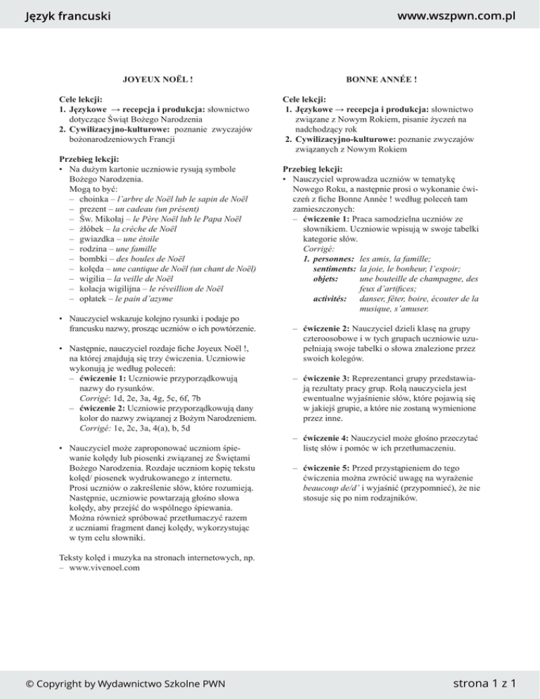www.wszpwn.com.pl JOYEUX NOËL ! Cele lekcji: 1. Językowe → recepcja i produkcja: słownictwo dotyczące Świąt Bożego Narodzenia 2. Cywilizacyjno-kulturowe: poznanie zwyczajów bożonarodzeniowych Francji Przebieg lekcji: • Na dużym kartonie uczniowie rysują symbole Bożego Narodzenia. Mogą to być: –– choinka – l’arbre de Noël lub le sapin de Noël –– prezent – un cadeau (un présent) –– Św. Mikołaj – le Père Noël lub le Papa Noël –– żłóbek – la crèche de Noël –– gwiazdka – une étoile –– rodzina – une famille –– bombki – des boules de Noël –– kolęda – une cantique de Noël (un chant de Noël) –– wigilia – la veille de Noël –– kolacja wigilijna – le réveillion de Noël –– opłatek – le pain d’azyme • Nauczyciel wskazuje kolejno rysunki i podaje po francusku nazwy, prosząc uczniów o ich powtórzenie. • Następnie, nauczyciel rozdaje fiche Joyeux Noël !, na której znajdują się trzy ćwiczenia. Uczniowie wykonują je według poleceń: –– ćwiczenie 1: Uczniowie przyporządkowują nazwy do rysunków. Corrigé: 1d, 2e, 3a, 4g, 5c, 6f, 7b –– ćwiczenie 2: Uczniowie przyporządkowują dany kolor do nazwy związanej z Bożym Narodzeniem. Corrigé: 1e, 2c, 3a, 4(a), b, 5d • Nauczyciel może zaproponować uczniom śpiewanie kolędy lub piosenki związanej ze Świętami Bożego Narodzenia. Rozdaje uczniom kopię tekstu kolęd/ piosenek wydrukowanego z internetu. Prosi uczniów o zakreślenie słów, które rozumieją. Następnie, uczniowie powtarzają głośno słowa kolędy, aby przejść do wspólnego śpiewania. Można również spróbować przetłumaczyć razem z uczniami fragment danej kolędy, wykorzystując w tym celu słowniki. BONNE ANNÉE ! Cele lekcji: 1. Językowe → recepcja i produkcja: słownictwo związane z Nowym Rokiem, pisanie życzeń na nadchodzący rok 2. Cywilizacyjno-kulturowe: poznanie zwyczajów związanych z Nowym Rokiem Przebieg lekcji: • Nauczyciel wprowadza uczniów w tematykę Nowego Roku, a następnie prosi o wykonanie ćwiczeń z fiche Bonne Année ! według poleceń tam zamieszczonych: –– ćwiczenie 1: Praca samodzielna uczniów ze słownikiem. Uczniowie wpisują w swoje tabelki kategorie słów. Corrigé: 1. personnes: les amis, la famille; sentiments: la joie, le bonheur, l’espoir; objets: une bouteille de champagne, des feux d’artifices; activités: danser, fêter, boire, écouter de la musique, s’amuser. –– ćwiczenie 2: Nauczyciel dzieli klasę na grupy czteroosobowe i w tych grupach uczniowie uzupełniają swoje tabelki o słowa znalezione przez swoich kolegów. –– ćwiczenie 3: Reprezentanci grupy przedstawiają rezultaty pracy grup. Rolą nauczyciela jest ewentualne wyjaśnienie słów, które pojawią się w jakiejś grupie, a które nie zostaną wymienione przez inne. –– ćwiczenie 4: Nauczyciel może głośno przeczytać listę słów i pomóc w ich przetłumaczeniu. –– ćwiczenie 5: Przed przystąpieniem do tego ćwiczenia można zwrócić uwagę na wyrażenie beaucoup de/d’ i wyjaśnić (przypomnieć), że nie stosuje się po nim rodzajników. Teksty kolęd i muzyka na stronach internetowych, np. –– www.vivenoel.com © Copyright by Wydawnictwo Szkolne PWN strona 1 z 1