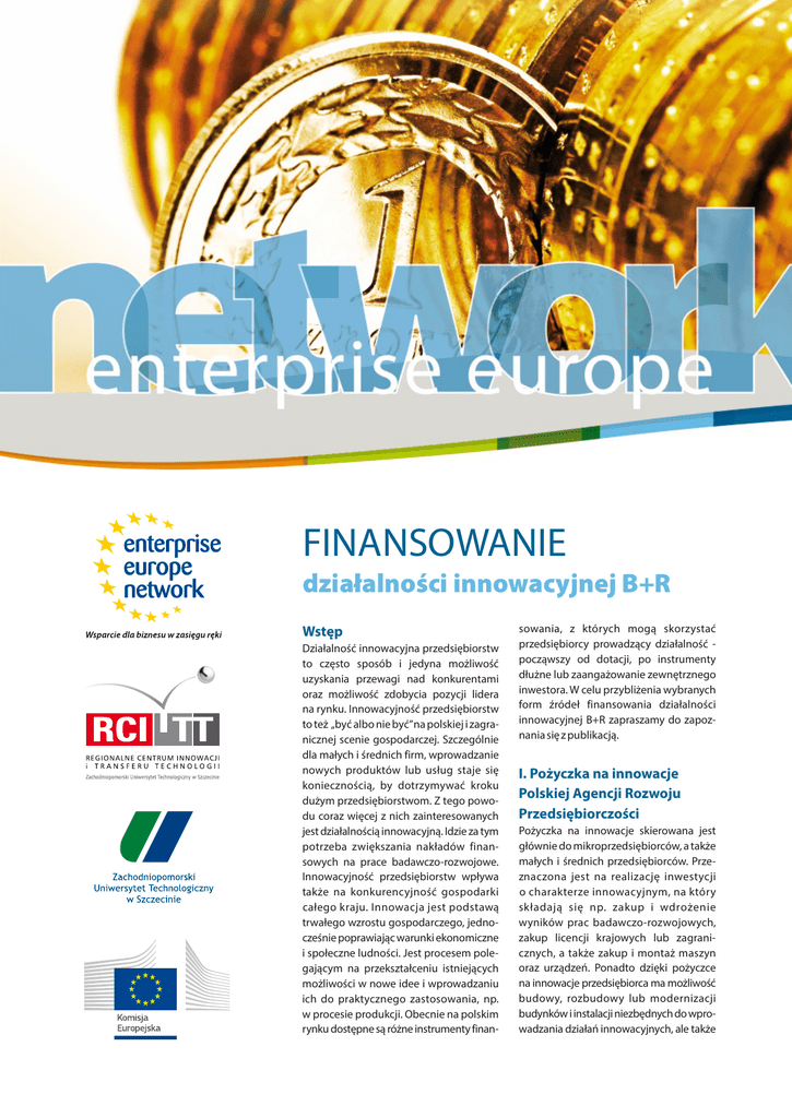 FINANSOWANIE działalności innowacyjnej B+R Wstęp Działalność innowacyjna przedsiębiorstw to często sposób i jedyna możliwość uzyskania przewagi nad konkurentami oraz możliwość zdobycia pozycji lidera na rynku. Innowacyjność przedsiębiorstw to też „być albo nie być” na polskiej i zagranicznej scenie gospodarczej. Szczególnie dla małych i średnich firm, wprowadzanie nowych produktów lub usług staje się koniecznością, by dotrzymywać kroku dużym przedsiębiorstwom. Z tego powodu coraz więcej z nich zainteresowanych jest działalnością innowacyjną. Idzie za tym potrzeba zwiększania nakładów finansowych na prace badawczo-rozwojowe. Innowacyjność przedsiębiorstw wpływa także na konkurencyjność gospodarki całego kraju. Innowacja jest podstawą trwałego wzrostu gospodarczego, jednocześnie poprawiając warunki ekonomiczne i społeczne ludności. Jest procesem polegającym na przekształceniu istniejących możliwości w nowe idee i wprowadzaniu ich do praktycznego zastosowania, np. w procesie produkcji. Obecnie na polskim rynku dostępne są różne instrumenty finan- sowania, z których mogą skorzystać przedsiębiorcy prowadzący działalność począwszy od dotacji, po instrumenty dłużne lub zaangażowanie zewnętrznego inwestora. W celu przybliżenia wybranych form źródeł finansowania działalności innowacyjnej B+R zapraszamy do zapoznania się z publikacją. I. Pożyczka na innowacje Polskiej Agencji Rozwoju Przedsiębiorczości Pożyczka na innowacje skierowana jest głównie do mikroprzedsiębiorców, a także małych i średnich przedsiębiorców. Przeznaczona jest na realizację inwestycji o charakterze innowacyjnym, na który składają się np. zakup i wdrożenie wyników prac badawczo-rozwojowych, zakup licencji krajowych lub zagranicznych, a także zakup i montaż maszyn oraz urządzeń. Ponadto dzięki pożyczce na innowacje przedsiębiorca ma możliwość budowy, rozbudowy lub modernizacji budynków i instalacji niezbędnych do wprowadzania działań innowacyjnych, ale także FINANSOWANIE działalności innowacyjnej i B+R zakup usług doradczych w zakresie planowania inwestycyjnego i wdrażania nowych technologii. Wysokość pożyczki nie może przekraczać 2 mln zł oraz 75% wydatków kwalifikujących się do objęcia pożyczką. Natomiast wydatki na zakup usług doradczych nie mogą przekroczyć 15%. Taka forma wsparcia przedsiębiorców udzielana jest na okres nie dłuższy niż 10 lat. Wnioskodawca ma również prawo do zawieszenia spłaty kapitału i odsetek w okresie inwestycji, jednak nie dłużej niż w okresie 2 lat. Wnioski o finansowanie inwestycji o charakterze innowacyjnym przyjmowane są na bieżąco, a informacje na ten temat można znaleźć na stronie: http://www.parp.gov.pl/index/index/1069 II. Leasing innowacyjny Emitentami rynku New Connect są przede wszystkim małe i średnie spółki akcyjne, które są zainteresowane finansowaniem rozwoju w drodze emisji publicznej, bądź oferty prywatnej o wartości od kilkuset tysięcy do kilkudziesięciu milionów złotych. W stosunku do głównego parkietu, rynek NC charakteryzuje się dużo niższymi kosztami dla emitentów, uproszczonymi warunkami dopuszczającymi i łagodniejszymi obowiązkami informacyjnymi. Ponadto przedsiębiorstwo chcące zaistnieć na NC nie jest zobowiązane do przedstawienia tzw. prospektu emisyjnego, ani raportów kwartalnych, co stanowi kolejne ułatwienie. Przedsiębiorstwo, które ma zamiar zadebiutować na platformie giełdowej NC musi mieć status spółki akcyjnej, bądź spółki komandytowo-akcyjnej. Leasing innowacyjny jest coraz bardziej powszechnym źródłem długoterminowego finansowania różnorodnych przedsięwzięć inwestycyjnych oraz wzrostu majątku przedsiębiorstwa. Polega na uzyskiwaniu różnego rodzaju dóbr inwestycyjnych, np. nowoczesnych i drogich urządzeń specjalistycznych potrzebnych w pracach B+R, na podstawie długoterminowej umowy, w której leasingodawca zobowiązuje się oddać do dyspozycji leasingobiorcy określone dobra w zamian za ustalone opłaty okresowe. Taka forma wsparcia MŚP wydatnie zmniejsza ryzyko niepowodzenia przedsięwzięcia innowacyjnego. Jest alternatywą wobec kredytu, ponieważ konstrukcja leasingu neutralizuje pewne mankamenty kredytowania, tj. przy leasingu potrzebne jest mniejsze zabezpieczenie, krótsza i prostsza jest procedura, a także niższy koszt. Informacji na temat leasingu innowacyjnego można poszukiwać na stronach polskich banków komercyjnych. Pożądane jest, aby przedsiębiorstwo wchodzące na NC prowadziło działalność krótko, tj. nie dłużej niż ok. 4 lata oraz cechowało się wysoką dynamiką wzrostu oraz przewidywaną kapitalizacją w wysokości ok. 20 mln złotych. Możliwe są dwie drogi debiutu: oferta prywatna oraz oferta publiczna. Debiut w drodze oferty publicznej przebiega analogicznie jak na rynku podstawowym. Konieczne jest przygotowane prospektu emisyjnego i uzyskanie zatwierdzenia przez Komisję Nadzoru Finansowego (KNF). Gdy oferta nie przekracza 2,5 mln euro, przedsiębiorstwo ma możliwość przygotowania memorandum informacyjnego, które również podlega zaopiniowaniu przez KNF. W przypadku oferty prywatnej nie przygotowuje się prospektu emisyjnego, a jedynie dokument ofertowy, który może zostać skierowany do maksymalnie 99 inwestorów. Ponadto przed wejściem na NC należy sporządzić dokument informacyjny, który podlega upublicznieniu. Więcej informacji na stronie: http://www.newconnect.pl/ IV. Programy Narodowego Centrum Badań i Rozwoju Narodowe Centrum Badań i Rozwoju (NCBR) realizuje zadania z zakresu polityki naukowej, naukowo-technicznej i innowacyjnej. Działa jako platforma dialogu pomiędzy środowiskiem nauki i biznesu. Do głównych zadań NCBR należy zarządzanie i realizacja strategicznych programów badań naukowych i prac rozwojowych, które bezpośrednio przekładają się na rozwój innowacyjności. Dzięk