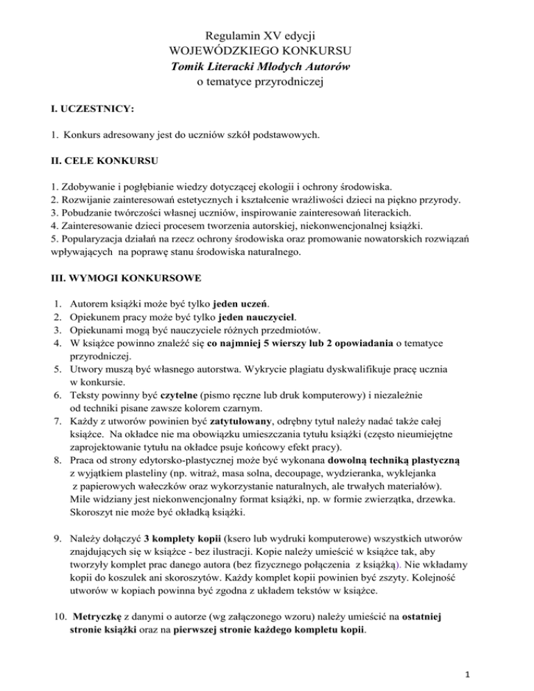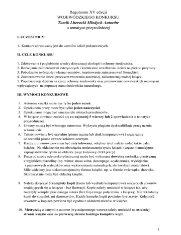 Regulamin XV edycji WOJEWÓDZKIEGO KONKURSU Tomik Literacki Młodych Autorów o tematyce przyrodniczej I. UCZESTNICY: 1. Konkurs adresowany jest do uczniów szkół podstawowych. II. CELE KONKURSU 1. Zdobywanie i pogłębianie wiedzy dotyczącej ekologii i ochrony środowiska. 2. Rozwijanie zainteresowań estetycznych i kształcenie wrażliwości dzieci na piękno przyrody. 3. Pobudzanie twórczości własnej uczniów, inspirowanie zainteresowań literackich. 4. Zainteresowanie dzieci procesem tworzenia autorskiej, niekonwencjonalnej książki. 5. Popularyzacja działań na rzecz ochrony środowiska oraz promowanie nowatorskich rozwiązań wpływających na poprawę stanu środowiska naturalnego. III. WYMOGI KONKURSOWE 1. 2. 3. 4. 5. 6. 7. 8. Autorem książki może być tylko jeden uczeń. Opiekunem pracy może być tylko jeden nauczyciel. Opiekunami mogą być nauczyciele różnych przedmiotów. W książce powinno znaleźć się co najmniej 5 wierszy lub 2 opowiadania o tematyce przyrodniczej. Utwory muszą być własnego autorstwa. Wykrycie plagiatu dyskwalifikuje pracę ucznia w konkursie. Teksty powinny być czytelne (pismo ręczne lub druk komputerowy) i niezależnie od techniki pisane zawsze kolorem czarnym. Każdy z utworów powinien być zatytułowany, odrębny tytuł należy nadać także całej książce. Na okładce nie ma obowiązku umieszczania tytułu książki (często nieumiejętne zaprojektowanie tytułu na okładce psuje końcowy efekt pracy). Praca od strony edytorsko-plastycznej może być wykonana dowolną techniką plastyczną z wyjątkiem plasteliny (np. witraż, masa solna, decoupage, wydzieranka, wyklejanka z papierowych wałeczków oraz wykorzystanie naturalnych, ale trwałych materiałów). Mile widziany jest niekonwencjonalny format książki, np. w formie zwierzątka, drzewka. Skoroszyt nie może być okładką książki. 9. Należy dołączyć 3 komplety kopii (ksero lub wydruki komputerowe) wszystkich utworów znajdujących się w książce - bez ilustracji. Kopie należy umieścić w książce tak, aby tworzyły komplet prac danego autora (bez fizycznego połączenia z książką). Nie wkładamy kopii do koszulek ani skoroszytów. Każdy komplet kopii powinien być zszyty. Kolejność utworów w kopiach powinna być zgodna z układem tekstów w książce. 10. Metryczkę z danymi o autorze (wg załączonego wzoru) należy umieścić na ostatniej stronie książki oraz na pierwszej stronie każdego kompletu kopii. 1 11. Warunkiem dopuszczenia do udziału w konkursie nadesłanej książki jest: - nadesłanie pracy w terminie wraz z dołączeniem kompletu kopii - podanie pełnych danych adresowych szkoły, informacji o autorze pracy i opiekunie IV. KRYTERIA OCENIANIA 1. Jury będzie oceniało przede wszystkim: poziom literacki tekstów zawartych w pracy, atrakcyjność i adekwatność tytułu, estetykę i staranność wykonania, pomysłowość edytorsko-plastyczną. 2. Prace biorące udział w konkursie pozostają do wyłącznej dyspozycji organizatorów, bez prawa zwrotu autorom. 3. Organizatorzy konkursu zastrzegają sobie możliwość wykorzystania nadesłanych prac w celach wystawienniczych, wykorzystania zdjęć prac oraz zdjęć z uroczystego podsumowania konkursu w celach promocyjno-informacyjnych. 4. Nadesłanie pracy jest jednoznaczne z akceptacją regulaminu. V. Nagrody 1. Jury przyzna nagrody I,II,III i wyróżnienia. 2 . Trzy szkoły, które nadeślą największą ilość prac otrzymają puchary. 3. Nauczyciele-opiekunowie są odpowiedzialni za przygotowanie prac zgodnie z zasadami konkursu. Opiekunowie otrzymają podziękowania w formie dyplomu pod warunkiem, że nadesłane prace spełnią wymogi konkursu. Opiekunowie, których uczniowie zdobędą nagrody pierwsze otrzymają statuetki i dyplomy. VII. Zgłoszenia do konkursu prosimy nadsyłać do 31 października 2014 r. na adres [email protected]. Regulamin konkursu i zgłoszenie znajdują się na szkolnej stronie internetowej: www.izabelin.edu.pl w zakładce: Biblioteka – Tomik Literacki. Tam też można znaleźć galerię przykładowych książek z poprzednich edycji. VIII. Prace konkursowe uczniów prosimy nadsyłać do 9 stycznia 2015 r. na adres: Zespół Szkół w Izabelinie Biblioteka ul. 3 Maja 49 05-080 Izabelin IX. Informacje o wynikach i terminie podsumowania konkursu zostaną wysłane za pośrednictwem poczty elektronicznej do 29 maja 2015 r. tylko do szkół, w których będą uczniowie nagrodzeni lub wyróżnieni. Szkoły i opiekunowie, których uczniowie nie znajdą się w gronie nagrodzonych lub wyróżnionych otrzymają podziękowania za udział po finale. X. Podsumowanie konkursu planowane jest w czerwcu 2015 r. (termin zostanie podany na szkolnej stronie internetowej). Organizator Konkursu Stanisława Fadrowska-Adamczyk e-mail: [email protected] tel. (22) 752 68 72 fax (22) 722 75 71 2 Wzór metryczki do zamieszczenia w książce i na kopiach utworów Wypełnić drukiem Nazwa szkoły ulica Dane szkoły kod pocztowy, miejscowość tel.\fax e-mail Tytuł książki Opiekun pracy Autor pracy, klasa Prawidłowo przygotowana praca 3
