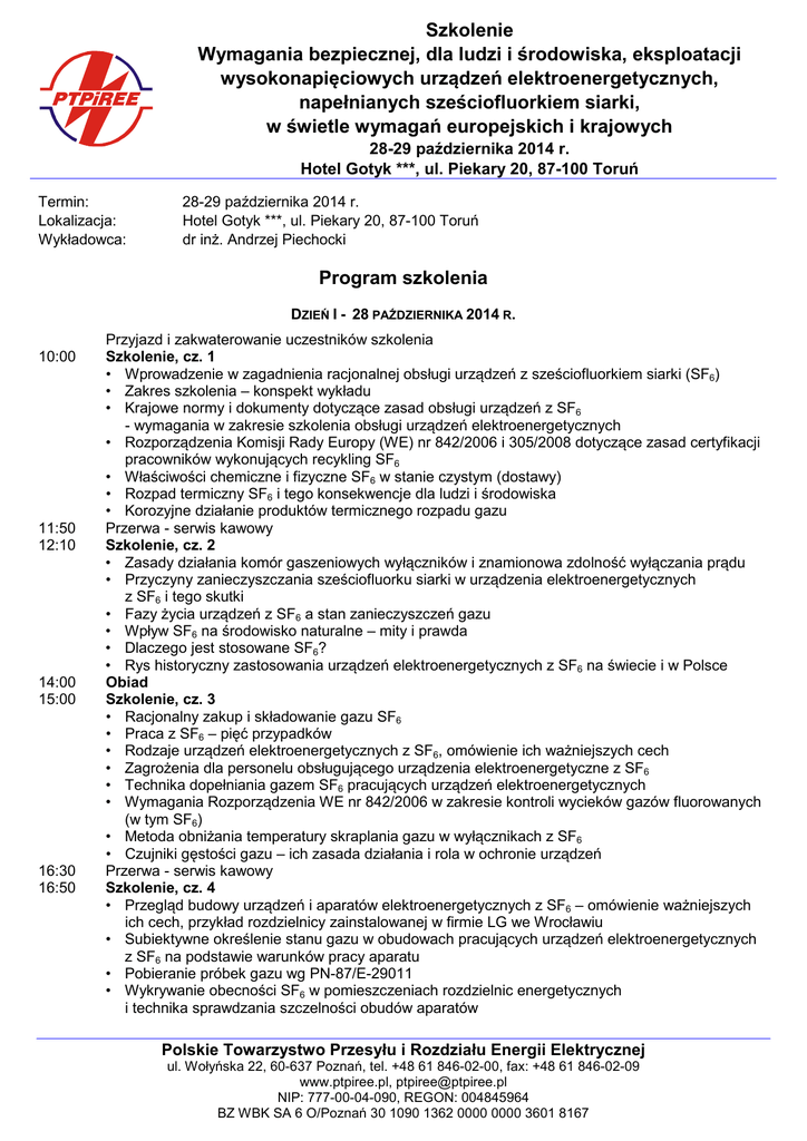 Szkolenie Wymagania bezpiecznej, dla ludzi i środowiska, eksploatacji wysokonapięciowych urządzeń elektroenergetycznych, napełnianych sześciofluorkiem siarki, w świetle wymagań europejskich i krajowych 28-29 października 2014 r. Hotel Gotyk ***, ul. Piekary 20, 87-100 Toruń Termin: Lokalizacja: Wykładowca: 28-29 października 2014 r. Hotel Gotyk ***, ul. Piekary 20, 87-100 Toruń dr inż. Andrzej Piechocki Program szkolenia DZIEŃ I - 28 PAŹDZIERNIKA 2014 R. 10:00 11:50 12:10 14:00 15:00 16:30 16:50 Przyjazd i zakwaterowanie uczestników szkolenia Szkolenie, cz. 1 • Wprowadzenie w zagadnienia racjonalnej obsługi urządzeń z sześciofluorkiem siarki (SF6) • Zakres szkolenia – konspekt wykładu • Krajowe normy i dokumenty dotyczące zasad obsługi urządzeń z SF6 - wymagania w zakresie szkolenia obsługi urządzeń elektroenergetycznych • Rozporządzenia Komisji Rady Europy (WE) nr 842/2006 i 305/2008 dotyczące zasad certyfikacji pracowników wykonujących recykling SF6 • Właściwości chemiczne i fizyczne SF6 w stanie czystym (dostawy) • Rozpad termiczny SF6 i tego konsekwencje dla ludzi i środowiska • Korozyjne działanie produktów termicznego rozpadu gazu Przerwa - serwis kawowy Szkolenie, cz. 2 • Zasady działania komór gaszeniowych wyłączników i znamionowa zdolność wyłączania prądu • Przyczyny zanieczyszczania sześciofluorku siarki w urządzenia elektroenergetycznych z SF6 i tego skutki • Fazy życia urządzeń z SF6 a stan zanieczyszczeń gazu • Wpływ SF6 na środowisko naturalne – mity i prawda • Dlaczego jest stosowane SF6? • Rys historyczny zastosowania urządzeń elektroenergetycznych z SF6 na świecie i w Polsce Obiad Szkolenie, cz. 3 • Racjonalny zakup i składowanie gazu SF6 • Praca z SF6 – pięć przypadków • Rodzaje urządzeń elektroenergetycznych z SF6, omówienie ich ważniejszych cech • Zagrożenia dla personelu obsługującego urządzenia elektroenergetyczne z SF6 • Technika dopełniania gazem SF6 pracujących urządzeń elektroenergetycznych • Wymagania Rozporządzenia WE nr 842/2006 w zakresie kontroli wycieków gazów fluorowanych (w tym SF6) • Metoda obniżania temperatury skraplania gazu w wyłącznikach z SF6 • Czujniki gęstości gazu – ich zasada działania i rola w ochronie urządzeń Przerwa - serwis kawowy Szkolenie, cz. 4 • Przegląd budowy urządzeń i aparatów elektroenergetycznych z SF6 – omówienie ważniejszych ich cech, przykład rozdzielnicy zainstalowanej w firmie LG we Wrocławiu • Subiektywne określenie stanu gazu w obudowach pracujących urządzeń elektroenergetycznych z SF6 na podstawie warunków pracy aparatu • Pobieranie próbek gazu wg PN-87/E-29011 • Wykrywanie obecności SF6 w pomieszczeniach rozdzielnic energetycznych i technika sprawdzania szczelności obudów aparatów Polskie Towarzystwo Przesyłu i Rozdziału Energii Elektrycznej ul. Wołyńska 22, 60-637 Poznań, tel. +48 61 846-02-00, fax: +48 61 846-02-09 www.ptpiree.pl, [email protected] NIP: 777-00-04-090, REGON: 004845964 BZ WBK SA 6 O/Poznań 30 1090 1362 0000 0000 3601 8167 Szkolenie Wymagania bezpiecznej, dla ludzi i środowiska, eksploatacji wysokonapięciowych urządzeń elektroenergetycznych, napełnianych sześciofluorkiem siarki, w świetle wymagań europejskich i krajowych 28-29 października 2014 r. Hotel Gotyk ***, ul. Piekary 20, 87-100 Toruń 18:30 19:00 • Recykling – obowiązek, korzyści i technika jego stosowania • Trzy możliwości postępowania użytkowników wycofujących (likwidujących) urządzenia elektroenergetyczne z eksploatacji • Ważniejsze zalecenia (zasady) obsługi urządzeń z SF6 Zakończenie pierwszego dnia szkolenia Kolacja (Hotel Spichrz, ul. Mostowa 1, 87-100 Toruń – ok. 500 m od Hotelu Gotyk) DZIEŃ II - 29 PAŹDZIERNIKA 2014 R. 8:00 9:00 10:50 11:10 13:00 Śniadanie Szkolenie, cz. 5 • Postępowanie w razie awarii urządzenia elektroenergetycznego z SF6 • Zasady demontażu aparatów z SF6 – wymagania dotyczące bezpieczeństwa personelu wykonującego tę pracę • Niezbędny, według CIGRE, sprzęt pomiarowy w rozdzielni elektroenergetycznej wyposażonej w aparaty z SF6 • Zasady montażu urządzeń i aparatów z SF6 po remoncie lub przeglądzie • Pierwsze napełnianie gazem po montażu aparatu • Sześciofluorek siarki a zagrożenie dla zdrowia personelu • Środki ochrony osobistej – wymagania i zakup Przerwa - serwis kawowy Szkolenie, cz. 6 • Neutralizacja i usuwanie produktów proszkowych rozpadu gazu oraz sorbentów • Przygotowanie roztworu neutralizującego narzędzia i ubrania, stosowane przy urządzeniach elektroenergetycznych z SF6 • Podsumowanie zaleceń dla użytkowników urządzeń z SF6 • Opracowanie instrukcji obsługi urządzenia (aparatu) napełnionego SF6 Obiad i wyjazd uczestników szkolenia Zakwaterowanie Wszyscy uczestnicy szkolenia zakwaterowani są w pokojach 1-os. w Hotelu Gotyk ***. Parking, minibar PTPiREE nie pokrywa kosztów minibaru, parkingu i innych usług zamawianych indywidualnie w hotelu. Polskie Towarzystwo Przesyłu i Rozdziału Energii Elektrycznej ul. Wołyńska 22, 60-637 Poznań, tel. +48 61 846-02-00, fax: +48 61 846-02-09 www.ptpiree.pl, [email protected] NIP: 777-00-04-090, REGON: 004845964 BZ WBK SA 6 O/Poznań 30 1090 1362 0000 0000 3601 8167