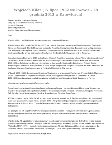 Wojciech Kilar (17 lipca 1932 we Lwowie - 29 grudnia 2013 w Katowicach) Pewien pianista ze starego Lwowa uczył się w szkołach Rzeszowa, Krakowa, na stacji Katowice zarzucił był kotwicę, stąd na świat cały zaczął komponować. (ebs) Wojciech Kilar - polski pianista, kompozytor muzyki poważnej i filmowej. Wojciech Artur Kilar urodził się 17 lipca 1932 we Lwowie. Jego dom rodzinny znajdował się przy ul. Sapiehy 89. Ojciec Jan Franciszek Kilar był lekarzem, zaś matka Neonilla aktorką teatralną. Jako dziecko z wielką niechęcią brał lekcje gry na fortepianie u pani Reissówny. Po przymusowym wysiedleniu ze Lwowa, w latach 1946-1947, kontynuował naukę gry na fortepianie w Państwowej Średniej Szkole Muzycznej nr 2 w Rzeszowie. Jako pianista zadebiutował w 1947 na konkursie Młodych Talentów, wykonując własne "Dwie miniatury dziecięce" (II nagroda). W latach 1947-1948 uczęszczał do Państwowego Liceum Muzycznego w Krakowie, zaś w latach 1948-1950 do Państwowego Liceum Muzycznego w Katowicach. Studiował w Państwowej Wyższej Szkole Muzycznej w Katowicach, którą ukończył w 1955. W tym samym roku otrzymał II nagrodę za "Małą uwerturę" na Konkursie Utworów Symfonicznych na V Festiwalu Młodzieży w Warszawie. W latach 1955-1958 był asystentem Bolesława Woytowicza w krakowskiej Państwowej Wyższej Szkole Muzycznej. W 1957 uczestniczył w Międzynarodowych Kursach Wakacyjnych Nowej Muzyki w Darmstadt. W latach 1959-1960 jako stypendysta rządu francuskiego kształcił się pod kierunkiem Nadii Boulanger w Paryżu. https://www.youtube.com/watch?v=wvgcc1jcv9s Początkowo jego twórczość pozostawała pod wpływem polskiego i europejskiego neoklasycyzmu. Kompozytor sięgał do klasycznych form i gatunków, także do klasycznej melodyki, orkiestry i brzmienia. Czerpał z twórczości Béli Bartóka, Igora Strawinskiego, Dymitra Szostakowicza, Siergieja Prokofjewa... W 1960 otrzymał za odę "Béla Bartók in memoriam" nagrodę fundacji im. L. Boulanger w Bostonie. Występował także jako pianista wykonując własne utwory. 1979-1981 pełnił funkcję wiceprezesa Zarządu Głównego Związku Kompozytorów Polskich. W 1977 został członkiem-założycielem Towarzystwa im. Karola Szymanowskiego w Zakopanem. Od początku lat 60. współtworzył wraz z Krzysztofem Pendereckim i Henrykiem Góreckim nową polską szkołę awangardową oraz nowy kierunek we współczesnej muzyce zwany sonoryzmem, nawiązywał do serializmu i dodekafonii. W połowie lat 70. uprościł swój język muzyczny, zaczął coraz wyraźniej nawiązywać do tradycji, w jego muzyce pojawiły się inspiracje ludowe i religijne. Punktem zwrotnym był "Krzesany" (1974). Ważne dzieła z tego okresu to "Kościelec 1909" (1976) - poemat symfoniczny napisany na 75-lecie Filharmonii Narodowej i nawiązujący do tragicznej śmierci Mieczysława Karłowicza, "Siwa mgła" (1979) na baryton i orkiestrę, "Exodus" (1981)... https://www.youtube.com/watch?v=MQbInyX3vm8 ..."Angelus" (1984) na sopran, chór mieszany i orkiestrę symfoniczną, "Orawa" (1986) na orkiestrę kameralną, "Preludium chorałowe" (1988). Znany był ze swojej religijności, z okazji przypadającego Jubileuszu 100-lecia Filharmonii Warszawskiej, na zamówienie jej dyrektora Kazimierza Korda, skomponował mszę w intencji pokoju na nowe tysiąclecie: "Missa pro pace" (2000) na sopran, alt, tenor, bas, chór mieszany i orkiestrę symfoniczną. Światowe prawykonanie miało miejsce 12 stycznia 2001 w Filharmonii Narodowej w Warszawie. Niekwestionowana jest pozycja Kilara jako jednego z najwybitniejszych kompozytorów muzyki filmowej. Napisał muzykę do ponad 130 filmów. Jego związki z filmem zaczęły się już w 1958, współpracował z wieloma reżyserami: Bohdanem Porębą, Andrzejem Wajdą, Kazimierzem Kutzem, Krzysztofem Zanussim (począwszy od "Struktury kryształu" stworzył muzykę do niemal wszystkich filmów tego reżysera), Krzysztofem Kieślowskim, Stanisławem Różewiczem, Wojciechem Hasem, Tadeuszem Konwickim, Markiem Piwowskim, Romanem Polańskim, Francisem Fordem Coppolą, Jane Campion... https://www.youtube.com/watch?v=ufqXL_bsWL8 O ile sukcesy religijnych utworów komponowanych w ostatnich latach właściwie ograniczają się do polskiej publiczności, to międzynarodowym uznaniem i popularnością cieszy się jego muzyka filmowa, a wyjątkowy sukces odniósł kompozytor "Drakulą". https://www.youtube.com/watch?v=B_OQvVdggUM W 1999 otrzymał propozycję od reżysera Petera Jacksona na napisanie muzyki do filmu "Władca Pierścieni". Kompozytor początkowo się zgodził, ale ostatecznie do współpracy nie doszło. Przez wiele lat kompozytor związany był z Jasną Górą, gdzie m.in. świętował swoje urodziny. Obchodzono tam tzw. Dzień Kilara. Należał do konfraterni zakonu paulinów. Zmarł 29 grudnia 2013 w Katowicach po kilkumiesięcznej chorobie na guza mózgu. Uroczystości pogrzebowe kompozytora odbyły się 4 stycznia 2014 w katedrze pw. Chrystusa Króla w Katowicach. Został pochowany na katowickim cmentarzu przy ul. Sienkiewicza we wspólnym grobowcu ze zmarłą kilka lat wcześniej żoną Barbarą. wspomnienia o Wojciechu Kilarze na stronie cultura.pl galeria portretów na stronie cultura.pl