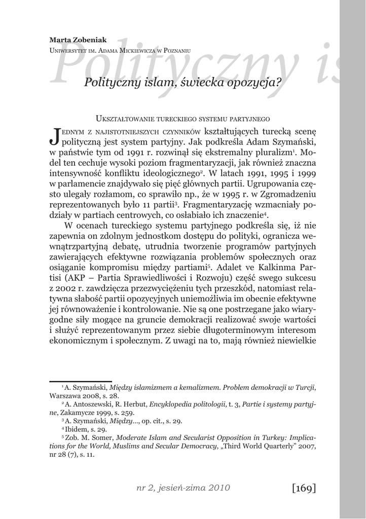 Polityczny is Marta Zobeniak Uniwersytet im. Adama Mickiewicza w Poznaniu Polityczny islam, świecka opozycja? Ukształtowanie tureckiego systemu partyjnego ednym z najistotniejszych czynników kształtujących turecką scenę polityczną jest system partyjny. Jak podkreśla Adam Szymański, w państwie tym od 1991 r. rozwinął się ekstremalny pluralizm1. Model ten cechuje wysoki poziom fragmentaryzacji, jak również znaczna intensywność konfliktu ideologicznego2. W latach 1991, 1995 i 1999 w parlamencie znajdywało się pięć głównych partii. Ugrupowania często ulegały rozłamom, co sprawiło np., że w 1995 r. w Zgromadzeniu reprezentowanych było 11 partii3. Fragmentaryzację wzmacniały podziały w partiach centrowych, co osłabiało ich znaczenie4. W ocenach tureckiego systemu partyjnego podkreśla się, iż nie zapewnia on zdolnym jednostkom dostępu do polityki, ogranicza wewnątrzpartyjną debatę, utrudnia tworzenie programów partyjnych zawierających efektywne rozwiązania problemów społecznych oraz osiąganie kompromisu między partiami5. Adalet ve Kalkinma Partisi (AKP – Partia Sprawiedliwości i Rozwoju) część swego sukcesu z 2002 r. zawdzięcza przezwyciężeniu tych przeszkód, natomiast relatywna słabość partii opozycyjnych uniemożliwia im obecnie efektywne jej równoważenie i kontrolowanie. Nie są one postrzegane jako wiarygodne siły mogące na gruncie demokracji realizować swoje wartości i służyć reprezentowanym przez siebie długoterminowym interesom ekonomicznym i społecznym. Z uwagi na to, mają również niewielkie J 1 A. Szymański, Między islamizmem a kemalizmem. Problem demokracji w Turcji, Warszawa 2008, s. 28. 2 A. Antoszewski, R. Herbut, Encyklopedia politologii, t. 3, Partie i systemy partyjne, Zakamycze 1999, s. 259. 3 A. Szymański, Między…, op. cit., s. 29. 4 Ibidem, s. 29. 5 Zob. M. Somer, Moderate Islam and Secularist Opposition in Turkey: Implications for the World, Muslims and Secular Democracy, „Third World Quarterly” 2007, nr 28 (7), s. 11. nr 2, jesień-zima 2010 [169] Marta Zobeniak możliwości budowania zaufania między sobą, osiągania kompromisu, a także wpływania na konsolidację demokracji6. Interwencje armii i ograniczenia, jakie w latach 1980-1983 zostały nałożone na partie polityczne stanowią jedne z głównych przyczyn ich niepowodzeń w budowaniu silnych struktur instytucjonalnych i więzi z organizacjami społeczeństwa obywatelskiego. Kryzysy ekonomiczne w państwie pozbawiały partie finansowych podstaw funkcjonowania, a elektorat pozostawał niestabilny. Co więcej, istniały problemy wewnętrznych podziałów, oraz zmieniania przez parlamentarzystów ugrupowań w trakcie kadencji. We wschodniej części Turcji szczególnie widoczne były także zjawiska politycznego patronażu i klientelizmu7. Problemy związane z funkcjonowaniem systemu partyjnego pogłębiły się w latach dziewięćdziesiątych XX wieku. Silni liderzy pozostawali na czele partii mimo szerzącej się korupcji i erozji poparcia. Nie zaskakiwał fakt, że wyborcy zaczęli odchodzić od partii centroprawicowych i centrolewicowych w kierunku prawicowych, często nacjonalistycznych czy o korzeniach religijnych, postrzegając ich polityków jako mniej skorumpowanych8. W 1995 r. wybory wygrała Refah Partisi (RP – Partia Dobrobytu), uznawana za antysystemową9. W 1999 r. drugie miejsce zajęła nacjonalistyczna Milliyetçi Hareket Partisi (MHP – Partia Akcji Nacjonalistycznej). Zyskiwanie na znaczeniu przez tego rodzaju ugrupowania przyczyniało się do wzmacniania polaryzacji ideologicznej – nie w kategoriach lewica-prawica, lecz na płaszczyźnie religijnej (sekularyści- Ibidem. Ibidem. 8 Ibidem. Zob. także: S. Sayari, Towards a New Turkish Party System?, „Turkish Studies” 2007, vol. 8, no. 2. 9 Birol Akgun stwierdza, że wiele partii prawicowych wykazuje wrogość wobec nowoczesności, a także wobec podziałów społecznych. Dążą one do osiągnięcia społecznej harmonii, kierując się jednocześnie poczuciem wspólnoty i nienawiścią wobec „obcych”, a także wiarą w struktury hierarchiczne. Autor powołuje się na koncepcję Giovanni Sartoriego, który partie tego rodzaju definiuje jako antysystemowe, czyli nie podzielające wartości porządku politycznego, w którym funkcjonują. Przyjmując szeroką definicję partii skrajnie prawicowych, tzn. wyrażających w sposób otwarty antypluralistyczne nastawienia lub przekonania, zalicza do nich MHP i RP. B. Akgun, Twins or Enemies: Comparing Nationalist and Islamist Traditions in Turkish Politics, „Middle East Review of International Affairs” 2002, vol. 6, no. 1, s. 18. Zob. również: A. Szymański, op. cit., s. 29, M. H. Yavuz, Political Islam and the Welfare (Refah) Party in Turkey, „Comparative Politics” 1997, vol. 30, no. 1, s. 65. 6 7 [170] refleksje Polityczny islam, świecka opozycja? -islamiści) oraz kulturowo-etnicznej (nacjonaliści tureccy i kurdyjscy)10. Partie o korzeniach islamskich posiadały silne organizacje, szczególnie na najniższym szczeblu, co pomagało im w budowaniu poparcia. AKP na przykład ustanowiła w tym celu silne kanały komunikacji z wyborcami. Zdołała także zapewnić funkcjonowanie w swych ramach zasad demokratycznych i równości, choć dostrzegano w niej także elementy autorytaryzmu11. Pojawiły się wobec jej członków zarzuty korupcji. Sama partia naciskała na wybór własnego kandydata na prezydenta, zamiast porozumieć się w tej kwestii z opozycją. Pozostałe ugrupowania nie uniknęły słabości. Nie było jasne, czy próby połączenia głównej partii opozycyjnej, Cumhuriyet Halk Partisi (CHP – Republikańskiej Partii Ludowej) i Demokratik Sol Parti (DSP – Demokratycznej Lewicy), a także dwu partii centroprawicowych – Doğru Yol Partisi (DYP – Partię Słusznej Drogi) i Anavatan Partisi (ANAP – Partii Ojczyźnianej), są w stanie przetrwać personalne konflikty i doprowadzić do p