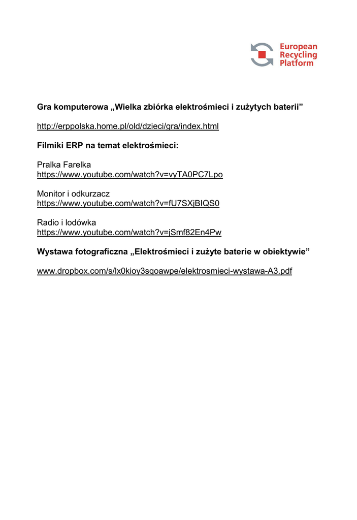 Gra komputerowa „Wielka zbiórka elektrośmieci i zużytych baterii” http://erppolska.home.pl/old/dzieci/gra/index.html Filmiki ERP na temat elektrośmieci: Pralka Farelka https://www.youtube.com/watch?v=vyTA0PC7Lpo Monitor i odkurzacz https://www.youtube.com/watch?v=fU7SXjBIQS0 Radio i lodówka https://www.youtube.com/watch?v=jSmf82En4Pw Wystawa fotograficzna „Elektrośmieci i zużyte baterie w obiektywie” www.dropbox.com/s/lx0kioy3sqoawpe/elektrosmieci-wystawa-A3.pdf