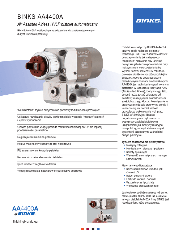 BINKS AA4400A Air Assisted Airless HVLP pistolet automatyczny BINKS AA4400A jest idealnym rozwiązaniem dla zautomatyzowanych dużych i średnich produkcji. “Quick detach" szybkie odłączanie od podstawy redukuje czas przestojów Unikatowe rozwiązanie głowicy powietrznej daje w efekcie “miększy" strumień i lepsze wykończenie Głowica powietrzna w opcji posiada możliwość indeksacji co 15° dla lepszej powtarzalności parametrów Regulacja strumienia na pistolecie Korpus materiałowy i kanały ze stali nierdzewnej Filtr materiałowy w korpusie pistoletu Ręczne lub zdalne sterowanie pistoletem Iglice i dysze z węglików wolframu W opcji recyrkulacja materiału w korpusie lub w podstawie Pistolet automatyczny BINKS AA4400A łączy w sobie najlepsze elementy technologii HVLP i Air Assisted Airless w celu zapewnienia jak najlepszego “miękkiego" rozpylenia aby uzyskać najwyższe jakościowo powierzchnie przy maksymalnym wykorzystaniu farby. Wysoki transfer materiału w rezultacie daje nam obniżenie kosztów produkcji w zgodzie z obecnie obowiązującymi restrykcyjnymi normami środowiskowymi. AA4400A jest technicznie wyrafinowanym pistoletem w technologii rozpylania AAA (Air Assisted Airless), który w ciągu kilku sekund może zostać odłączony od podstawy mocującej za pośrednictwem sześciobocznego klucza. Rozwiązanie to drastycznie redukuje przerwy na serwis i konserwację jak również ułatwia i przyspiesza wykonywanie tych prac. BINKS AA4400A jest idealnie przystosowanym urządzeniem do współpracy z wielopistoletowymi urządzeniami jak maszyny rotacyjne, manipulatory, roboty i wieloma innymi systemami stosowanymi w średnim i dużym przemyśle. Typowe zastosowania przemysłowe Maszyny rotacyjne Manipulatory - pionowe i poziome Roboty aplikacyjne Większość automatycznych maszyn natryskowych Materiały współpracujące Rozpuszczalnikowe i wodne, jak również UV Bejce, pokosty i lakiery Farby drukarskie i barwniki Uszczelniacze i podkłady Większość stosowanych farb Jakiekolwiek podłoże malujesz - drewno, metal, plastik, skóra, szkło lub cokolwiek innego, pistolet AA4400A firmy BINKS jest rozwiązaniem, które potrzebujesz. finishingbrands.eu BINKS AA4400A Air Assisted Airless HVLP pistolet automatyczny Najlepsze rozpylenie i oszczędności farby Wyjątkowe dysze i głowica powietrzna pistoletu BINKS AA4400A w technologii Air Assisted Airless HVLP potrzebują mniejszych ilości farby i ciśnienia powietrza niż inne rozwiązania na rynku aby uzyskać doskonałe krycie. Dzięki temu zyskuje się znacznie na kosztach produkcji związanych z zużyciem farby i energii. Sterowanie i podłączenia pistoletu AA4400A są łatwodostępne i bardzo dokładne. AA4400A wyposażony jest w głowicę AA10HP Nr zam. Opis 54-5890 głowica AA10HP HVLP z reg. strumienia NR ZAMÓWIENIA AA44 X – XX – X X Model: AA44 = AA4400A Zestaw pistoletu ntryskowego: B = Głowica natryskująca + podstawa G = Tylko głowica natryskująca Recyrkulacja: U = Podstawa/brak recyrkulacji H = Recyrkulacja w głowicy Elementy sterowania powietrzem: M = Zamontowane ręczne elementy sterowania P = Ręczne elementy sterowania zdemontowane i zaślepione Motylek: 10 = AA10 HVLP Strumień sz. (inches/mm) Wymiar (inches/mm) 2 / 51 4 / 102 6 / 152 .007/0.18 .009/0.23 .011/0.28 .013/0.33 .015/0.38 .017/0.43 .019/0.48 .021/0.53 .024/0.61 .027/0.69 00702 00902 - 00704 00904 01104 01304 - 00706 00906 01106 01306 01506 01706 01906 - UWAGA: Tabela poniżej podaje zestawienie wszystkich dysz do AA4400A. W celu dokładnego doboru należy zapoznać się z dokumentacją techniczną urządzenia. 8 /203 10 /254 12 /305 Dysze Premium : Nr zam. 114-XXXXX 00708 00908 01108 01308 01508 01708 01908 - 00910 01110 01310 01510 01710 01910 02110 02410 02710 Thread Wej. materiału (1) i recyrkulacja (2) Wej. powietrza atomizacji + strumień Cylinder/spust (Cyl) Max temp. pracy Ciężar pistoletu Korpus pistoletu Kanał materiał/dysza/iglica/głowica/podstawa Uszczelki materiałowe Głowica powietrzna AA10 przepływ pow. Filtr pistoletu 00912 01112 01312 01512 01712 01912 02112 02412 02712 14 / 356 16 / 406 18 / 457 01114 01314 01514 01714 01914 02114 02414 02714 01316 01516 01716 01916 02116 02416 02716 01518 01718 01918 02118 02418 02718 Ciśnienie 1/4 NPS Zeński Max 275 Bar / 4000 psi 1/4 BSP Zeński Max 10 Bar / 145 psi M5 Zeński 4 to 10 Bar / 60 to 145 psi 85° C / 185° F Kompletny 836 g, pistolet 469 g, podstawa 367 gm Kute anodyzowane aluminium Stal nierdzewna 303 / 17-4 / węglik wolframu Viton Extreme, Polyethylene 5.1 Scfm (144 L/min) przy 10 psi (0.69 Bar) ciś. w głowicy 100 micron, 150 mesh, 0.004” Pistolet AA4400A zgodny z ATEX 94/9/EC, stopień ochrony II 2 G X T6 do stref 1 i 2. For further technical features and benefits see the AA4400A Service Bulletin. Sprzedaż i serwis przez naszą Globalną Sieć Przemysłowej Dystrybucji Finishing Brands Locations Americas: USA Europe/Asia/Africa: United Kingdom France Germany Pacific Rim: China Mexico Japan Brazil Australia © Finishing Brands Holdings Inc. DeVilbiss, Ransburg, BGK i Binks są zarejestrowanymi, chronionymi prawem markami firmy Finishing Brands. Specyfikacja jak i opisane modele mogą ulec zmianie bez uprzedniej informacji. Wszelkie prawa zastrzeżone. www.finishingbrands.eu email: [email protected] finishingbrands.eu ARB - 06.14 - PL 2439