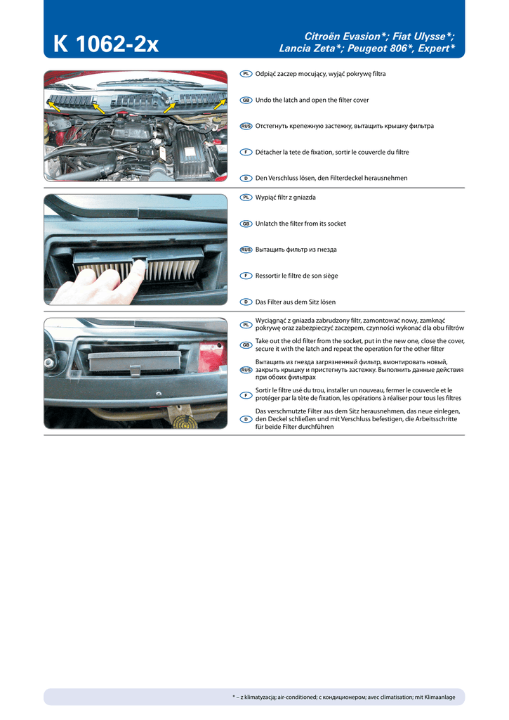 K 1062-2x Citroën Evasion*; Fiat Ulysse*; Lancia Zeta*; Peugeot 806*, Expert* PL Odpiąć zaczep mocujący, wyjąć pokrywę filtra GB Undo the latch and open the filter cover RUS Отстегнуть крепежную застежку, вытащить крышку фильтра F Détacher la tete de fixation, sortir le couvercle du filtre D Den Verschluss lösen, den Filterdeckel herausnehmen PL Wypiąć filtr z gniazda GB Unlatch the filter from its socket RUS Вытащить фильтр из гнезда F Ressortir le filtre de son siège D Das Filter aus dem Sitz lösen PL Wyciągnąć z gniazda zabrudzony filtr, zamontować nowy, zamknąć pokrywę oraz zabezpieczyć zaczepem, czynności wykonać dla obu filtrów GB Take out the old filter from the socket, put in the new one, close the cover, secure it with the latch and repeat the operation for the other filter RUS Вытащить из гнезда загрязненный фильтр, вмонтировать новый, закрыть крышку и пристегнуть застежку. Выполнить данные действия при обоих фильтрах F Sortir le filtre usé du trou, installer un nouveau, fermer le couvercle et le protéger par la tète de fixation, les opérations à réaliser pour tous les filtres D Das verschmutzte Filter aus dem Sitz herausnehmen, das neue einlegen, den Deckel schließen und mit Verschluss befestigen, die Arbeitsschritte für beide Filter durchführen * – z klimatyzacją; air-conditioned; с кондиционером; avec climatisation; mit Klimaanlage