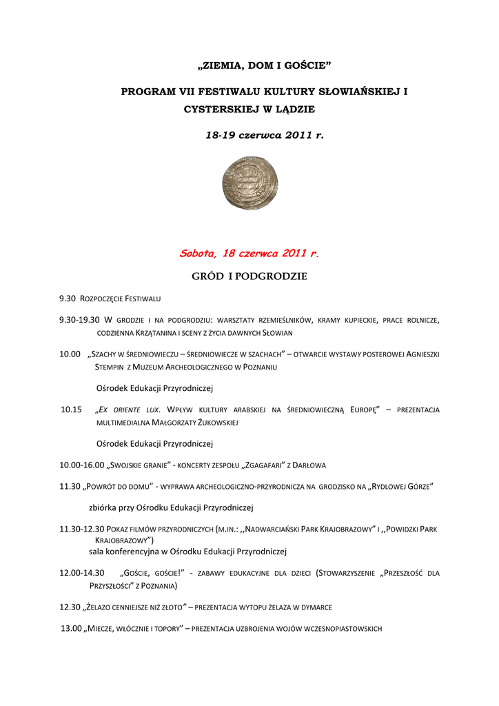„ZIEMIA, DOM I GOŚCIE” PROGRAM VII FESTIWALU KULTURY SŁOWIAŃSKIEJ I CYSTERSKIEJ W LĄDZIE 18-19 czerwca 2011 r. Sobota, 18 czerwca 2011 r. GRÓD I PODGRODZIE 9.30 ROZPOCZĘCIE FESTIWALU 9.30-19.30 W GRODZIE I NA PODGRODZIU: WARSZTATY RZEMIEŚLNIKÓW, KRAMY KUPIECKIE, PRACE ROLNICZE, CODZIENNA KRZĄTANINA I SCENY Z ŻYCIA DAWNYCH SŁOWIAN 10.00 „SZACHY W ŚREDNIOWIECZU – ŚREDNIOWIECZE W SZACHACH” – OTWARCIE WYSTAWY POSTEROWEJ AGNIESZKI STEMPIN Z MUZEUM ARCHEOLOGICZNEGO W POZNANIU Ośrodek Edukacji Przyrodniczej 10.15 „EX ORIENTE LUX. WPŁYW KULTURY ARABSKIEJ NA ŚREDNIOWIECZNĄ EUROPĘ” – PREZENTACJA MULTIMEDIALNA MAŁGORZATY ŻUKOWSKIEJ Ośrodek Edukacji Przyrodniczej 10.00-16.00 „SWOJSKIE GRANIE” - KONCERTY ZESPOŁU „ZGAGAFARI” Z DARŁOWA 11.30 „POWRÓT DO DOMU” - WYPRAWA ARCHEOLOGICZNO-PRZYRODNICZA NA GRODZISKO NA „RYDLOWEJ GÓRZE” zbiórka przy Ośrodku Edukacji Przyrodniczej 11.30-12.30 POKAZ FILMÓW PRZYRODNICZYCH (M.IN.: ,,NADWARCIAŃSKI PARK KRAJOBRAZOWY” I ,,POWIDZKI PARK KRAJOBRAZOWY”) sala konferencyjna w Ośrodku Edukacji Przyrodniczej 12.00-14.30 „GOŚCIE, GOŚCIE!” - ZABAWY EDUKACYJNE DLA DZIECI (STOWARZYSZENIE „PRZESZŁOŚĆ DLA PRZYSZŁOŚCI” Z POZNANIA) 12.30 „ŻELAZO CENNIEJSZE NIŻ ZŁOTO” – PREZENTACJA WYTOPU ŻELAZA W DYMARCE 13.00 „MIECZE, WŁÓCZNIE I TOPORY” – PREZENTACJA UZBROJENIA WOJÓW WCZESNOPIASTOWSKICH 13.30-14.00 „GŁOSY W ŚWIECIE PRZYRODY” – ZAJĘCIA EDUKACYJNE recepcja w Ośrodku Edukacji Przyrodniczej 14.30 „KUPCY, PIELGRZYMI, WAGANCI” - PRZEDSTAWIENIE TEATRU „GRY I LUDZIE” Z KATOWIC 15.00 „GRY WOJENNE” – ĆWICZENIA I POKAZ ZRĘCZNOŚCI WOJÓW 15.00-15.45 ,,SWÓJ - OBCY W ŚWIECIE PRZYRODY. OBCE GATUNKI SPOTYKANE W NADWARCIAŃSKIM PARKU KRAJOBRAZOWYM" – PREZENTACJA MULTIMEDIALNA sala konferencyjna w Ośrodku Edukacji Przyrodniczej 16.00 „JAK TO BYŁO NA WESELU SARY I IZAAKA?” – PRZEDSTAWIENIE TEATRU „GRY I LUDZIE” Z KATOWIC 16.30 POWITANIE GOŚCI 17.00 „BITWA O GRÓD W LĄDZIE” – INSCENIZACJA 18.00 KONCERT ZESPOŁU „ROBERTO DELIRA” Z WARSZAWY 19.30-20.30 POKAZ FILMÓW PRZYRODNICZYCH (M.IN.: ,,ŻERKOWSKO-CZESZEWSKI PARK KRAJOBRAZOWY”) sala konferencyjna w Ośrodku Edukacji Przyrodniczej KLASZTOR 9.30-19.00 WOKÓŁ KLASZTORU ŚREDNIOWIECZNEGO: ILUMINOWANIE KSIĄG, PRASA GUTENBERGA, WARSZTAT WITRAŻYSTY krużganki, sień, dziedziniec przed klasztorem 9.30-19.00 „ŚREDNIOWIECZE I ARCHEOLOGIA – SKĄD MY TO WIEMY?” – PIKNIK NAUKOWY dziedziniec przed klasztorem 10.00-18.00 ZWIEDZANIE KLASZTORU Z PRZEWODNIKIEM 10.00 „WIELKA CISZA” – PROJEKCJA FILMU (REŻ. PH. GRÖNING) O ŻYCIU ZAKONNIKÓW W KLASZTORZE GRAND CHARTEUSE W ALPACH FRANCUSKICH Izba Kultury i Edukacji 10.30 „SKARBY Z DALEKICH KRAJÓW…” – OTWARCIE WYSTAWY ARCHEOLOGICZNEJ PRZYGOTOWANEJ PRZEZ AGNIESZKĘ STEMPIN I KATERINY ZISOPULU-BLEJA Z MUZEUM ARCHEOLOGICZNEGO W POZNANIU krużganki 10.45 „SZTUKA ROMAŃSKA I GOTYCKA W POLSCE” – PREZENTACJA MULTIMEDIALNA MACIEJA PRZYBYŁA I KATERINY ZISOPULU-BLEJA Z MUZEUM ARCHEOLOGICZNEGO W POZNANIU krużganki 12.00 W OBOZIE ŚREDNIOWIECZNYCH RYCERZY I SARACENÓW park przy kościele pw. Najświętszej Marii Panny i Św. Mikołaja 13.30-16.00 „OBCY W KULTURZE ŚREDNIOWIECZA” – WYKŁADY POPULARNO-NAUKOWE: • • • • „SWOI I OBCY W DAWNYCH KULTURACH” - PROF. ANDRZEJ P. KOWALSKI (GDAŃSK) „OSADNICTWO NA PRAWIE NIEMIECKIM CZYLI JAK POLSKA GONIŁA W ŚREDNIOWIECZU EUROPĘ” - PROF. ZBYSZKO GÓRCZAK (POZNAŃ) „GMINA ŻYDOWSKA W POLSKIM MIEŚCIE ŚREDNIOWIECZNYM” - PROF. HANNA ZAREMSKA (WARSZAWA) „ŚREDNIOWIECZNY DWÓR ANGIELSKI W OCZACH OBCYCH” - PROF. ROBERT BUBCZYK (LUBLIN) Sala Opacka 13.30-16.00 „ŚLADAMI GOŚCI W LĄDZIE” – FESTIWALOWA GRA EDUKACYJNA Z NAGRODAMI punkt informacyjny Muzeum Archeologicznego w Poznaniu 14.00-16.30 „W ŚWIECIE ORIENTU” – ZABAWY EDUKACYJNE DLA DZIECI (MAŁGORZATA ŻUKOWSKA Z MUZEUM ARCHEOLOGICZNEGO W POZNANIU) dziedziniec przed klasztorem 14.30 „KRUCHTA, NAWA, TRANSEPT, PREZBITERIUM” – CZYLI JAK ZBUDOWANY ZOSTAŁ KOŚCIÓŁ? kościół pw. Najświętszej Marii Panny i Św. Mikołaja 15.00 W OBOZIE ŚREDNIOWIECZNYCH RYCERZY I SARACENÓW park przy kościele pw. Najświętszej Marii Panny i Św. Mikołaja 15.30 „MUZYKA TANECZNA Z POLSKICH TABULATUR LUTNIOWYCH I ORGANOWYCH” – KONCERT ZESPOŁU MUZYKI DAWNEJ „GALAKTICUS” Z POZNANIA kościół pw. Najświętszej Marii Panny i Św. Mikołaja 19.30 „WIECZÓR POETYCKO-MUZYCZNY” – POEZJA RELIGIJNA ANDRZEJA SIKORSKIEGO I śREDNIOWIECZNE CHORAŁY W WYKONANIU „ANONYMOUS EARLY MUSIC ENSEMBLE” Z POZNANIA kościół pw. Najświętszej Marii Panny i Św. Mikołaja 20.30 „MNISI I KMIECIE” – PRZEDSTAWIENIE TEATRU „GRY I LUDZIE” Z KATOWIC dziedziniec przed kościołem Najświętszej Marii Panny i Św. Mikołaja Niedziela, 19 czerwca 2011 roku GRÓD I PODGRODZIE 9.30-18.00 W GRODZIE I NA PODGRODZIU: WARSZTATY RZEMIEŚLNIKÓW, KRAMY KUPIECKIE, PRACE ROLNICZE, CODZIENNA KRZĄTANINA I SCENY Z ŻYCIA DAWNYCH SŁOWIAN 9.30-10.30 POKAZ FILMÓW PRZYRODNICZYCH (M.IN.: ,,NADWARCIAŃSKI PARK KRAJOBRAZOWY” I ,,POWIDZKI PARK KRAJOBRAZOWY”) sala konferencyjna w Ośrodku Edukacji Przyrodniczej 9.30-13.00 „SWOJSKIE GRANIE” – KONCERTY ZESPOŁU „ZGAGAFARI” Z DARŁOWA 10.00 „POWRÓT – WYPRAWA ARCHEOLOGICZNO-PRZYRODNICZA WCZESNOŚREDNIOWIECZNE NA „RYDLOWEJ GÓRZE” DO DOMU” NA GRODZISKO zbiórka przy Ośrodku Edukacji Przyrodniczej 10.30-13.00 „SKĄD PRZYBYWAJĄ GOŚCIE?” – WIELKA GRA RODZINNA I KONKURS Z NAGRODAMI (STOWARZYSZENIE „PRZESZŁOŚĆ DLA PRZYSZŁOŚCI” Z POZNANIA) 10.30 „GOŚCINNOŚĆ W TRADYCJI SŁOWIAŃSKIEJ” – SPOTKANIE Z PROF. ANDRZEJEM P. KOWALSKIM Z UNIWERSYTETU GDAŃSKIEGO sala konferencyjna w Ośrodku Edukacji Przyrodniczej 11.00 „KONTAKTY POLSKO-CZESKIE W CZASACH PIASTÓW” – SPOTKANIE Z PROF. KRZYSZTOFEM JAWORSKIM Z UNIWERSYTETU WROCŁAWSKIEGO sala konferencyjna w 