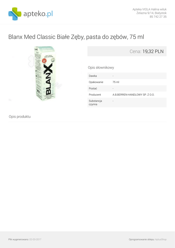 Apteka VIOLA Halina wiluk Żelazna 9/14, Białystok 85 742 27 35 Blanx Med Classic Białe Zęby, pasta do zębów, 75 ml Cena: 19,32 PLN Opis słownikowy Dawka - Opakowanie 75 ml Postać - Producent A.B.BERREN-HANDLOWY SP. Z O.O. Substancja czynna - Opis produktu Plik wygenerowano: 02-03-2017 Powered by TCPDF (www.tcpdf.org) Oprogramowanie sklepu: AptusShop
