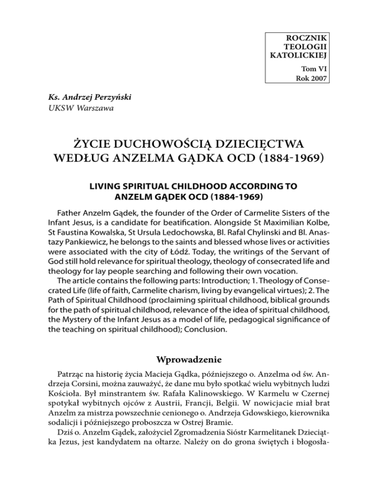 Rocznik Teologii Katolickiej Tom VI Rok 2007 Ks. Andrzej Perzyński UKSW Warszawa Życie duchowością dziecięctwa według Anzelma Gądka ocd (1884-1969) Living spiritual childhood according to Anzelm Gądek OCD (1884-1969) Father Anzelm Gądek, the founder of the Order of Carmelite Sisters of the Infant Jesus, is a candidate for beatification. Alongside St Maximilian Kolbe, St Faustina Kowalska, St Ursula Ledochowska, Bl. Rafal Chylinski and Bl. Anastazy Pankiewicz, he belongs to the saints and blessed whose lives or activities were associated with the city of Łódź. Today, the writings of the Servant of God still hold relevance for spiritual theology, theology of consecrated life and theology for lay people searching and following their own vocation. The article contains the following parts: Introduction; 1. Theology of Consecrated Life (life of faith, Carmelite charism, living by evangelical virtues); 2. The Path of Spiritual Childhood (proclaiming spiritual childhood, biblical grounds for the path of spiritual childhood, relevance of the idea of spiritual childhood, the Mystery of the Infant Jesus as a model of life, pedagogical significance of the teaching on spiritual childhood); Conclusion. Wprowadzenie Patrząc na historię życia Macieja Gądka, późniejszego o. Anzelma od św. Andrzeja Corsini, można zauważyć, że dane mu było spotkać wielu wybitnych ludzi Kościoła. Był minstrantem św. Rafała Kalinowskiego. W Karmelu w Czernej spotykał wybitnych ojców z Austrii, Francji, Belgii. W nowicjacie miał brat Anzelm za mistrza powszechnie cenionego o. Andrzeja Gdowskiego, kierownika sodalicji i późniejszego proboszcza w Ostrej Bramie. Dziś o. Anzelm Gądek, założyciel Zgromadzenia Sióstr Karmelitanek Dzieciątka Jezus, jest kandydatem na ołtarze. Należy on do grona świętych i błogosła- Życie duchowością dziecięctwa według Anzelma Gądka OCD 85 wionych, którzy życiem swoim lub działalnością przeszli przez miasto Łódź, a są to: św. Maksymilian Kolbe, św. Faustyna Kowalska, św. Urszula Ledóchowska, bł. Rafał Chyliński, bł. Anastazy Pankiewicz. 1. Teologia życia konsekrowanego Pismom sługi Bożego o. Anzelma Gądka przypisuje się wielką wartość w teologii życia konsekrowanego, a zwłaszcza wymiarowi życia wspólnotowego i profesji rad ewangelicznych. Powołanie do życia zakonnego było jednym z najbardziej cenionych darów, o jakich był przeświadczony. Charyzmat zakonu karmelitańskiego przyjęty przez o. Anzelma do swojego życia, realizowany na poszczególnych etapach, wydał takie owoce, że z woli Boga, jemu samemu powierzono kształtowanie charyzmatu w duchowości innych. Było to kształtowanie wymagające, choć pełne miłości, uwzględniające osobiste możliwości człowieka. Stając się założycielem wspólnoty zakonnej, skupił wokół swojej myśli duchowości dziecięctwa Bożego ludzi, o których wiedział, że taką łaskę powołania otrzymali od Boga. Sługa Boży stał się ojcem powołanych. Życie w wierze Chrześcijańska duchowość wyrasta, jak z ziarna w glebie, z nadprzyrodzonej łaski oraz z korzeni cnót teologalnych wiary, nadziei i miłości. Powołując się na naukę Soboru Trydenckiego, o. Anzelm uczył, że wiara jest drogowskazem i światłem na drodze człowieka. Trzeba nią iść, by dojść do nieba. Przestrzegał przed wiarą martwą, anemiczną, tj. niedożywioną poznaniem prawd Bożych. Postulował wiarę światła, która by ingerowała w piękno świata nadprzyrodzonego i w umiejętność przestawania z Bogiem. Ojciec Anzelm był też człowiekiem nadziei. W latach największego prześladowania Kościoła przez totalitarny reżim komunistyczny, podtrzymywał na duchu siostry, mówiąc, że jednak Dzieciątko Jezus zwycięży. Nadzieja była tajemnicą jego dynamizmu apostolskiego. W nadziei wiecznego zbawienia o. Anzelm najbardziej radował się myślą, że po śmierci spełnią się jego pragnienia miłości, że dopiero tam będzie bez przeszkód mógł kochać Boga doskonale. Miłość uważał o. Anzelm za najważniejszą siłę duchowego dynamizmu. Gdy rozważał z siostrami Zgromadzenia ich działalność zewnętrzną, często zachęcał do tego, aby puszczać w ruch rozum, wolę, zdolności naturalne i wlane przez Boga, tj. cnoty, a najbardziej wiarę, nadzieję i miłość. Zwykł on mawiać: „Miłość nadaje ruch i życie całemu działaniu nadprzyrodzonemu. Miłość to sprawia, że kochamy Boga tą miłością, jaką on sam Siebie miłuje. Miłość jest najpiękniejszą cnotą, życiem cnót, życiem duszy, niebem w niebie, i Bogiem w Bogu”. Aktualność pism o. Anzelma odnotowuje się zarówno na płaszczyźnie teologii duchowości, teologii życia konsekrowanego i teologii świeckich, szukających i dążących drogą własnego powołania do Boga. 86 Ks. Andrzej Perzyński Teologia życia konsekrowanego jest bardzo mocno zaznaczona w dziełach tego sługi Bożego. Wypływa w jego ujęciu ze sposobu patrzenia na własne życie, jak i na życie drugich tak dalece, że cechy dojrzałej osobowości stanowią podstawę do zaproponowania formacji i włączenia w apostolstwo tych, dla których droga takiej duchowości jest impulsem do podjęcia powołania. Zaznaczyć zatem należy, że rozwój Zgromadzenia Sióstr Karmelitanek Dzieciątka Jezus, tak piękny i bogaty we wspólnocie Kościoła, jest zapewne owocem i doświadczeniem prowadzenia duchowego ze strony o. Anzelma: w aspekcie historycznym za jego życia i wstawiennictwem przed Bogiem po jego śmierci. Teologicznym aspektem łączącym życie tego sługi Bożego z życiem tych, którzy go naśladują, jest cnota miłości, ukazana w sposób heroiczny w życiu jego samego, jak i domagająca się heroizmu w życiu tych, którzy tę drogę podejmują. Dokonuje się zatem utożsamiający charakter pomiędzy o. Anzelmem a jego duchowymi dziećmi. Jest to więc z jednej strony droga ojcostwa duchowego, jak i droga wsp