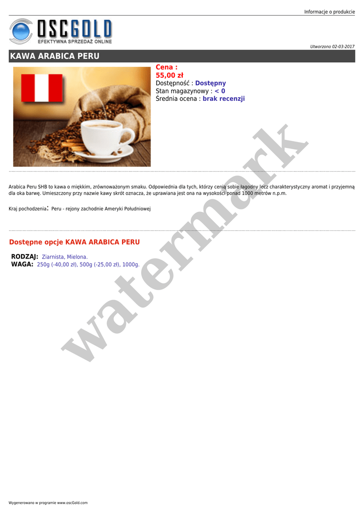 Informacje o produkcie Utworzono 02-03-2017 KAWA ARABICA PERU Cena : 55,00 zł er m ar k Dostępność : Dostępny Stan magazynowy : < 0 Średnia ocena : brak recenzji Arabica Peru SHB to kawa o miękkim, zrównoważonym smaku. Odpowiednia dla tych, którzy cenią sobie łagodny lecz charakterystyczny aromat i przyjemną dla oka barwę. Umieszczony przy nazwie kawy skrót oznacza, że uprawiana jest ona na wysokości ponad 1000 metrów n.p.m. : Kraj pochodzenia Peru - rejony zachodnie Ameryki Południowej Dostępne opcje KAWA ARABICA PERU w at RODZAJ: Ziarnista, Mielona. WAGA: 250g (-40,00 zł), 500g (-25,00 zł), 1000g. Wygenerowano w programie www.oscGold.com
