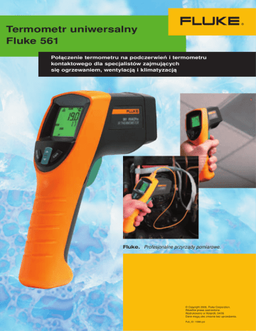 Termometr uniwersalny Fluke 561 Połączenie termometru na podczerwień i termometru kontaktowego dla specjalistów zajmujących się ogrzewaniem, wentylacją i klimatyzacją Fluke. Profesjonalne przyrządy pomiarowe. © Copyright 2006, Fluke Corporation. Wszelkie prawa zastrzeżone. Wydrukowano w Holandii, 04/06 Dane mogą ulec zmianie bez uprzedzenia. Pub_ID: 11086-pol Termometr uniwersalny Fluke 561 Połączenie termometru na podczerwień i termometru kontaktowego dla specjalistów zajmujących się ogrzewaniem, wentylacją i klimatyzacją Prosty w użyciu termometr Fluke 561 HVACPro to uniwersalne urządzenie łączące w sobie funkcje pomiaru, których potrzebują specjaliści podczas prac związanych z rozwiązaniami grzewczymi, wentylacyjnymi i klimatyzacyjnymi. Umożliwia pomiar temperatury za pomocą podczerwieni oraz kontaktowy, dzięki czemu nie ma potrzeby używania kilku oddzielnych narzędzi pomiarowych. Termometr na podczerwień służy do natychmiastowego pomiaru temperatur obiektów gorących, znajdujących się w ruchu, zasilanych prądem elektrycznym oraz trudno dostępnych — bez potrzeby korzystania z drabiny. Do przeprowadzenia kontaktowego pomiaru temperatury służy wchodząca w skład zestawu sonda przyczepiana na rzep lub inna dostępna termopara przemysłowa typu K ze złączem 'mini'. • Do szybkich pomiarów z bliska lub z • • • • • • • odległości służy termometr na podczerwień Jednopunktowy celownik laserowy Prosta regulacja emisyjności umożliwiająca dokładniejszy pomiar temperatur rur i przewodów Do urządzenia dołączona jest sonda przyczepiana na rzep do pomiarów kontaktowych powierzchniowych temperatur przegrzewania i dochładzania Zgodny ze wszystkimi standardowymi termoparami typu K ze złączem 'mini' Odczyt MIN./MAKS. i RÓŻNICY temperatur Lekki (tylko 340 gramów) i przenośny Przewodnik po pomiarach HVAC/R w zestawie Parametry techniczne produktu Fluke 561 Termometr Fluke 561 ma wszystko, czego potrzeba do natychmiastowego przeprowadzenia pomiarów. Zakres temperatury -40 do 550°C Rozdzielczość wyświetlacza 0,1° odczytu O:P 12:1 (Odległość od punktu pomiaru/rozdzielczość optyczna) Łatwa regulacja współczynnika emisyjności Ustawienia: niska (0,3), średnia (0,7), wysoka (0,95) Dokładność wyświetlania (przy zakładanej zewnętrznej temperaturze eksploatacji 23 do 25°C ± 1% odczytu lub ± 1°C, wyższa z dwóch wartości; poniżej 0°C, ± 1°C, ± 1°/1° Czas reakcji 500 ms (95% lub odczyt) Powtarzalność pomiaru ± 0,5% odczytu lub ± 1°C, wyższa z dwóch wartości Zakres widma 8 do 14 µm Celownik laserowy Jednopunktowy laserowy Wyłączanie lasera Laser jest wyłączany, jeśli zewnętrzna temperatura przekracza 40°C Moc lasera Klasa 2 (II); Moc < 1 mW, długość fali 630-670 nm Wilgotność względna 10 do 90% wilgotności względnej bez kondensacji, przy < 30°C Zasilanie 2 baterie AA (alkaliczne lub NiCD) Zatrzymanie wskazań wyświetlacza 7 sekund Podświetlany ekran Tak, ekran LCD wyświetlający dwa pomiary (temperatura bieżąca i MAKS./MIN./RÓŻNICA/ŚR.), wskaźnik rozładowania baterii, wskazania w stopniach Celsjusza/Fahrenheita i opcje pomiaru/wstrzymania Temperatura eksploatacji 0 do 50°C Temperatura przechowywania -20 do 65°C MAKS., MIN., RÓŻNICA temperatur Tak Wejście końcówki 'mini' termopary typu K Tak, zgodne z przemysłowymi termoparami typu K ze złączem 'mini' Sonda przyczepiana na rzep zgodna z termoparami typu K Tak, obsługa zakresu temperatur 0-100°C z dokładnością ± 2,2°C Przewodnik po pomiarach HVAC/R Tak Czas pracy na bateriach alkalicznych: 12 godzin Wymiary (wys. x dł. x szer.): 176,9 x 163,6 x 518 mm Waga: 340 gramów Dwuletni okres gwarancji Opcjonalne akcesoria Model Właściwości H6 Futerał na termometr na podczerwień • Zaczep umożliwiający noszenie na pasku • Zamykany na rzepy — łatwe otwieranie i bezpieczne zamknięcie • Termopara typu K do wszechstronnych zastosowań • Zakres pomiarów: -40 do 260°C 80PK-1 Sonda paciorkowa Dołączone akcesoria Sonda przyczepiana na rzep zgodna z termoparami typu K, podręczna torba przenośna, 2 baterie AA oraz instrukcja użytkownika z przewodnikiem po pomiarach Informacje dotyczące zamawiania Termometr Fluke-561 HVACPro 80PK-3A Sonda powierzchniowa • Termopara typu K do pomiarów płaskich lub zakrzywionych powierzchni, np. płyt i rolek • Zakres pomiarów: 0 do 260°C 80PK-EXT Zestaw przewodów przedłużających • Do przedłużania lub naprawy przewodów termopar typu K • Maksymalna ciągła temperatura pracy: 260°C • Zgodne z termometrami wykorzystującymi termopary typu K 80CK-M Mini złącza typu K, męskie • Izotermiczna końcówka dla przewodów typu K • Pasuje do termopar do 20 mA 80PK-8 Sonda z zaciskiem do pomiaru temperatury rur • Termopara typu K do szybkich pomiarów temperatur i kontroli przegrzewania powierzchni rur • Zakres pomiarów: -29 do 149°C, rury o średnicy 6,4 - 34,9 mm 80PK-22 Sonda zanurzeniowa SureGrip • Termopara typu K do pomiarów w płynach i żelach • Zakres pomiarów: -40 do 1090°C 80PK-24 Sonda powietrzna SureGrip • Termopara typu K do pomiarów temperatur powietrza i gazów nieżrących • Zakres pomiarów: -40 do 816°C 80PK-25 Sonda z ostrym zakończeniem SureGrip • Termopara typu K dla przemysłu spożywczego, pomiarów temperatur w płynach i żelach • Zakres pomiarów: -40 do 350°C 80PK-26 Sonda ze stożkową końcówką SureGrip • Termopara typu K ze stożkową końcówką do pomiarów temperatur powietrza, gazów nieżrących oraz temperatur powierzchniowych • Zakres pomiarów: -40 do 816°C 80PK-27 Przemysłowa sonda powierzchniowa SureGrip • Termopara typu K do pomiarów temperatur powierzchniowych w trudnych warunkach • Zakres pomiarów: -127 do 600°C
