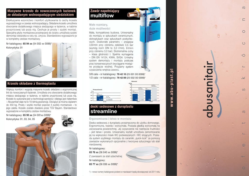 a n o Małe rozmiary, duże możliwości D"! MAX$). %.)3/ +LASAGOuNOuCI) 0RZEPUSTOWOu½ LS :AWÊR NAPENIAJCY :AWÊR NAPENIAJCY :AWÊR NAPENIAJCY MIN$). %.)3/ BAR BAR BAR deski sedesowe z duroplastu streamline r Deska sedesowa z duroplastu przeznaczona do użytku domowego. Ergonomiczna, twarda i wytrzymała. Posiada gładką wytrzymałą na zarysowania powierzchnię. Jej czyszczenie nie nastręcza trudności – jest łatwe i proste. Uniwersalny kształt umożliwia zamontowanie jej na większości misek WC podwieszanych i WC stojących. Posiada system szybkiego montażu do ceramiki „quick-lock” za pomocą zawiasów wykonanych opcjonalnie z tworzywa sztucznego lub stali nierdzewnej. Nr katalogowy: 65 76 xx (56 040 xx 0099)* Z zawiasami ze stali szlachetnej Nr katalogowy: 65 77 xx (56 036 xx 0099)* t Ergonomiczna i łatwa w montażu o Większy komfort i wygodę masywne krzesło składane o ergonomicznej linii do nowoczesnych łazienek. Umożliwia ono stworzenie dodatkowego miejsca siedzącego w łazience, w kabinie prysznicowej lub poza nią. Krzesło to wykonane jest w technologii sandwicz i dlatego jest niełamliwe – Abusanitair daje na to 10-letnią gwarancję. Obciążyć je można ciężarem do 450 kg. Prosty i szybki montaż poprzez 4 punkty montażowe – to jego zaleta. Krzesło zostało zbadane przez TÜV Bayern. Standardowo wyposażone w kompletny zestaw montażowy. Nr katalogowy: 65 90 xx (54 001xx 0099)* Kolorystyka: 01, 03, 04, 05 MAX$). %.)3/ +LASAGOuNOuCI) s 'OuNOu½ Krzesło składane z thermoplastu a 3/8 cala – nr katalogowy: 79 42 10 (25 001 00 0099)* 1/2 cala – nr katalogowy: 79 42 09 (25 002 00 0099)* k r ó c Mała, kompaktowa budowa. Uniwersalny do montażu w spłuczkach ceramicznych, dolnopłukach oraz spłuczkach podtynkowych. Doskonałe parametry – przepływ 3,6l/min przy ciśnieniu zaledwie 0,5 bar (wymóg norm DIN to 3,0 l/min), 9 l/min przy ciśnieniu 3,0 bar). Ekstremalnie cichy – klasa głośności I. Spełnia wymagania – DIN EN 14124, KIWA, SVGA. Unikalny system demontażu i montażu podczas prac konserwacyjnych (wyciągane mosiężne przyłącze wodne). Przyjazny system czyszczenia wnętrza zaworu. e Nr katalogowy: 65 94 xx (54 002 xx 0099)* Kolorystyka: 01 multiflow f Ekskluzywne wzornictwo i komfort użytkowania to cechy krzesła wyposażonego w zawias wolnoopadający. Składane krzesło umożliwia stworzenie dodatkowego miejsca siedzącego w łazience, w kabinie prysznicowej lub poza nią. Cechuje je prosty i szybki montaż. Specjalna płyta montażowa przykręcana do ściany umożliwia szybki demontaż siedziska w celu np. umycia. Standardowo wyposażono je w kompletny zestaw montażowy. Zawór napełniający w w w. a b u - p l a s t . p l Masywne krzesło do nowoczesnych łazienek ze składanym wolnoopadającym siedziskiem *) – nowe numery katalogowe podane w nawiasach będą obowiązywać od 2011 roku Zlewy gospodarcze ABU-Plast – 10 lat gwarancji. Zlewy gospodarcze Abu plast wykonane są z odpornego na możliwość wystąpienia pęknięć wysokogatunkowego pilipropylenu, są odporne na działanie mrozu, gorącej wody, roztworów ługów, kwasów i zasad. Zastosowanie technologii „sandwich” zapewnia im ekstremalną wytrzymałość na uszkodzenia. Nie posiadają zagłębień gdzie mógłby się zbierać brud i ostrych krawędzi. Jedwabiście matowa powierzchnia jest łatwa w utrzymaniu w czystości. Każdy z modeli zlewów wyposażony jest w system odpływowo-przelewowy, elementy montażowe oraz szablon ułatwiający montaż. Zlew przyścienny Praktyczny zlew z fartuchem ściennym do zastosowań w piwnicy, garażu, ogrodzie lub warsztacie. Nr katalogowy: 70 02 xx (60 001 xx 0099)* Kolorystyka: 01, 24 Akcesoria do zlewozmywaka przyściennego: Kratka składana wykonana z odpornego na uderzenia tworzywa sztucznego. Nr katalogowy: 70 06 98 (60 002 00)* kolor: 98 Komora pralnicza Komora o szerokości 61 cm wykonana w technologii sandwicz z polipropylenu odpornego na uderzenia. Standardowo wyposażona w zawór odpływowy 1 1/2”, sitko, korek, łańcuszek i elementy mocujące. Nr katalogowy: 70 07 xx (60 003 xx 0099)* Kolorystyka: 01, 24 Akcesoria do komory pralniczej: Kratka nakładana wykonana z odpornego na uderzenia tworzywa sztucznego Nr katalogowy: 70 08 98 (60 004 00 0099)* kolor: 98 *) – nowe numery katalogowe podane w nawiasach będą obowiązywać od 2011 roku Zlewozmywaki wielofunkcyjne Komora gospodarcza abu multiset maxi Nowoczesne wzornictwo i funkcjonalność czynią z niego ozdobę i mile widzianą pomoc w piwnicy, kotłowni, garażu, pralni, ogrodzie i w innych miejscach. Przy lewej i prawej krawędzi umiejscowiono uchwyty na ręczniki. Zamocować na nich można także 2 haki do montażu akcesoriów takich, jak półka i odkapnik. Akcesoria i montaż Multiset wyposażono w zintegrowany reling do zamocowania dodatkowych haków na mały ręcznik oraz półkę na mydło. Szeroka półka zlewu umożliwia postawienie środków czyszczących, umożliwia zamontowanie baterii stojącej lub dozownika na mydło. Nr katalogowy: 71 21 xx (60 005 xx 0099)* Kolorystyka: 01, 24 Użyteczna gdy jest potrzebna duża komora gospodarcza montowana obok pralki, w suterenie, kotłowni, garażu, pralni, warsztacie, ogrodzie etc. Jej duże wymiary: 700x500x250 mm i pojemność 33 litrów sprawiają, że w pomieszczeniach gospodarczych staje się niezastąpiona. Komora posiada półkę, która jest technologicznie przygotowana do montażu np. dozownika do mydła lub baterii zlewozmywakowej stojącej. Wygodna półka pod komorą zapewnia możliwość przechowywania np. środków czystości lub innych akcesoriów. Komora gospodarcza „maxi” Nr katalogowy: 71 51 xx (60 007 xx 0099)* Komora gospodarcza „maxi”, wersja z lejkiem, do zastosowań laboratoryjnych, komora bez przelewu Nr katalogowy: 71 50 xx (60 008 xx 0099)* Kolorystyka: 01, 24 Akcesoria do 71 50 xx: 2” lejek odpływowy o długości 165 mm Zlewozmywak abu compact Compact to k