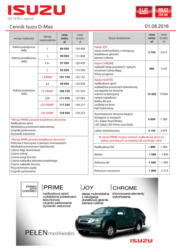 Od 1916 z Japonii 01.08.2016 Cennik Isuzu D-Max wersja nadwozia wersja wyposażenia cena netto zł cena brutto zł Kabina pojedyncza 4WD L 84 950 104 488 L 90 950 111 868 LS+ 97 950 120 478 L 93 950 115 558 L PRIME* 101 750 125 152 LS 99 950 122 938 LS PRIME* 106 750 131 302 LSX 111 450 137 083 LSX PRIME* 117 250 144 217 LSX DARK* 129 450 159 223 Kabina przedłużona 4WD Kabina podwójna 4WD *Wersja PRIME posiada dodatkowe akcesoria: Nadbudowa sport Wykładzina przestrzeni ładunkowej Czujniki parkowania Dywaniki welurowe *Wersja DARK posiada dodatkowe akcesoria: Pokrywa z tworzywa z czarnym orurowaniem Wykładzina przestrzeni ładunkowej Czarne felgi aluminiowe Czarne relingi Czarne progi boczne Czarna nakładka zderzaka przedniego Czarne nakładki boczne Przyciemnione szyby Czujniki parkowania cena netto zł cena brutto zł Pakiet JOY stacja mulimedialna z nawigacją dodatkowe głośniki kamera cofania 3 750 4 613 Pakiet CHROME nakładki lamp przednich i tylnych ornament tylnej klapy listwy progowe 990 1218 Pakiet HUNTER nadbudowa sport wykładzina przestrzeni ładunkowej wyciągarka na skrzynię wanna na dziczyznę rampa najazdowa klatka dla psa szuflada na broń hak holowniczy 15 450 19 004 Automatyczna skrzynia biegów dostępna w wersjach: LS+ (także Pearl White) LSX (takźe LSX Prime oraz Dark) 6 000 7 380 Lakier metalizowany 3 150 3 874 Opcje dodatkowe W wersji PRIME możesz zmienić nadbudowę sport na jedną z poniższych za dopłatą lub uzyskując rabat Nadbudowa full + 800 + 984 Roleta - 1 500 - 1 845 Pokrywa alu -1 300 - 1 599 Pokrywa z tworzywa - 1 800 - 2 214 L S LS S LS+ S LSX S/S S S S S S S S S S S S S S S S S S S S S S S S S S S S S S S S S S S S S S S S S S S S S S S S S S S S S S S S S S S S S S S S S S S S S S S S S S S S S S S S S S - - - S - S - S S S - - - -/S -/S S/- S/- S S -/S S S S/- S S -/S S S -/S - S S S/S S S S S S S S/S S S S S S - - - - - - S - S S S S S S S S S S S S S S S S S KOMFORT Immobiliser / autoalarm System zapobiegający blokowaniu kół podczas hamowania - ABS System elektronicznego rozdziału siły hamowania - EBD System stabilizacji toru jazdy - ESC System kontroli trakcji - TCS Przednie poduszki powietrzne (kierowca, pasażer) Boczne poduszki powietrzne Przednie pasy bezpieczeństwa zintegrowane z systemem SRS Regulacja wysokości przednich pasów bezpieczeństwa Tylne pasy bezpieczeństwa Kurtynowe poduszki powietrzne System bezpieczeństwa biernego - SRS w połączeniu z poduszkami powietrznymi Kontrolka zapięcia pasów bezpieczeństwa ISOFIX - kabina podwójna Zaczep do holownaia (przód) Osłona miski olejowej Osłona skrzynki rozdzielczej Osłona zbiornika paliwa Teleskopowa kolumna kierownicza Poszerzone błotniki Uchwyty wewnętrzne skrzyni ładunkowej - kabina przedłużona i podwójna Uchwyty zewnętrzne skrzyni ładunkowej - kabina pojedyncza Centralna klamka tylnej klapy czarna / w kolorze Centralna klamka tylnej klapy w kolorze nadwozia Centralna klamka tylnej klapy (chromowana) Boczne klamki tylnej klapy (w kolorze nadwozia) kabina pojedyncza Antena (montowana na dachu centralnie z przodu / z boku) Światła do jazdy dziennej Światła do jazdy dziennej z lampami przeciwmgielnymi Reflektory (światła mijania i drogowe) halogenowe Reflektory (światła mijania i drogowe) projekcyjne Światła przeciwmgielne przednie / tylne Przedni zderzak z szarego tworzywa Przedni zderzak w kolorze nadwozia Tylny zderzak z ochronnymi nakładkami Chromowane wykończenie tylnego zderzaka Przedni grill z tworzywa czarnego / szarego Przedni grill chromowany Lusterka boczne w obudowie z szarego tworzywa sterowane manualnie Progi boczne Lusterka boczne w obudowie chromowanej ogrzewane, sterowane elektrycznie z kierunkowskazami Chromowana listwa na przedniej masce Chromowane progi boczne Zamek centralny Zamek centralny sterowany z kluczyka Tylne światła LED Trzecie światło stop AUDIO STYLIZACJA BEZPIECZEŃSTWO Specyfikacja Osłona tylnej ściany kabiny - kabina pojedyncza Uchwyty w słupkach A Kolumna kierownicza z regulacją kąta pochylenia Kierownica i uchwyt dźwigni zmiany biegów z tworzywa Kierownica i uchwyt dźwigni zmiany biegów skórzane Wspomaganie kierownicy Tempomat sterowany z kierownicy Zegar Przednie szyby sterowane elektrycznie Tylne szyby sterowane elektrycznie - kabina podwójna System zapobiegający przytrzaśnięciu palców po stronie kierowcy Ogrzewana tylna szyba Tryb przerywany pracy wycieraczek Regulowany tryb pracy wycieraczek Uchwyty na napoje Drzwi przednie/deska rozdzielcza/pomiędzy przednimi fotelami Osłony przeciwsłoneczne kierowcy i pasażera Podnóżek kierowcy Otwieranie wlewu paliwa z wnętrza pojazdu Klimatyzacja manualna Klimatyzacja automatyczna Popielniczka i zapalniczka Gniazdo 12V w schowku po stronie pasażera Schowek pasażera / zamykany na kluczyk Wieszak na ubranie Regulowane zagłówki 2 składane tylne siedzenia - kabina przedłużona Tylna kanapa składana oraz dzielona (60/40 – siedzisko) – kabina podwójna Schowki w oparciach przednich foteli Podłokietnik w tylnej kanapie Lampka oświetlenia wnętrza Lampki do czytania dla kierowcy i pasażera przód / tył Regulowana wysokość fotela kierowcy Tapicerka skórzana Fotel kierowcy z elektryczną regulacją położenia Ogrzewane fotele przednie Wskaźniki z multifunkcyjnym wyświetlaczem centralnym Schowek w konsoli centralnej Schowek w konsoli centralnej z podłokietnikiem Deska rozdzielcza z chromowanymi elementami Radio CD / mp3 System głośników System Live Surround Bluetooth Wejście AUX oraz mini USB System audio sterowany z kierownicy L S S S LS S S LS+ S S S S - - S S S S S S S S S S S S S S S S S S S S S S S S S S - S S - S S S S S/S- S/S/S S/S/S S/S/S S S S S S S S S S S S S S S S S S S S - S S S S S S S/S S S S S S S S S S S/S S S - S S - S S - S S S/S - S S S/S S - S S S S/S S S S S - - S S S S - S S S - S S S S S S S - S S S S S S S S Kolory Ash Beige Met Nautilus Blue Mica Cosmic Black Mica Venician Red Mica Mineral Gra