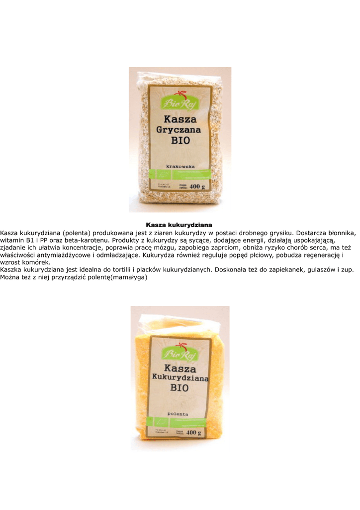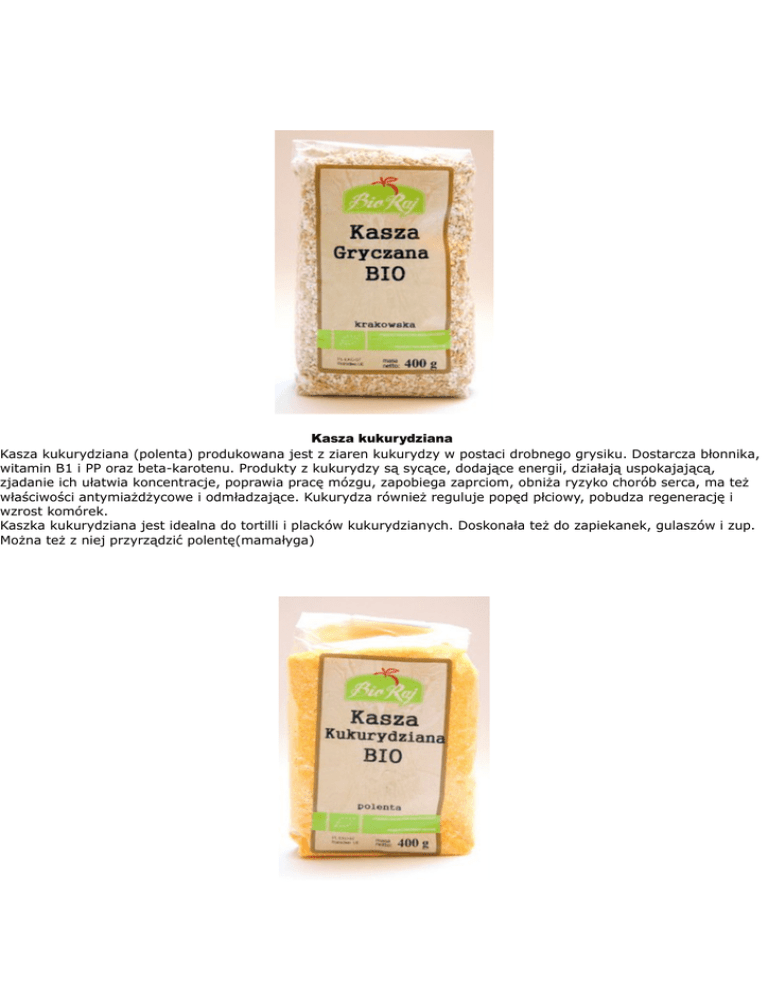 Kasza kukurydziana Kasza kukurydziana (polenta) produkowana jest z ziaren kukurydzy w postaci drobnego grysiku. Dostarcza błonnika, witamin B1 i PP oraz beta-karotenu. Produkty z kukurydzy są sycące, dodające energii, działają uspokajającą, zjadanie ich ułatwia koncentracje, poprawia pracę mózgu, zapobiega zaprciom, obniża ryzyko chorób serca, ma też właściwości antymiażdżycowe i odmładzające. Kukurydza również reguluje popęd płciowy, pobudza regenerację i wzrost komórek. Kaszka kukurydziana jest idealna do tortilli i placków kukurydzianych. Doskonała też do zapiekanek, gulaszów i zup. Można też z niej przyrządzić polentę(mamałyga) Kasza gryczana palona Ekologiczna kasza gryczana palona to doskonały dodatek do dań mięsnych i wegetariańskich, uzupełniona sosem i surówką stanowi pełnowartościowy posiłek. Kasza gryczana zawiera dużo białka, tłuszczu, węglowodanów. Spożywanie kaszy gryczanej uznawane jest za bardzo korzystne dla prawidłowego funkcjonowania organizmu. Po pierwsze dostarcza wiele niezbędnych minerałów i mikroelementów, po drugie jest źródłem licznych witamin. Po trzecie w ziarnach gryki są związki spełniające rolę przeciwutleniaczy, które zapobiegają występowaniu alergii, miażdżycy, zawałom serca, nowotworom. Warto, by kaszę gryczaną jadały osoby uskarżające się na dolegliwości nerek, nadciśnienie tętnicze oraz dolegliwości serca. Naukowcy zaliczyli kaszę gryczaną do najlepszych kasz, jeśli chodzi o właściwości odżywcze i leczniczodietetyczne. Kasza gryczana niepalona Ekologiczna kasza gryczana niepalona to doskonały dodatek do dań mięsnych i wegetariańskich, uzupełniona sosem i surówką stanowi pełnowartościowy posiłek. Zawiera dużo białka, tłuszczu, węglowodanów. Spożywanie kaszy gryczanej uznawane jest za bardzo korzystne dla prawidłowego funkcjonowania organizmu. Po pierwsze dostarcza wiele niezbędnych minerałów i mikroelementów, po drugie jest źródłem licznych witamin. Po trzecie w ziarnach gryki są związki spełniające rolę przeciwutleniaczy, które zapobiegają występowaniu alergii, miażdżycy, zawałom serca, nowotworom. Warto, by kaszę gryczaną jadały osoby uskarżające się na dolegliwości nerek, nadciśnienie tętnicze oraz dolegliwości serca. Naukowcy zaliczyli kaszę gryczaną do najlepszych kasz, gdy chodzi o właściwości odżywcze i leczniczodietetyczne. Kasza gryczana niepalona jest łagodniejsza w smaku od kaszy gryczanej palonej. Kasza Bulgur Ekologiczna kasza Bulgur sporządzona z gotowanych i następnie wysuszonych ziaren pszenicy twardej, często używany w kuchni tureckiej i bliskowschodniej. Jest bardzo pożywny, dzięki czemu z powodzeniem może zastępować Kuskus lub ryż. Przez namoczenie w mleku i pokrycie mąką uzyskuje się z niego tradycyjny turecki kuskus. Zalety kaszy Bulgur: • Zawiera sporo białka wspomagającego odchudzanie i przy tym niewiele tłuszczów. Ma niski indeks glikemiczny (IG) - 46, nie powoduje więc gwałtownych skoków poziomu cukru we krwi i daje uczucie sytości na długo. To zaś sprawia, że jest sprzymierzeńcem osób dbających o linię oraz diabetyków. • Wyróżnia się bardzo dużą zawartością błonnika, który reguluje trawienie i może zapobiegać zaparciom, a nawet nowotworom okrężnicy. • Jest dobrym źródłem witamin z grupy B i kwasu foliowego oraz magnezu, żelaza i fosforu. Dlatego powinny go często jadać kobiety w ciąży i karmiące piersią. Kasza jaglana Kasza jaglana zawiera pełnowartościowe białko (wszystkie osiem aminokwasów) oraz rzadko spotykaną krzemionkę, która ma zbawienny wpływ na stawy, skórę, włosy i paznokcie. Kasza jaglana jest zalecana w żywieniu osób cierpiących na schorzenia sercowo-naczyniowe oraz choroby wątroby. Kasza jaglana pobudza też proces krwiotwórczy oraz ma działanie antywirusowe. Kasza jaglana ugotowana na sypko jest doskonałym dodatkiem do mięs, sosów, dobrze smakuje też na słodko z dodatkiem owoców. Kasza kuskus Kasza kuskus to wspaniała podstawa do dań mięsnych, warzywnych oraz sałatek. Ziarenka kuskusu są w świecie muzułmańskim symbolem bogactwa i szczęścia. Jest to drobna kasza pszeniczna, która w Afryce Północnej do tej pory wytwarzana jest ręcznie. Kaszka orkiszowa, manna razowa Kaszka orkiszowa, manna razowa – drobna kaszka z pełnego ziarna orkiszu,znanego ze swych zdrowotnych właściwości, który posiada optymalną zawartość jakościową i ilościową składników tj. białko, błonnik, węglowodany, sole mineralne, pierwiastki śladowe, elektrolity, nienasycone kwasy tłuszczowe, witaminy i biopierwiastki. Orkisz posiada więcej pozytywnie wpływających na nasz organizm składników niż zboża innych odmian. Orkisz jest lekkostrawny i łatwoprzyswajalny, Orkisz wzmacnia ciało, pozytywnie wpływa na krążenie krwi. Zaleca się go przy przemęczeniu, alergiach oraz chorobach wątroby i nerek, zapobiega też powstawaniu kamieni żółciowych. Dieta oparta na orkiszu pozwala obniżyć poziom cholesterolu we krwi Kaszka ta jest wyjątkowo łatwostrawna, wykonana jak manna, doskonała do kaszek, puddingów i deserów, a także idealna do sporządzenia zupy orkiszowej Świętej Hildegardy z Bingen. Kaszka orkiszowa, manna jasna Kaszka orkiszowa manna to drobna kaszka z obłuszczonego ziarna orkiszu,znanego ze swych zdrowotnych właściwości, który posiada optymalną zawartość jakościową i ilościową składników tj. białko, błonnik, węglowodany, sole mineralne, pierwiastki śladowe, elektrolity, nienasycone kwasy tłuszczowe, witaminy i biopierwiastki. Orkisz posiada więcej pozytywnie wpływających na nasz organizm składników niż zboża innych odmian. Orkisz jest lekkostrawny i łatwoprzyswajalny, Orkisz wzmacnia ciało, pozytywnie wpływa na krążenie krwi. Zaleca się go przy przemęczeniu, alergiach oraz chorobach wątroby i nerek, zapobiega też powstawaniu kamieni żó