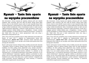 Ryanair – Tanie linie oparte na wyzysku pracowników Ryanair – Tanie linie oparte na wyzysku pracowników Jako konsumenci, chcemy kupować jak najtaniej, zwłaszcza jeśli sami niewiele zarabiamy. Więc oczywiście, gdy firmy takie jak Ryanair oferują tańsze bilety lotnicze, nawet za cenę złotówki, wszyscy myślą, że to jest wspaniała okazja. Warto się jednak zastanowić, w jaki sposób te są w stanie zaoferować takie warunki i jakie są tego możliwe konsekwencje. Jedną z konsekwencji nacisku na niskie ceny jest ciągłe poszukiwanie najtańszego z możliwych modeli zatrudnienia. Chodzi więc o urągające godności ludzkiej zakłady pracy w Bangladeszu i Europie, rozmaite sztuczki pozwalające na unikanie płacenia świadczeń pracownikom i zaniżanie ich płac. Dzięki temu, firma jest w stanie zaproponować niskie ceny usług a jednocześnie maksymalizować zysk. Jako konsumenci, chcemy kupować jak najtaniej, zwłaszcza jeśli sami niewiele zarabiamy. Więc oczywiście, gdy firmy takie jak Ryanair oferują tańsze bilety lotnicze, nawet za cenę złotówki, wszyscy myślą, że to jest wspaniała okazja. Warto się jednak zastanowić, w jaki sposób te są w stanie zaoferować takie warunki i jakie są tego możliwe konsekwencje. Jedną z konsekwencji nacisku na niskie ceny jest ciągłe poszukiwanie najtańszego z możliwych modeli zatrudnienia. Chodzi więc o urągające godności ludzkiej zakłady pracy w Bangladeszu i Europie, rozmaite sztuczki pozwalające na unikanie płacenia świadczeń pracownikom i zaniżanie ich płac. Dzięki temu, firma jest w stanie zaproponować niskie ceny usług a jednocześnie maksymalizować zysk. Jedną z firmy, która jest szczególnie znana ze złego traktowania pracowników jest Ryanair. W marcu 2012 r., odbędzie się międzynarodowy tydzień akcji solidarnościowych „Ryanair Don’t Care”. Kampania została rozpoczęta przez Brytyjczyka Johna Foleya po tym, jak jego córka została wykorzystana przez firmę pracując jako stewardesa. Jedną z firmy, która jest szczególnie znana ze złego traktowania pracowników jest Ryanair. W marcu 2012 r., odbędzie się międzynarodowy tydzień akcji solidarnościowych „Ryanair Don’t Care”. Kampania została rozpoczęta przez Brytyjczyka Johna Foleya po tym, jak jego córka została wykorzystana przez firmę pracując jako stewardesa. Ryanair wykorzystuje marzenia młodych, którzy chcieliby pracować jako stewardzi i stewardessy. Dotyczy to głównie młodych kobiet, które nie mają zawodowych kwalifikacji, ale które próbują dostać jakąkolwiek pracę. Zamiast zatrudniać i szkolić personel w Wielkiej Brytanii, firma wymaga od kandydatów do pracy wpłaty 3 tys. euro tytułem pokrycia kosztów „szkolenia”. To „szkolenie”, to tak naprawdę praca, a za przywilej jej wykonywania muszą zapłacić pracownicy. Po tym „okresie szkoleniowym” (zazwyczaj 5 tygodni), niektórzy są zatrudniani na okres próbny. Lub nie. Firma zwykle zwalnia 200 osób miesięcznie. A więc schemat jest taki: nieopłacona praca, potem nisko płatna praca, a potem zwolnienie i zastąpienie przez innego pracownika. Personel pokładowy jest wciąż zmieniany, co skutecznie uniemożliwia zorganizowanie się pracowników. Ryanair wykorzystuje marzenia młodych, którzy chcieliby pracować jako stewardzi i stewardessy. Dotyczy to głównie młodych kobiet, które nie mają zawodowych kwalifikacji, ale które próbują dostać jakąkolwiek pracę. Zamiast zatrudniać i szkolić personel w Wielkiej Brytanii, firma wymaga od kandydatów do pracy wpłaty 3 tys. euro tytułem pokrycia kosztów „szkolenia”. To „szkolenie”, to tak naprawdę praca, a za przywilej jej wykonywania muszą zapłacić pracownicy. Po tym „okresie szkoleniowym” (zazwyczaj 5 tygodni), niektórzy są zatrudniani na okres próbny. Lub nie. Firma zwykle zwalnia 200 osób miesięcznie. A więc schemat jest taki: nieopłacona praca, potem nisko płatna praca, a potem zwolnienie i zastąpienie przez innego pracownika. Personel pokładowy jest wciąż zmieniany, co skutecznie uniemożliwia zorganizowanie się pracowników. Córka Johna była jedną z pracownicy, która została zwolniona prawdopodobnie tylko dlatego, żeby zrobić miejsce dla kolejnej osoby przyjętej na „szkolenie”. Zwolniono ją w trakcie pracy. Poleciała samolotem do miejsca docelowego, ale nie pozwolono jej wrócić powrotnym lotem, gdyż już została zwolniona. Jej rodzice musieli pojechać zagranicę, by ją odebrać. Rodzina była tak wzburzona, że John rozpoczął kampanię przeciw Ryanair, by zmusić firmę do zarzucenia tego procederu. Córka Johna była jedną z pracownicy, która została zwolniona prawdopodobnie tylko dlatego, żeby zrobić miejsce dla kolejnej osoby przyjętej na „szkolenie”. Zwolniono ją w trakcie pracy. Poleciała samolotem do miejsca docelowego, ale nie pozwolono jej wrócić powrotnym lotem, gdyż już została zwolniona. Jej rodzice musieli pojechać zagranicę, by ją odebrać. Rodzina była tak wzburzona, że John rozpoczął kampanię przeciw Ryanair, by zmusić firmę do zarzucenia tego procederu. Ryanair nie traktuje “szkolenia” jako okresu zatrudnienia na próbę. Tak więc ci, którzy przejdą okres „szkolenia” zostają dopiero zatrudnieni na próbę i to nie na 3 miesiące, ale na 12 miesięcy. Płaca jest znacznie niższa niż normalnie i w ciągu pierwszego roku może nawet wynosić 520 euro po potrąceniach. Ryanair nie traktuje “szkolenia” jako okresu zatrudnienia na próbę. Tak więc ci, którzy przejdą okres „szkolenia” zostają dopiero zatrudnieni na próbę i to nie na 3 miesiące, ale na 12 miesięcy. Płaca jest znacznie niższa niż normalnie i w ciągu pierwszego roku może nawet wynosić 520 euro po potrąceniach. Co więcej, personel pokładowy musi być w stanie gotowości dwa razy w tygodniu przez 19 godzin. Przez część tego czasu muszą przebywać na lotnisku. 