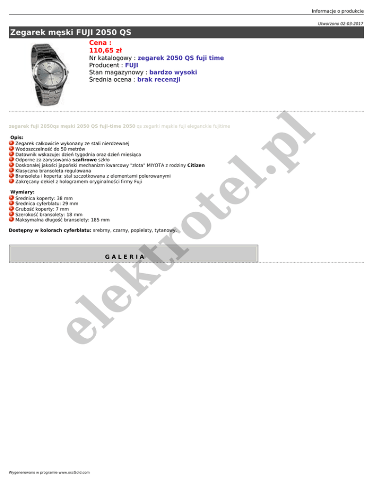 Informacje o produkcie Utworzono 02-03-2017 Zegarek męski FUJI 2050 QS Cena : 110,65 zł Nr katalogowy : zegarek 2050 QS fuji time Producent : FUJI Stan magazynowy : bardzo wysoki Średnia ocena : brak recenzji l.p l zegarek fuji 2050qs męski 2050 QS fuji-time 2050 qs zegarki męskie fuji eleganckie fujitime Opis: Zegarek całkowicie wykonany ze stali nierdzewnej Wodoszczelność do 50 metrów Datownik wskazuje: dzień tygodnia oraz dzień miesiąca Odporne za zarysowania szafirowe szkło Doskonałej jakości japoński mechanizm kwarcowy "złota" MIYOTA z rodziny Citizen Klasyczna bransoleta regulowana Bransoleta i koperta: stal szczotkowana z elementami polerowanymi Zakręcany dekiel z hologramem oryginalności firmy Fuji tr o te Wymiary: Średnica koperty: 38 mm Średnica cyferblatu: 29 mm Grubość koperty: 7 mm Szerokość bransolety: 18 mm Maksymalna długość bransolety: 185 mm Dostępny w kolorach cyferblatu: srebrny, czarny, popielaty, tytanowy. el ek GALERIA Wygenerowano w programie www.oscGold.com