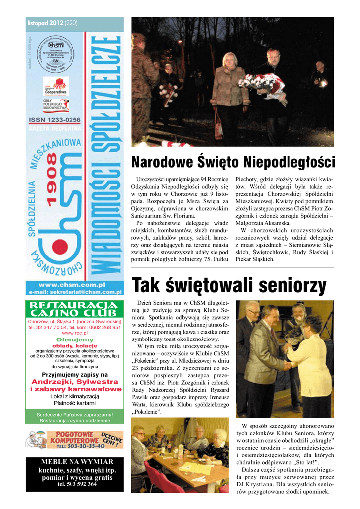 nakład: 15 000 egz. listopad 2012 (220) Narodowe Święto Niepodległości Uroczystości upamiętniające 94 Rocznicę Odzyskania Niepodległości odbyły się w tym roku w Chorzowie już 9 listopada. Rozpoczęła je Msza Święta za Ojczyznę, odprawiona w chorzowskim Sanktuarium Św. Floriana. Po nabożeństwie delegacje władz miejskich, kombatantów, służb mundurowych, zakładów pracy, szkół, harcerzy oraz działających na terenie miasta związków i stowarzyszeń udały się pod pomnik poległych żołnierzy 75. Pułku Piechoty, gdzie złożyły wiązanki kwiatów. Wśród delegacji była także reprezentacja Chorzowskiej Spółdzielni Mieszkaniowej. Kwiaty pod pomnikiem złożyli zastępca prezesa ChSM Piotr Zozgórnik i członek zarządu Spółdzielni – Małgorzata Aksamska. W chorzowskich uroczystościach rocznicowych wzięły udział delegacje z miast sąsiednich – Siemianowic Śląskich, Świętochłowic, Rudy Śląskiej i Piekar Śląskich. Tak świętowali seniorzy Chorzów, Śląska 1 (boczna Gwareckiej) Chorzów, ul. ul. Śląska 1 (boczna Gwareckiej) tel. 247 54;tel. tel.kom: kom.0602 0602 268 268 951 tel. (032) 32 247 707054, 951 www.rcc.pl www.rcc.pl Oferujemy Oferujemy obiady, kolacje obiady, kolacje organizujemyprzyjęcia przyjęcia okolicznościowe okolicznościowe organizujemy od 2 do 300 osób (wesela, komunie, stypy, itp.) od 2 do 300 osób (wesela, komunie, stypy, itp.) szkolenia, sympozja szkolenia, sympozja do wynajęcia limuzyna do wynajęcia limuzyna Przyjmujemy zapisy na DRINK-BAR Lokal z klimatyzacją poleca duży wybór alkoholi Płatność kartami Serdecznie Państwa zapraszamy! Serdecznie Państwa Restauracja czynnazapraszamy! codziennie Restauracja czynna codziennie MEBLE NA WYMIAR kuchnie, szafy, wnęki itp. pomiar i wycena gratis tel. 503 592 364 ch011k Andrzejki, Sylwestra BILARD i zabawy karnawałowe Dzień Seniora ma w ChSM długoletnią już tradycję za sprawą Klubu Seniora. Spotkania odbywają się zawsze w serdecznej, niemal rodzinnej atmosferze, której pomagają kawa i ciastko oraz symboliczny toast okolicznościowy. W tym roku miłą uroczystość zorganizowano – oczywiście w Klubie ChSM „Pokolenie” przy ul. Młodzieżowej w dniu 23 października. Z życzeniami do seniorów pospieszyli zastępca prezesa ChSM inż. Piotr Zozgórnik i członek Rady Nadzorczej Spółdzielni Ryszard Pawlik oraz gospodarz imprezy Ireneusz Warta, kierownik Klubu spółdzielczego „Pokolenie”. W sposób szczególny uhonorowano tych członków Klubu Seniora, którzy w ostatnim czasie obchodzili „okrągłe” rocznice urodzin – siedemdziesięcioi osiemdziesięciolatków, dla których chóralnie odśpiewano „Sto lat!”. Dalsza część spotkania przebiegała przy muzyce serwowanej przez DJ Krystiana. Dla wszystkich seniorów przygotowano słodki upominek. strona 2 Wiadomości Spółdzielcze ŻYCIE SPÓŁDZIELNI ŻOŁNIERZY WRZEŚNIA Administracja W październiku zakończono prace związane z remontem balkonów przy ul. Gwareckiej 65 i Łagiewnickiej 114, 116, 118, remontem węzłów centralnego ogrzewania oraz montażem zaworów regulacyjnych na instalacji c.o przy ul. Gwareckiej 19-21, 3751, 53-63, 65-71, wymianą drugiego dźwigu osobowego przy ul. Floriańskiej 24. Przeprowadzono modernizację oświetlenia oraz zakończono malowanie klatek schodowych przy ul. Kingi 39-49. Przy ul. Bocznej 6 przeprowadzono remont instalacji elektrycznej oraz wymianę opraw oświetleniowych, a przy ul. Gwareckiej 53-71 utwardzono nawierzchnię parkingów i zagospodarowano teren. Wymiana pionów wodno-kanalizacyjnych objęła budynki przy ul. Gwareckiej 21 i 39 (piony mieszkań 1-21, 2-22) oraz Watoły 11 (piony mieszkań 1-7). Rada Osiedla Omówiono analizę zaległości w opłatach w porównaniu do pozostałych Administracji oraz do poprzednich okresów rozliczeniowych. Ponieważ zaległości w opłatach wzrastają, członkowie Rady apelują do mieszkańców o terminowe dokonywanie wpłat. Omówiono stan przygotowań do sezonu grzewczego 2012/2013 oraz przeprowadzono wizytacje osiedla pod kątem oceny przygotowania budynków do zimy. Omówiono sprawy organizacyjne związane z Turniejem Tenisa Stołowego, który zostanie zorganizowany 22 listopada 2012r. w Młodzieżowym Domu Kultury przy ul. Lompy 11. Uczestnikami będą reprezentacje szkół podstawowych nr 13, 15, 17, 21. Ponadto rozpatrywano skargi i wnioski mieszkańców. CHORZÓW BATORY Administracja Zlecono naprawę kominów przy ul. Brzozowej 22-30 oraz malowanie klatki schodowej przy ul. Brzozowej 25 i Kochłowickiej 9. Wykonano naprawę systemu ochrony rynien i rur spustowych przed zamarzaniem po dewastacji przy ul. Bema 2-4, Dyrekcyjnej 2-4, St.Batorego 13, naprawę instalacji odgromowej budynków przy ul. Kaliny 91, 98, Granicznej 62-64, Karłowicza 23, 25-27, a także remont dźwigów przy ul. Kochłowickiej 9. Zgodnie z harmonogramem dokonano rocznych przeglądów instalacji gazowej, przewodów kominowych dymowych wentylacyjnych, spalinowych. Uzupełniono ubytki w żywopłotach w rejonie: Kaliny 66-68, Brzozowa 4, 6 , Brzozowa 8-20, 22-30, Strzybnego 5-5b, Orląt 3, Karwińska 3. Nasadzono drzewka przy ul. Podmiejskiej 15-25, Wrocławskiej 15-17, Zwycięstwa 3-5, Strzybnego 5-5b, Karpackiej 40a, a krzewy ozdobne przy ul. Brzozowej 7. Rada Osiedla Na październikowym posiedzeniu Rada Osiedla zapoznała się z przygotowaniem osiedla do sezonu grzewczego i zabezpieczeniem budynków przed utratą ciepła oraz omówiła sprawy bieżące. CENTRUM Administracja W październiku br. zamontowano zawory regulacyjne w węzłach centralnego ogrzewania w budynkach przy ul. Krakusa 12 i 16. Wykonano osłony balustrad ciągów komunikacyjnych galerii budynku przy ul. Krzyżowej 28. Zakończono wymianę przyłącza kanalizacji deszczowej i sanitarnej budynku przy ul. Rymera 15-17 oraz częściową wymianę pionów wodnych w budynkach przy ul. Ks. Władysława Opolskiego 9 i Słowiańskiej 8. Zakończono robot