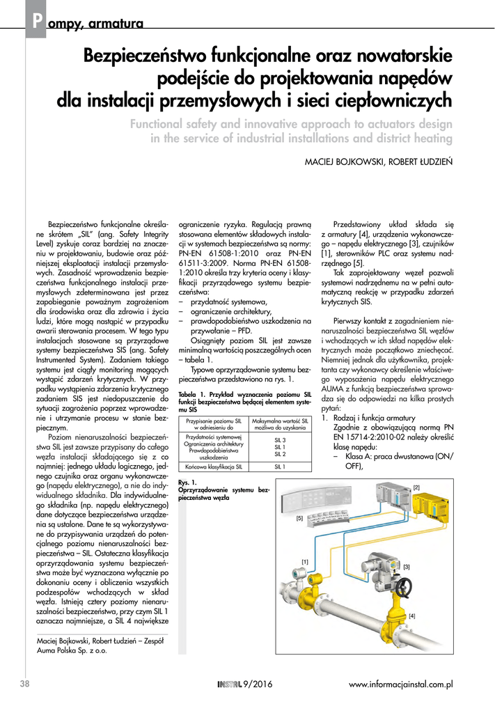 P ompy, armatura Bezpieczeństwo funkcjonalne oraz nowatorskie podejście do projektowania napędów dla instalacji przemysłowych i sieci ciepłowniczych Functional safety and innovative approach to actuators design in the service of industrial installations and district heating MACIEJ BOJKOWSKI, ROBERT ŁUDZIEŃ Bezpieczeństwo funkcjonalne określane skrótem „SIL” (ang. Safety Integrity Level) zyskuje coraz bardziej na znaczeniu w projektowaniu, budowie oraz późniejszej eksploatacji instalacji przemysłowych. Zasadność wprowadzenia bezpieczeństwa funkcjonalnego instalacji przemysłowych zdeterminowana jest przez zapobieganie poważnym zagrożeniom dla środowiska oraz dla zdrowia i życia ludzi, które mogą nastąpić w przypadku awarii sterowania procesem. W tego typu instalacjach stosowane są przyrządowe systemy bezpieczeństwa SIS (ang. Safety Instrumented System). Zadaniem takiego systemu jest ciągły monitoring mogących wystąpić zdarzeń krytycznych. W przypadku wystąpienia zdarzenia krytycznego zadaniem SIS jest niedopuszczenie do sytuacji zagrożenia poprzez wprowadzenie i utrzymanie procesu w stanie bezpiecznym. Poziom nienaruszalności bezpieczeństwa SIL jest zawsze przypisany do całego węzła instalacji składającego się z co najmniej: jednego układu logicznego, jednego czujnika oraz organu wykonawczego (napędu elektrycznego), a nie do indywidualnego składnika. Dla indywidualnego składnika (np. napędu elektrycznego) dane dotyczące bezpieczeństwa urządzenia są ustalone. Dane te są wykorzystywane do przypisywania urządzeń do potencjalnego poziomu nienaruszalności bezpieczeństwa – SIL. Ostateczna klasyfikacja oprzyrządowania systemu bezpieczeństwa może być wyznaczona wyłącznie po dokonaniu oceny i obliczenia wszystkich podzespołów wchodzących w skład węzła. Istnieją cztery poziomy nienaruszalności bezpieczeństwa, przy czym SIL 1 oznacza najmniejsze, a SIL 4 największe ograniczenie ryzyka. Regulacją prawną stosowana elementów składowych instalacji w systemach bezpieczeństwa są normy: PN-EN 61508-1:2010 oraz PN-EN 61511-3:2009. Norma PN-EN 615081:2010 określa trzy kryteria oceny i klasyfikacji przyrządowego systemu bezpieczeństwa: –– przydatność systemowa, –– ograniczenie architektury, –– prawdopodobieństwo uszkodzenia na przywołanie – PFD. Osiągnięty poziom SIL jest zawsze minimalną wartością poszczególnych ocen – tabela 1. Typowe oprzyrządowanie systemu bezpieczeństwa przedstawiono na rys. 1. Tabela 1. Przykład wyznaczenia poziomu SIL funkcji bezpieczeństwa będącej elementem systemu SIS Przypisanie poziomu SIL w odniesieniu do Maksymalna wartość SIL możliwa do uzyskania Przydatności systemowej Ograniczenia architektury Prawdopodobieństwa uszkodzenia SIL 3 SIL 1 SIL 2 Końcowa klasyfikacja SIL SIL 1 Przedstawiony układ składa się z armatury [4], urządzenia wykonawczego – napędu elektrycznego [3], czujników [1], sterowników PLC oraz systemu nadrzędnego [5]. Tak zaprojektowany węzeł pozwoli systemowi nadrzędnemu na w pełni automatyczną reakcję w przypadku zdarzeń krytycznych SIS. Pierwszy kontakt z zagadnieniem nienaruszalności bezpieczeństwa SIL węzłów i wchodzących w ich skład napędów elektrycznych może początkowo zniechęcać. Niemniej jednak dla użytkownika, projektanta czy wykonawcy określenie właściwego wyposażenia napędu elektrycznego AUMA z funkcją bezpieczeństwa sprowadza się do odpowiedzi na kilka prostych pytań: 1. Rodzaj i funkcja armatury Zgodnie z obowiązującą normą PN EN 15714-2:2010-02 należy określić klasę napędu: –– Klasa A: praca dwustanowa (ON/ OFF), Rys. 1. Oprzyrządowanie systemu bezpieczeństwa węzła Maciej Bojkowski, Robert Łudzień – Zespół Auma Polska Sp. z o.o. 38 9/2016 www.informacjainstal.com.pl www.informacjainstal.com.pl Pompy, armatura –– Klasa B: impulsowanie/ pozycjonowanie, –– Klasa C: regulacja. 2. Który poziom powinien być osiągalny z tym produktem: –– SIL1, –– SIL2, –– SIL3 (w systemie redundantnym “1oo2”). 3. Który typ napędu i sterownika AUMA jest wymagany: –– AUMA NORM, –– AUMA NORM + AUMA MATIC, –– AUMA NORM + AUMATIC. 3. W jaki sposób napęd będzie sterowany: –– sterownie binarne, –– sterowanie analogowe, –– protokół cyfrowy (Profibus DP, Modbus RTU, Foundation Fieldbus). 4. Która funkcja bezpieczeństwa jest wymagana: –– bezpieczne OTWARCIE, –– bezpieczne ZAMKNIĘCIE, –– bezpieczny STOP/postój, –– bezpieczne OTWARCIE + bezpieczny STOP, –– bezpieczne ZAMKNIĘCIE + bezpieczny STOP, –– bezpieczne odwzorowanie pozycji krańcowych. Odpowiedzi na powyższe pytania pozwolą określić wersję i wymaganą konfigurację napędów będących integralną częścią przyrządowych systemów bezpieczeństwa – SIS. Wykorzystanie sterowników AUMATIC .2 (AC .2) z funkcją bezpieczeństwa nie oznacza radykalnych zmian w wyglądzie, wadze, rozszerzona zostaje jedynie funkcjonalność sterowników. Moduł SIL w sterownikach AC .2 składa się z dodatkowej płytki elektronicznej, odpowiedzialnej za realizację funkcji bezpieczeństwa (rys. 2). Układy wyposażone w AC .2 w wersji SIL łączą w sobie funkcje dwóch sterowników. Z jednej strony standardowe funkcje AC .2 mogą być wykorzystywane w „normalnej eksploatacji”. Z drugiej strony wbudowany moduł SIL pełni funkcje bezpieczeństwa, zawsze nadrzędne w stosunku do zwykłej pracy. Jest to możliwe, ponieważ standardowa logika sterowania jest omijana z chwilą, gdy wywoływana jest funkcja bezpieczeństwa. Moduł SIL wykorzystywany w sterownikach AUMA pozwala na osiągnięcie poziomu SIL 2 a nawet SIL 3 (pod warunkiem dostępności redundantnej architektury systemu – 1oo2). Podsumowując, bezpieczeństwo funkcjonalne w połączeniu z dalszymi działaniami, takimi jak ochrona ppoż, bezpieczeństwo elektryczne – znacząco przyczy- Rys. 2. Sterownik A