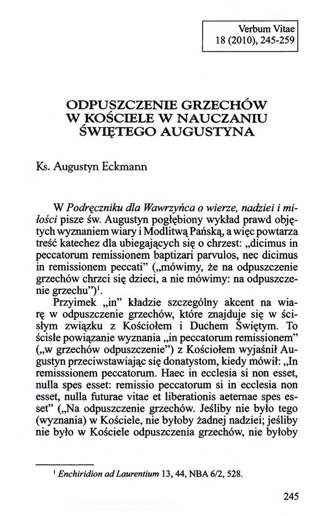 "peccatorum remisssionem" św. Augustyn mówi o odpuszczeniu grzechów, jakie następuje w czasie chrztu i odpuszczeniu grzechów popełnionych po chrzcie. Kiedy objaśnia