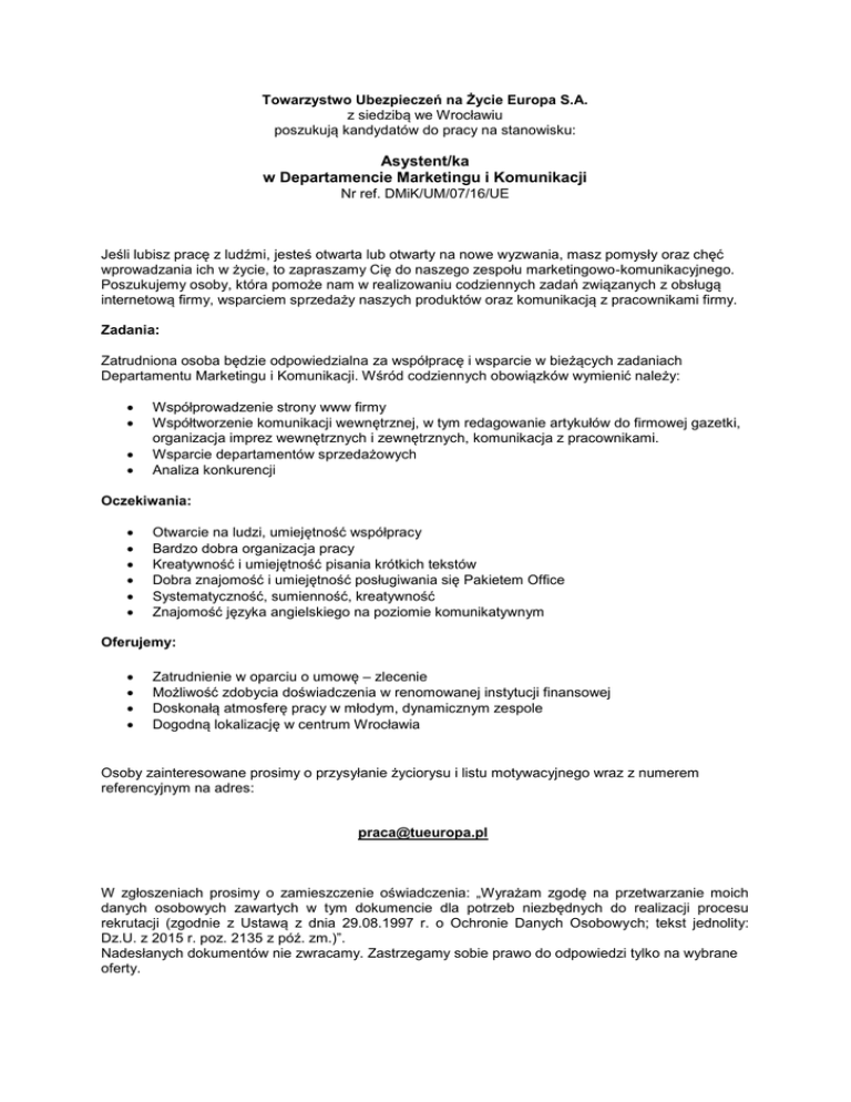 Towarzystwo Ubezpieczeń na Życie Europa S.A. z siedzibą we Wrocławiu poszukują kandydatów do pracy na stanowisku: Asystent/ka w Departamencie Marketingu i Komunikacji Nr ref. DMiK/UM/07/16/UE Jeśli lubisz pracę z ludźmi, jesteś otwarta lub otwarty na nowe wyzwania, masz pomysły oraz chęć wprowadzania ich w życie, to zapraszamy Cię do naszego zespołu marketingowo-komunikacyjnego. Poszukujemy osoby, która pomoże nam w realizowaniu codziennych zadań związanych z obsługą internetową firmy, wsparciem sprzedaży naszych produktów oraz komunikacją z pracownikami firmy. Zadania: Zatrudniona osoba będzie odpowiedzialna za współpracę i wsparcie w bieżących zadaniach Departamentu Marketingu i Komunikacji. Wśród codziennych obowiązków wymienić należy: Współprowadzenie strony www firmy Współtworzenie komunikacji wewnętrznej, w tym redagowanie artykułów do firmowej gazetki, organizacja imprez wewnętrznych i zewnętrznych, komunikacja z pracownikami. Wsparcie departamentów sprzedażowych Analiza konkurencji Oczekiwania: Otwarcie na ludzi, umiejętność współpracy Bardzo dobra organizacja pracy Kreatywność i umiejętność pisania krótkich tekstów Dobra znajomość i umiejętność posługiwania się Pakietem Office Systematyczność, sumienność, kreatywność Znajomość języka angielskiego na poziomie komunikatywnym Oferujemy: Zatrudnienie w oparciu o umowę – zlecenie Możliwość zdobycia doświadczenia w renomowanej instytucji finansowej Doskonałą atmosferę pracy w młodym, dynamicznym zespole Dogodną lokalizację w centrum Wrocławia Osoby zainteresowane prosimy o przysyłanie życiorysu i listu motywacyjnego wraz z numerem referencyjnym na adres: [email protected] W zgłoszeniach prosimy o zamieszczenie oświadczenia: „Wyrażam zgodę na przetwarzanie moich danych osobowych zawartych w tym dokumencie dla potrzeb niezbędnych do realizacji procesu rekrutacji (zgodnie z Ustawą z dnia 29.08.1997 r. o Ochronie Danych Osobowych; tekst jednolity: Dz.U. z 2015 r. poz. 2135 z póź. zm.)”. Nadesłanych dokumentów nie zwracamy. Zastrzegamy sobie prawo do odpowiedzi tylko na wybrane oferty.