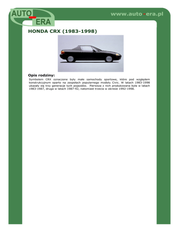 www.auto - era.pl HONDA CRX (1983-1998) Opis rodziny: Symbolem CRX oznaczone były małe samochody sportowe, które pod względem konstrukcyjnym oparto na zespołach popularnego modelu Civic. W latach 1983-1998 ukazały się trzy generacje tych pojazdów. Pierwsza z nich produkowana była w latach 1983-1987, druga w latach 1987-92, natomiast trzecia w okresie 1992-1998.