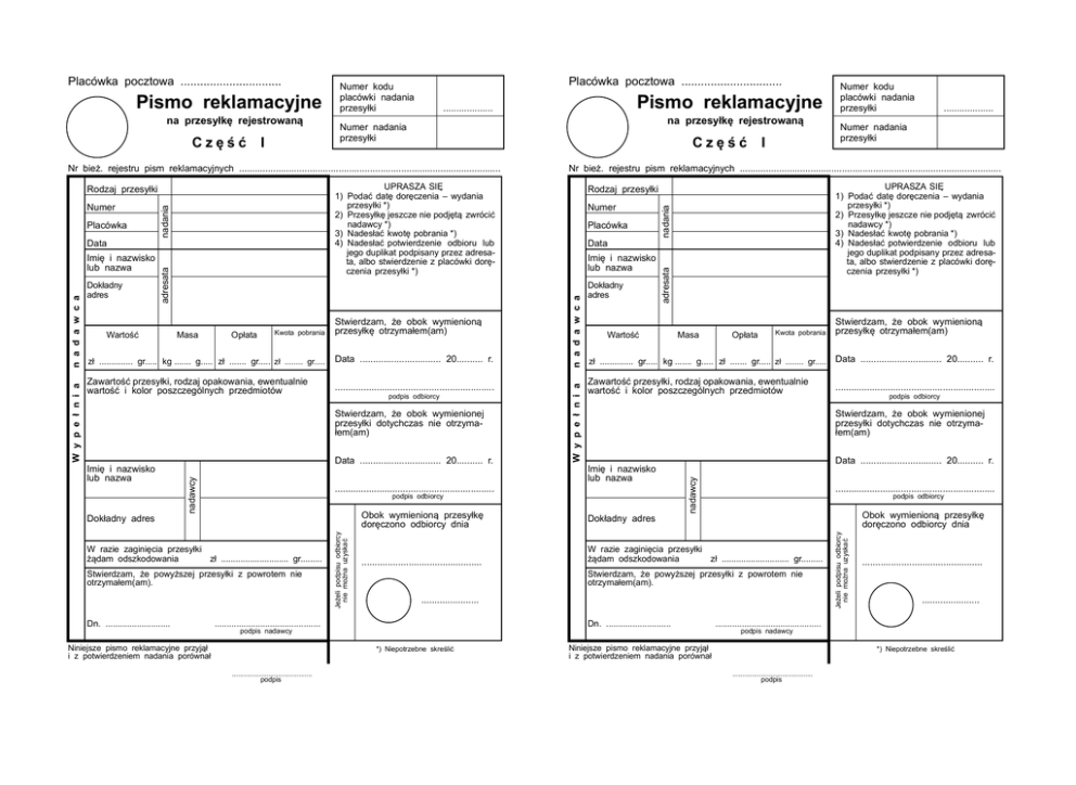 I na przesyłke˛ rejestrowana˛ Numer nadania przesyłki C z e˛ ś ć Nr bież. rejestru pism reklamacyjnych .................................................................................................... Wartość Masa Opłata Kwota pobrania Stwierdzam, że obok wymieniona˛ przesyłke˛ otrzymałem(am) zł .............. gr..... kg ....... g..... zł ....... gr..... zł ........ gr..... Data ............................... 20.......... r. Zawartość przesyłki, rodzaj opakowania, ewentualnie wartość i kolor poszczególnych przedmiotów ............................................................. podpis odbiorcy Stwierdzam, że obok wymienionej przesyłki dotychczas nie otrzymałem(am) Imie˛ i nazwisko lub nazwa Data ............................... 20.......... r. Placówka Data Imie˛ i nazwisko lub nazwa Dokładny adres Wartość Stwierdzam, że powyższej przesyłki z powrotem nie otrzymałem(am). Jeżeli podpisu odbiorcy nie można uzyskać W razie zaginie˛cia przesyłki ża˛dam odszkodowania zł ............................ gr......... .............................................. ............................................................. podpis odbiorcy Stwierdzam, że obok wymienionej przesyłki dotychczas nie otrzymałem(am) Imie˛ i nazwisko lub nazwa Data ............................... 20.......... r. ............................................................. podpis odbiorcy Obok wymieniona˛ przesyłke˛ dore˛czono odbiorcy dnia Dokładny adres W razie zaginie˛cia przesyłki ża˛dam odszkodowania zł ............................ gr......... Dn. ........................... *) Niepotrzebne skreślić Stwierdzam, że obok wymieniona˛ przesyłke˛ otrzymałem(am) Zawartość przesyłki, rodzaj opakowania, ewentualnie wartość i kolor poszczególnych przedmiotów ...................... podpis nadawcy .......................................... podpis Kwota pobrania Stwierdzam, że powyższej przesyłki z powrotem nie otrzymałem(am). ............................................ Niniejsze pismo reklamacyjne przyja˛ł i z potwierdzeniem nadania porównał Opłata Data ............................... 20.......... r. podpis odbiorcy Obok wymieniona˛ przesyłke˛ dore˛czono odbiorcy dnia Masa zł .............. gr..... kg ....... g..... zł ....... gr..... zł ........ gr..... ............................................................. Dokładny adres Dn. ........................... Numer n a d a w c a Dokładny adres nadawcy W y p e ł n i a n a d a w c a Imie˛ i nazwisko lub nazwa adresata Data Numer nadania przesyłki UPRASZA SIE˛ 1) Podać date˛ dore˛czenia – wydania przesyłki *) 2) Przesyłke˛ jeszcze nie podje˛ta˛ zwrócić nadawcy *) 3) Nadesłać kwote˛ pobrania *) 4) Nadesłać potwierdzenie odbioru lub jego duplikat podpisany przez adresata, albo stwierdzenie z placówki dore˛czenia przesyłki *) Rodzaj przesyłki W y p e ł n i a Placówka nadania Numer ................... Nr bież. rejestru pism reklamacyjnych .................................................................................................... UPRASZA SIE˛ 1) Podać date˛ dore˛czenia – wydania przesyłki *) 2) Przesyłke˛ jeszcze nie podje˛ta˛ zwrócić nadawcy *) 3) Nadesłać kwote˛ pobrania *) 4) Nadesłać potwierdzenie odbioru lub jego duplikat podpisany przez adresata, albo stwierdzenie z placówki dore˛czenia przesyłki *) Rodzaj przesyłki I Numer kodu placówki nadania przesyłki Jeżeli podpisu odbiorcy nie można uzyskać C z e˛ ś ć Pismo reklamacyjne ................... nadawcy na przesyłke˛ rejestrowana˛ nadania Pismo reklamacyjne Placówka pocztowa ............................... Numer kodu placówki nadania przesyłki adresata Placówka pocztowa ............................... .............................................. ...................... ............................................ podpis nadawcy Niniejsze pismo reklamacyjne przyja˛ł i z potwierdzeniem nadania porównał *) Niepotrzebne skreślić .......................................... podpis Część II Załatwienie pisma reklamacyjnego na przesyłki rejestrowane zapisywane pojedynczo lub zbiorowo oraz poszukiwanie przesyłki rejestrowanej, zapisywanej pojedynczo – drogą przemieszczania 1 dosłano adresatowi *) zwrócono nadawcy *) Numer bieżący rejestru pism reklamacyjnych Nazwa placówki pocztowej, która załatwia pismo reklamacyjne doręczono (wydano) uprawnionemu do odbioru dnia pod numerem oddawczym dnia do: dnia do: 2 3 4 5 6 7 8 *) Słowa nieodpowiednie skreślić PP S.A. nr 92 wysłano dalej *) Zapisywana zbiorowo, w razie jej nadejścia wysłana dalej ekspedycja (wypenic´ także rubr. 7 i 8) 9 leży nie podjęta **) nie nadeszła do miejsca przeznaczenia **) Reklamowana(a) przesyłka(e) 10 11 Uwagi Podpis pracownika pocztowego i data załatwienia pisma reklamacyjnego 12 13 **) w danym wypadku w odnoś nej pozycji wstawić „1” Wydział Poligrafii CI Wrocław 2010