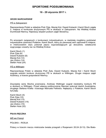 SPORTOWE PODSUMOWANIA 16 - 29 stycznia 2017 r. SKOKI NARCIARSKIE PŚ w Zakopanem Reprezentacja Polski w składzie Piotr Żyła, Maciej Kot, Dawid Kubacki i Kamil Stoch zajęła 2. miejsce w konkursie drużynowym PŚ w skokach w Zakopanem. Na Wielkiej Krokwi triumfowali Niemcy. Najniższy stopień podium zajęli Słoweńcy. Po emocjach związanych z konkursem indywidualnym, w niedzielę mogliśmy podziwiać indywidualne zdolności Polaków. Kamil Stoch, który po pierwszej serii zajmował 6 miejsce, w mistrzowskim stylu pokonał pięciu wyprzedzających go skoczków, ostatecznie wygrywając czwarty raz na Wielkiej Krokwi. Kamil Stoch (1) Piotr Żyła (6) Dawid Kubacki (8) Maciej Kot (12) Jan Ziobro (14) Stefan Hula (24) PŚ w Willingen Reprezentacja Polski w składzie Piotr Żyła, Dawid Kubacki, Maciej Kot i Kamil Stoch wygrała sobotni konkurs drużynowy PŚ w skokach w Willingen. Drugie miejsce zajęli Austriacy, a trzecie gospodarze Niemcy. Zwycięska seria Stocha przerwana. Andreas Wellinger wygrał niedzielny konkurs PŚ w skokach w Willingen. Przed własną publicznością Niemiec pokonał dwóch Austriaków, drugiego Stefana Krafta i trzeciego Manuela Fettnera. Najlepszy z Polaków, Kamil Stoch był piąty. Kamil Stoch (5) Piotr Żyła (10) Maciej Kot (13) Dawid Kubacki (14) Jan Ziobro (15) Stefan Hula (32) PIŁKA RĘCZNA MŚ we Francji POLSKA – ROSJA Polacy w trzecim meczu mistrzostw świata przegrali z Rosjanami 20:24 (9:13). Dla Biało- Czerwonych to koniec marzeń o awansie do 1/8 finału. Na pocieszenie zagrają o Puchar Prezydenta. POLSKA – JAPONIA Polscy piłkarze ręczni po raz pierwszy na tych mistrzostwach świata zafundowali kibicom horror. Jego stawką było jednak... piąte miejsce w tabeli. Biało-Czerwoni pokonali Japończyków 26:25 (9:11). POLSKA – FRANCJA To był najlepszy mecz reprezentacji Polski w tym roku. Nasi piłkarze ręczni w ostatnim spotkaniu fazy grupowej mistrzostw świata ulegli Francuzom 25:26 (13:13). Przegraliśmy, ale to była drużyna, którą chciało się oglądać. POLSKA – TUNEZJA Polacy z drugim zwycięstwem na mistrzostwach świata we Francji. Wygrana 28:26 (15:11) z Tunezyjczykami zapewniła zawodnikom Tałanta Dujszebajewa udział w meczu o 17. miejsce. Nasi szczypiorniści byli jednak o krok od zmarnowania przewagi z pierwszej połowy. POLSKA – ARGENTYNA Polacy w ostatnim meczu mistrzostw świata wygrali z Argentyną 24:22 (13:13). BiałoCzerwoni w drugiej połowie odrobili pięć goli straty i po popisowej pogoni zdobyli Puchar Prezydenta. Bohaterem meczu był debiutant Mateusz Kornecki. Wyniki zespołów z Lubelszczyzny: piłka ręczna MKS Selgros Lublin – UKS PCM Kościerzyna 38:20 (17:9) MKS Selgros Lublin – Piotrcovia Piotrków Trybunalski 40:30 (22:11) koszykówka Siarka Tarnobrzeg – Start Lublin 86:83 Źródła: sport.pl sportowefakty.wp.pl mks.lublin.pl azoty-pulawy.pl