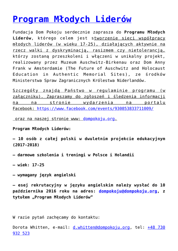 Program Młodych Liderów Fundacja Dom Pokoju serdecznie zaprasza do Programu Młodych Liderów, którego celem jest stworzenie sieci współpracy młodych liderów (w wieku 17-25), działających aktywnie na rzecz walki z dyskryminacją, rasizmem czy nietolerancją, którzy zostaną przeszkoleni i włączeni w unikalny projekt, realizowany przez Muzeum Auschwitz-Birkenau oraz Dom Anny Frank w Amsterdamie (The Future of Auschwitz and Holocaust Education in Authentic Memorial Sites), ze środków Ministerstwa Spraw Zagranicznych Królestwa Niderlandów. Szczegóły znajdą Państwo w regulaminie programu (w załączniku). Zapraszamy do zgłoszeń i śledzenia informacji na na stronie wydarzenia na portalu Facebook: https://www.facebook.com/events/930853833711009/ oraz na naszej stronie www: dompokoju.org. Program Młodych Liderów: – 10 osób z całej polski w dwuletnim projekcie edukacyjnym (2017-2018) – darmowe szkolenia i treningi w Polsce i Holandii – wiek: 17-25 – wymagany język angielski – esej rekrutacyjny w języku angielskim należy wysłać do 10 października 2016 roku na adres: [email protected], z tytułem „Program Młodych Liderów” W razie pytań zachęcamy do kontaktu: Dorota Whitten, e-mail: [email protected], tel: +48 730 932 523 — Fundacja Dom Pokoju Łokietka 5/1 50-243 Wrocław www.dompokoju.org lokietka5.pl program-mlodych-liderow_formularz-zgloszeniowy program-mlodych-liderow_info programu-mlodych-liderow_regulamin
