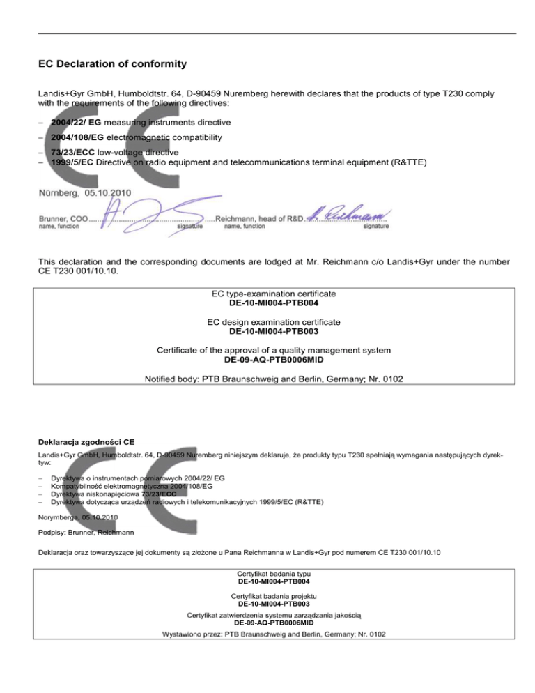 EC Declaration of conformity Landis+Gyr GmbH, Humboldtstr. 64, D-90459 Nuremberg herewith declares that the products of type T230 comply with the requirements of the following directives: − 2004/22/ EG measuring instruments directive − 2004/108/EG electromagnetic compatibility − 73/23/ECC low-voltage directive − 1999/5/EC Directive on radio equipment and telecommunications terminal equipment (R&TTE) This declaration and the corresponding documents are lodged at Mr. Reichmann c/o Landis+Gyr under the number CE T230 001/10.10. EC type-examination certificate DE-10-MI004-PTB004 EC design examination certificate DE-10-MI004-PTB003 Certificate of the approval of a quality management system DE-09-AQ-PTB0006MID Notified body: PTB Braunschweig and Berlin, Germany; Nr. 0102 Deklaracja zgodności CE Landis+Gyr GmbH, Humboldtstr. 64, D-90459 Nuremberg niniejszym deklaruje, że produkty typu T230 spełniają wymagania następujących dyrektyw: − − − − Dyrektywa o instrumentach pomiarowych 2004/22/ EG Kompatybilność elektromagnetyczna 2004/108/EG Dyrektywa niskonapięciowa 73/23/ECC Dyrektywa dotycząca urządzeń radiowych i telekomunikacyjnych 1999/5/EC (R&TTE) Norymberga, 05.10.2010 Podpisy: Brunner, Reichmann Deklaracja oraz towarzyszące jej dokumenty są złożone u Pana Reichmanna w Landis+Gyr pod numerem CE T230 001/10.10 Certyfikat badania typu DE-10-MI004-PTB004 Certyfikat badania projektu DE-10-MI004-PTB003 Certyfikat zatwierdzenia systemu zarządzania jakością DE-09-AQ-PTB0006MID Wystawiono przez: PTB Braunschweig and Berlin, Germany; Nr. 0102