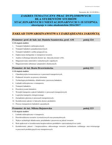 Sporządziła: mgr inż. Justyna Bogdzia Szczecin, dn. 14.10.2016 r. ZAKRES TEMATYCZNY PRAC DYPLOMOWYCH DLA STUDENTÓW STUDIÓW STACJONARNYCH I NIESTACJONARNYCH I i II STOPNIA obowiązuje w roku akademickim 2016/2017 ZAKŁAD TOWAROZNAWSTWA I ZARZĄDZANIA JAKOŚCIĄ Promotor: prof. dr hab. inż. Daniela Szaniawska, prof. AM pokój 224 I i II stopień studiów 1. Transport ładunków niebezpiecznych. 2. Transport ładunków ponadnormatywnych. 3. Transport ładunków szybko psujących się. 4. Opakowania inteligentne w transporcie towarów. 5. Analiza wybranego łańcucha dostaw np.: łańcucha dostaw LNG. 6. Magazynowanie materiałów wybuchowych i zapalnych. 7. Magazynowanie substancji i preparatów chemicznych. Promotor: dr inż. Beata Drzewieniecka pokój 221 I i II stopień studiów 1. Charakterystyka towaroznawcza w procesach transportowych. 2. Podatność towarów na procesy utleniania. 3. Technologia przeładunku, składowania i przewozu ładunków. 4. Ładunki niebezpieczne w transporcie. 5. Transport ładunków. 6. Przechowywanie ładunków. 7. Warunki transportu a jakość ładunków w procesach transportowych. 8. Logistyka transportu zintegrowanego. 9. Zarządzanie jakością w procesach transportowych. 10. Kształtowanie jakości w łańcuchu dostaw produktów. 11. Procesy transportowe ładunków specjalnych. Promotor: dr inż. Milena Bojanowska pokój 223 I i II stopień studiów 1. Ładunki niebezpieczne w transporcie. 2. Przechowalnictwo towarów żywnościowych oraz przemysłowych. 3. Wpływ technologii składowania, przeładunku i przewozu na jakość towarów. 4. Rola opakowań w kształtowaniu bezpieczeństwa produktów wprowadzanych na rynek. 5. Kształtowanie jakości i bezpieczeństwa zdrowotnego towarów pochodzenia roślinnego oraz zwierzęcego w procesach produkcyjnych oraz transportowych. Sporządziła: mgr inż. Justyna Bogdzia 6. Zarządzanie jakością w przedsiębiorstwach gospodarki morskiej. 7. Zarządzanie jakością w produkcji żywności i pasz. 8. Towaroznawcze i logistyczne problemy wykorzystania biomasy jako odnawialnego źródła energii. Promotor: dr inż. Anna Wolnowska pokój 222 I i II stopień studiów 1. Zarządzanie jakością w przedsiębiorstwach transportowych i spedycyjnych. 2. Sterowanie jakością w przedsiębiorstwach gospodarki morskiej. 3. Inżynieria jakości w produkcji maszyn. 4. Udział zarządzania jakością w logistyce wybranych przedsiębiorstw produkcyjnych i transportowych. 5. Obieg informacji w procesach produkcyjnych, usługowych i systemach jakości. 6. Ocena jakości wybranych produktów spożywczych i przemysłowych występujących w obrocie handlowym. 7. Logistyka miejska, aspekty rozwoju i metody doskonalenia. 8. Analiza zintegrowanych systemów zarządzania jakością, ochroną środowiska i bezpieczeństwem i higieną pracy w przedsiębiorstwach produkcyjnych oraz transportowych. 9. Zarządzanie ryzykiem w systemach gospodarczych ze szczególnym wskazaniem na inżynierie produkcji. ZAKŁAD TECHNOLOGII TRANSPORTU ZINTEGROWANEGO I OCHRONY ŚRODOWISKA Promotor: dr hab. inż. Zofia Jóźwiak, prof. AM pokój 15 C I i II stopień studiów 1. Kierunki polityki ekologicznej w Europie. 2. Zarządzanie bezpieczeństwem w przedsiębiorstwie transportowym. 3. Metody ograniczania negatywnego wpływu transportu drogowego na środowisko naturalne. 4. Metody ograniczania negatywnego wpływu transportu morskiego na środowisko naturalne. 5. Metody ograniczania negatywnego wpływu transportu kolejowego na środowisko naturalne. 6. Metody ograniczania negatywnego wpływu żeglugi śródlądowej na środowisko naturalne. 7. Zarządzanie wodami balastowymi pod kątem wyeliminowania przenoszenia organizmów inwazyjnych. 8. Zarządzanie ładunkami niebezpiecznymi w transporcie (morskim, śródlądowym, samochodowym, kolejowym i lotniczym). 9. Problem bezpieczeństwa w transporcie i przeładunku ładunków ponadnormatywnych. 10. Techniczne aspekty transportu ładunków ponadnormatywnych. 11. Logistyczne aspekty transportu ładunków ponadnormatywnych. 12. Zarządzanie transportem ładunków mrożonych. 13. Logistyka transportu zintegrowanego. 14. Rozwiązania techniczne w transporcie na rzecz ochrony środowiska. 15. Rozwiązania techniczne w transporcie na rzecz bezpieczeństwa. 16. Optymalizacja technik i technologii przeładunków w kierunku ochrony środowiska i zapewnienia bezpieczeństwa. Sporządziła: mgr inż. Justyna Bogdzia 17. Zarządzanie ochroną środowiska w portach morskich. 18. Zagrożenia bezpieczeństwa środowiska pracy i środowiska naturalnego generowane w portach. 19. Problemy związane z recyklingiem środków transportu. 20. Zagrożenia ekologiczne i bezpieczeństwa środowiska pracy, związane z transportem ładunków niebezpiecznych. 21. Procesy logistyczne w zarządzaniu odpadami. 22. Procesy logistyczne w zarządzaniu opakowaniami. 23. Zanieczyszczenie Bałtyku – źródła, rodzaje, ochrona prawna i techniczna. 24. Zasady doboru środków transportu do przewozu ładunków ponadnormatywnych. 25. Logistyka odbioru wód balastowych zanieczyszczonych, organizmami inwazyjnymi. 26. Zarządzanie produkcją towarów ponadnormatywnych. Promotor: dr inż. Agnieszka Deja pokój 15 B lub 108 Wały Chrobrego I i II stopień studiów 1. Gospodarka odpadami ze statków morskich i śródlądowych. 2. Systemy zarządzania środowiskiem w przedsiębiorstwach. 3. Zintegrowane systemy zarządzania. 4. Ochrona środowiska w transporcie. 5. Utylizacja opakowań transportowych. 6. Ochrona środowiska morskiego. 7. Zarządzanie środowiskiem w portach morskich. 8. Zrównoważony rozwój transportu. 9. Gospodarka odpadami w przedsiębiorstwach produkcyjnych. 10. Analiza cyklu życia opakowań jednostek ładunkowych. 11. Problematyka hałasu w transporcie. Promotor: dr inż. Wojciech Konicki pokój 207 I i II stopień studiów 1. Emisja zanieczyszczeń pochodzących z transportu drogowego i szynowego. 2. Metody eliminacja zanieczyszc