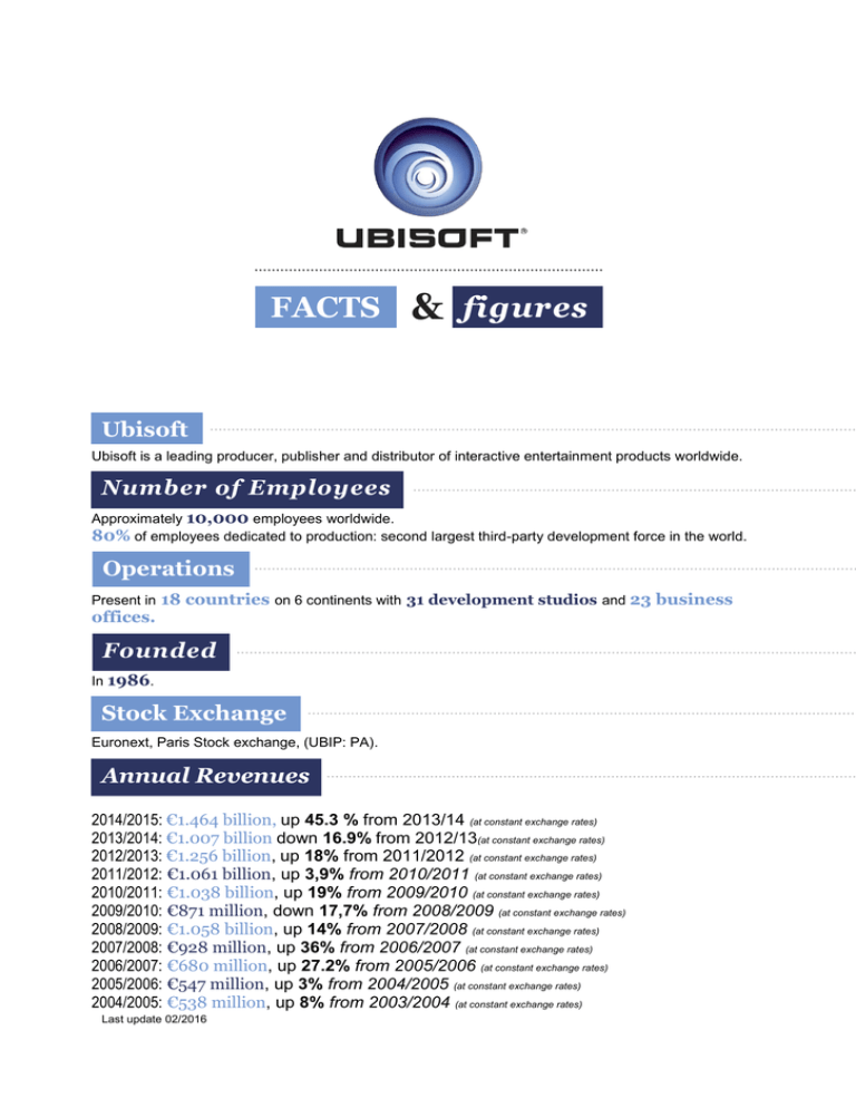 FACTS & figures Ubisoft Ubisoft is a leading producer, publisher and distributor of interactive entertainment products worldwide. Number of Employees Approximately 10,000 employees worldwide. 80% of employees dedicated to production: second largest third-party development force in the world. Operations Present in 18 countries on 6 continents with 31 development studios and 23 business offices. Founded In 1986. Stock Exchange Euronext, Paris Stock exchange, (UBIP: PA). Annual Revenues 2014/2015: €1.464 billion, up 45.3 % from 2013/14 (at constant exchange rates) 2013/2014: €1.007 billion down 16.9% from 2012/13(at constant exchange rates) 2012/2013: €1.256 billion, up 18% from 2011/2012 (at constant exchange rates) 2011/2012: €1.061 billion, up 3,9% from 2010/2011 (at constant exchange rates) 2010/2011: €1.038 billion, up 19% from 2009/2010 (at constant exchange rates) 2009/2010: €871 million, down 17,7% from 2008/2009 (at constant exchange rates) 2008/2009: €1.058 billion, up 14% from 2007/2008 (at constant exchange rates) 2007/2008: €928 million, up 36% from 2006/2007 (at constant exchange rates) 2006/2007: €680 million, up 27.2% from 2005/2006 (at constant exchange rates) 2005/2006: €547 million, up 3% from 2004/2005 (at constant exchange rates) 2004/2005: €538 million, up 8% from 2003/2004 (at constant exchange rates) Last update 02/2016 17 Worldwide Best Selling Franchises Assassin’s Creed®: 96 million units sold 56 million units sold Tom Clancy’s Splinter Cell ®: 31 million units sold Far Cry®: 31 million units sold Rayman®: 28 million units sold Tom Clancy’s Rainbow Six®: 26 million units sold Tom Clancy’s Ghost Recon®: 25 million units sold Petz®: 25 million units sold Imagine™: 21 million units sold Prince of Persia®: 21 million units sold Driver®: 20 million units sold Rayman Raving Rabbids®: 14 million units sold Watch Dogs™: 11 million units sold The Settlers®: 10 million units sold Anno: 9 million units sold Just Dance™: Acquisitions Red Storm Entertainment (2000), Blue Byte Software (2001), The Learning Company’s Entertainment Division (2001), Tiwak (2004), Reflections Interactive (2006), Sunflowers (2007), Digital Kids (2008), intellectual property rights to the Tom Clancy name for video games and related products (2008), Gameloft’s Pune studio (2008), Hybride Technologies (2008), Southlogic Studios (2008), Massive Entertainment (2008), Action Pants (2009), Nadeo (2009), Quazal Technologies (2010), Owlient (2011), Red Lynx (2011), Related Designs (2013), Future Games of London (2013), Ivory Tower (2015), Ubisoft Halifax (2015). Management Team Yves Guillemot, Chief Executive Officer. Serge Hascoet, Chief Creative Officer. Christine Burgess-Quemard, Executive Director Worldwide Studios Laurent Detoc, Executive Director, North America. Alain Corre, Executive Director, EMEA territories. Alain Martinez, Chief Financial Officer. Website www.ubisoft.com /// www.ubisoftgroup.com Last update 02/2016 © 1996-2009 Ubisoft Entertainment. All Rights Reserved. Rayman, Rayman Raving Rabbids, the character of Rayman, Petz, Splinter Cell, Ghost Recon, Assassin’s Creed, Red Steel, Imagine, Anno, H.A.W.X, Far Cry, Driver, Ubisoft and the Ubisoft logo are trademarks of Ubisoft Entertainment in the U.S. and/or other countries. Shaun White is used under license from Shaun White and Shaun White Enterprises, Inc. Based on Crytek’s original Far Cry directed by Cevat Yerli. Powered by Crytek’s technology “CryEngine”. The Settlers, Rainbow Six are trademarks of Red Storm Entertainment in the US and/or other countries. Red Storm Entertainment, Inc. is a Ubisoft Entertainment company. © 2003-2008 Ubisoft Entertainment. All Rights Reserved. Based on Prince of Persia® created by Jordan Mechner. Prince of Persia is a trademark of Jordan Mechner in the US and/or other countries used under license by Ubisoft Entertainment. © 2005-2008 Gearbox Software, LLC. All rights reserved. Published and distributed by Ubisoft Entertainment under license from Gearbox Software, LLC. Brothers In Arms, Gearbox Software and the Gearbox logo are registered trademarks of Gearbox Software, LLC in the U.S. and/or other countries. Last update 02/2016