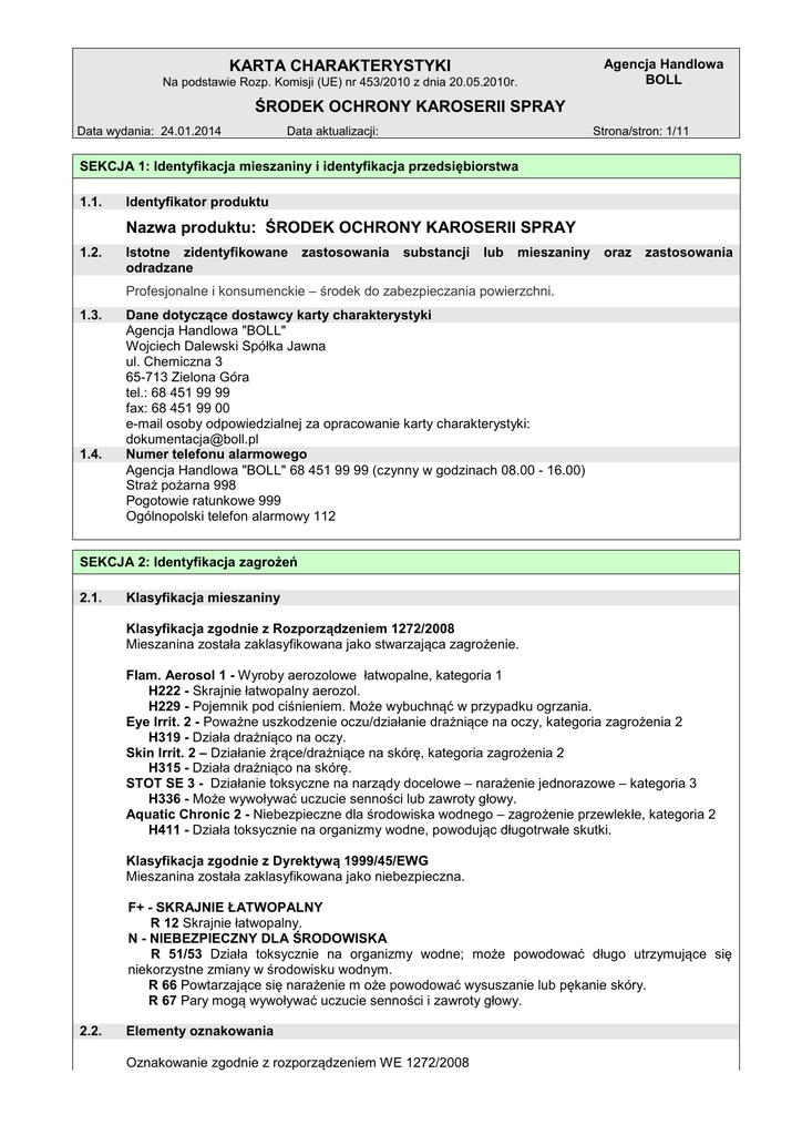 KARTA CHARAKTERYSTYKI Na podstawie Rozp. Komisji (UE) nr 453/2010 z dnia 20.05.2010r. Agencja Handlowa BOLL ŚRODEK OCHRONY KAROSERII SPRAY Data wydania: 24.01.2014 Data aktualizacji: Strona/stron: 1/11 SEKCJA 1: Identyfikacja mieszaniny i identyfikacja przedsiębiorstwa 1.1. Identyfikator produktu Nazwa produktu: ŚRODEK OCHRONY KAROSERII SPRAY 1.2. Istotne zidentyfikowane odradzane zastosowania substancji lub mieszaniny oraz zastosowania Profesjonalne i konsumenckie – środek do zabezpieczania powierzchni. 1.3. 1.4. Dane dotyczące dostawcy karty charakterystyki Agencja Handlowa "BOLL" Wojciech Dalewski Spółka Jawna ul. Chemiczna 3 65-713 Zielona Góra tel.: 68 451 99 99 fax: 68 451 99 00 e-mail osoby odpowiedzialnej za opracowanie karty charakterystyki: [email protected] Numer telefonu alarmowego Agencja Handlowa "BOLL" 68 451 99 99 (czynny w godzinach 08.00 - 16.00) Straż pożarna 998 Pogotowie ratunkowe 999 Ogólnopolski telefon alarmowy 112 SEKCJA 2: Identyfikacja zagrożeń 2.1. Klasyfikacja mieszaniny Klasyfikacja zgodnie z Rozporządzeniem 1272/2008 Mieszanina została zaklasyfikowana jako stwarzająca zagrożenie. Flam. Aerosol 1 - Wyroby aerozolowe łatwopalne, kategoria 1 H222 - Skrajnie łatwopalny aerozol. H229 - Pojemnik pod ciśnieniem. Może wybuchnąć w przypadku ogrzania. Eye Irrit. 2 - Poważne uszkodzenie oczu/działanie drażniące na oczy, kategoria zagrożenia 2 H319 - Działa drażniąco na oczy. Skin Irrit. 2 – Działanie żrące/drażniące na skórę, kategoria zagrożenia 2 H315 - Działa drażniąco na skórę. STOT SE 3 - Działanie toksyczne na narządy docelowe – narażenie jednorazowe – kategoria 3 H336 - Może wywoływać uczucie senności lub zawroty głowy. Aquatic Chronic 2 - Niebezpieczne dla środowiska wodnego – zagrożenie przewlekłe, kategoria 2 H411 - Działa toksycznie na organizmy wodne, powodując długotrwałe skutki. Klasyfikacja zgodnie z Dyrektywą 1999/45/EWG Mieszanina została zaklasyfikowana jako niebezpieczna. F+ - SKRAJNIE ŁATWOPALNY R 12 Skrajnie łatwopalny. N - NIEBEZPIECZNY DLA ŚRODOWISKA R 51/53 Działa toksycznie na organizmy wodne; może powodować długo utrzymujące się niekorzystne zmiany w środowisku wodnym. R 66 Powtarzające się narażenie m oże powodować wysuszanie lub pękanie skóry. R 67 Pary mogą wywoływać uczucie senności i zawroty głowy. 2.2. Elementy oznakowania Oznakowanie zgodnie z rozporządzeniem WE 1272/2008 Agencja Handlowa BOLL KARTA CHARAKTERYSTYKI Na podstawie Rozp. Komisji (UE) nr 453/2010 z dnia 20.05.2010r. ŚRODEK OCHRONY KAROSERII SPRAY Data wydania: 24.01.2014 Hasło ostrzegawcze Piktogramy Data aktualizacji: Strona/stron: 2/11 NIEBEZPIECZEŃSTWO GHS02 GHS07 GHS09 Zwroty wskazujące rodzaj zagrożenia H222 - Skrajnie łatwopalny aerozol. H229 - Pojemnik pod ciśnieniem. Może wybuchnąć w przypadku ogrzania. H319 - Działa drażniąco na oczy. H315 - Działa drażniąco na skórę. H336 - Może wywoływać uczucie senności lub zawroty głowy. H411 - Działa toksycznie na organizmy wodne, powodując długotrwałe skutki. Zwroty wskazujące środki ostrożności Ogólne P102 Chronić przed dziećmi. Zapobieganie P210 Przechowywać z dala od źródeł ciepła, gorących powierzchni, źródeł iskrzenia, otwartego ognia i innych źródeł zapłonu. Nie palić. P273 Unikać uwolnienia do środowiska. Reagowanie P305+P351+P338 W PRZYPADKU DOSTANIA SIĘ DO OCZU: Ostrożnie płukać wodą przez kilka minut. Wyjąć soczewki kontaktowe, jeżeli są i można je łatwo usunąć. Nadal płukać. P304 + P312 W PRZYPADKU DOSTANIA SIĘ DO DROG ODDECHOWYCH: W przypadku złego samopoczucia skontaktować się z OŚRODKIEM ZATRUĆ lub lekarzem. Przechowywanie P403 Przechowywać w dobrze wentylowanym miejscu. Usuwanie P501 Zawartość / pojemnik usuwać do: składowisk substancji niebezpiecznych. Informacje uzupełniające EUH066 Powtarzające się narażenie może powodować wysuszanie lub pękanie skóry. Pojemnik pod ciśnieniem: chronić przed słońcem i nagrzaniem powyżej temperatury 50oC. Nie przekuwać ani nie spalać, także po zużyciu. Nie rozpylać nad otwartym płomieniem lub żarzącym się materiałem. Nie przechowywać w pobliżu źródeł zapłonu – nie palić tytoniu. Chronić przed dziećmi. 2.3. Inne zagrożenia Wyrób aerozolowy. Może powodować efekt narkotyczny. Produkt nie zawiera składników spełniających kryteria PBT lub vPvB. SEKCJA 3: Skład/informacja o składnikach 3.2. Mieszaniny Charakter chemiczny: mieszanina aktywnych składników z propelentem. Gaz wypychający – propan. Klasyfikacja Klasyfikacja Nazwa substancji Identyfikator % wag 67/548/EWG 1272/2008 propan Indeks 601-003-00-5 CAS 74-98-6 WE 200-827-9 Nr rejestr. 01-2119486944-21 F+; R12 Flam. Gas 1 Press. Gas H220 25 -<50 Agencja Handlowa BOLL KARTA CHARAKTERYSTYKI Na podstawie Rozp. Komisji (UE) nr 453/2010 z dnia 20.05.2010r. ŚRODEK OCHRONY KAROSERII SPRAY Data wydania: 24.01.2014 Data aktualizacji: Strona/stron: 3/11 Benzyna lekka obrabiana wodorem (ropa naftowa) Indeks 649-328-00-1 CAS 64742-49-0 WE 920-750-0 Nr rejestr. REACH 01-2119473851-33 F; R11 Xi; R38 Xn; R65 N; R51/53 R66 R67 Flam. Liq. 2 Skin Irrit.2 Asp. Tox. 1 STOT SE 3 Aquatic Chronic2 H225 H315 H304 H336 H411 10 -<20 butan-2-on [metyloetyloketon, MEK] Indeks 606-002-00-3 CAS 78-93-3 WE 201-159-0 Nr rejestr. REACH 01-2119457290-43 F; R11 Xi; R36 R66 R67 Flam. Liq. 2 Eye Irrit. 2 EUHO66 STOT SE 3 H225 H319 10 -<20 ksylen; dimetylobenzen – mieszanina izomerów Indeks 601-022-00-9 CAS 1330-20-7 WE 215-535-7 Nr rejestr. REACH 01-2119488216-32 R10 Xn; R20/21 Xi; R38 Flam. Liq. 3 Acute Tox. 4 Acute Tox. 4 Skin Irrit. 2 H226 H332 H312 H315 3 -<10 Benzyna lekka obrabiana wodorem (ropa naftowa) NOTA P Indeks 649-328-00-1 CAS 64742-49-0 WE 265-151-9 F; R11 Xi; R38 Xn; R65 N; R51/53 R67 Flam. Liq. 2 Skin Irrit.2 Asp. Tox. 1 STOT SE 3 Aquatic Chronic2 H225 H315 H304 H336 H411 3 -<10 1-metoksypropan-2-ol Indeks 603-064-00-3 CAS 107-98