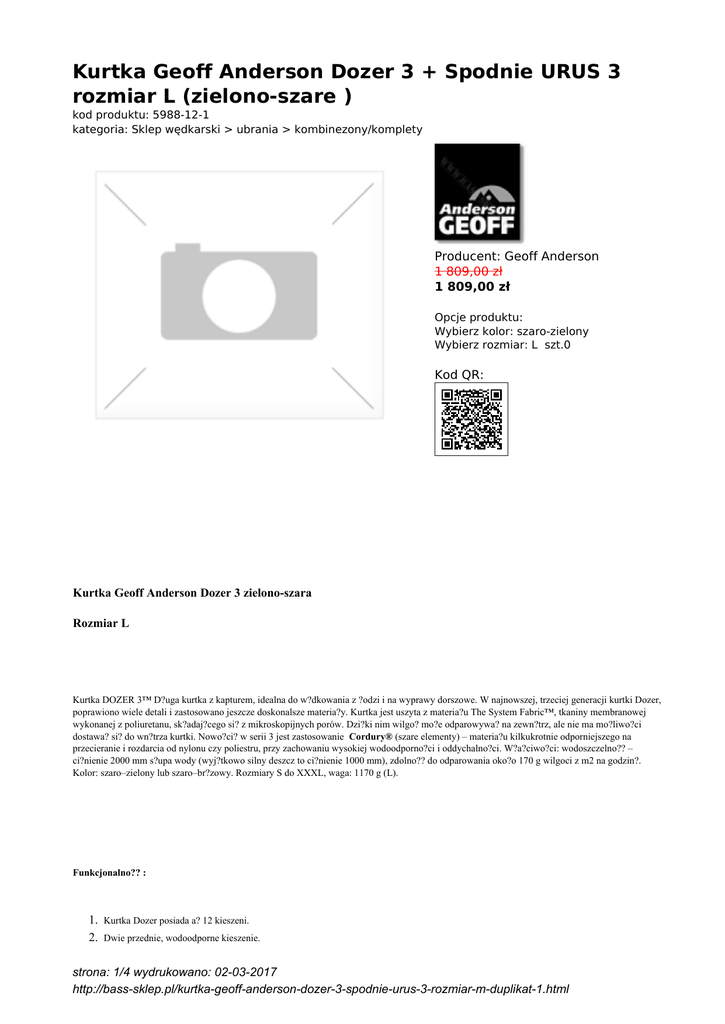Kurtka Geoff Anderson Dozer 3 + Spodnie URUS 3 rozmiar L (zielono-szare ) kod produktu: 5988-12-1 kategoria: Sklep wędkarski > ubrania > kombinezony/komplety Producent: Geoff Anderson 1 809,00 zł 1 809,00 zł Opcje produktu: Wybierz kolor: szaro-zielony Wybierz rozmiar: L szt.0 Kod QR: Kurtka Geoff Anderson Dozer 3 zielono-szara Rozmiar L Kurtka DOZER 3™ D?uga kurtka z kapturem, idealna do w?dkowania z ?odzi i na wyprawy dorszowe. W najnowszej, trzeciej generacji kurtki Dozer, poprawiono wiele detali i zastosowano jeszcze doskonalsze materia?y. Kurtka jest uszyta z materia?u The System Fabric™, tkaniny membranowej wykonanej z poliuretanu, sk?adaj?cego si? z mikroskopijnych porów. Dzi?ki nim wilgo? mo?e odparowywa? na zewn?trz, ale nie ma mo?liwo?ci dostawa? si? do wn?trza kurtki. Nowo?ci? w serii 3 jest zastosowanie Cordury® (szare elementy) – materia?u kilkukrotnie odporniejszego na przecieranie i rozdarcia od nylonu czy poliestru, przy zachowaniu wysokiej wodoodporno?ci i oddychalno?ci. W?a?ciwo?ci: wodoszczelno?? – ci?nienie 2000 mm s?upa wody (wyj?tkowo silny deszcz to ci?nienie 1000 mm), zdolno?? do odparowania oko?o 170 g wilgoci z m2 na godzin?. Kolor: szaro–zielony lub szaro–br?zowy. Rozmiary S do XXXL, waga: 1170 g (L). Funkcjonalno?? : 1. 2. Kurtka Dozer posiada a? 12 kieszeni. Dwie przednie, wodoodporne kieszenie. strona: 1/4 wydrukowano: 02-03-2017 http://bass-sklep.pl/kurtka-geoff-anderson-dozer-3-spodnie-urus-3-rozmiar-m-duplikat-1.html 3. 4. 5. 6. 7. 8. 9. Kieszenie boczne wy?o?one materia?em typu fleece, s?u??ce do ogrzewania r?k. Dwie du?e kieszenie dolne, zamykane na zatrzaski. Specjalne kieszenie, wyposa?one w tzw. „system wentylacji pach”. Du?a kiesze? tylna. Wodoodporna kiesze? na telefon lub dokumenty, schowana za klap? kurtki. Kaptur „pod??aj?cy” za ruchami g?owy, wyposa?ony w dwa wygodne ?ci?gacze. Dozer 3 posiada r?kawy wyko?czone nowym rodzajem szwów. Zapewniaj? one maksymalny komfort podczas wielogodzinnego rzucania spinningiem czy muchówk?. Kaptur, górna cz??? pleców oraz r?kawy zosta?y wzmocnione opatentowanym materia?em „Cordura®” firmy Dupont® (szare elementy). Spodnie URUS 3 rozmiar L zielono-szare Uniwersalne spodnie w?dkarskie uszyte z materia?u The System Fabric™, tkaniny membranowej wykonanej z poliuretanu, sk?adaj?cego si? z mikroskopijnych porów. Dzi?ki nim wilgo? mo?e odparowywa? na zewn?trz, ale nie ma mo?liwo?ci dostawa? si? do wn?trza kurtki. Powierzchnia materia?u jest wyka?czana wyj?tkowo mocnym splotemSotina, odpornym na przecieranie i rozdarcia. Neoprenowe wstawki z ty?u i na kolanach. Wyposa?one w pasek strona: 2/4 wydrukowano: 02-03-2017 http://bass-sklep.pl/kurtka-geoff-anderson-dozer-3-spodnie-urus-3-rozmiar-m-duplikat-1.html i szelki, idealne do ka?dego rodzaju aktywnego wypoczynku w temperaturach poni?ej 20°C. rozpinane nogawki u?atwiaj? zak?adanie, umieszczone na bokach du?e, wodoszczelne kieszenie mog? pomie?ci? wiele drobiazgów, takich jak klucze czy dokumenty (stosowane s? wodoszczelne zamki firmy YKK). Wodoszczelno??: ci?nienie 2000 mm s?upa wody (wyj?tkowo silny deszcz to ci?nienie 1000 mm). zdolno?? do odparowania oko?o 170 g wilgoci z m2 na godzin?. Wersje ze wstawkami neoprenowymi lub bez nich. Kolor: szaro–zielony lub szaro–br?zowy. rozmiar L TABELA ROZMIARÓW rozmiar S M L XL strona: 3/4 wydrukowano: 02-03-2017 http://bass-sklep.pl/kurtka-geoff-anderson-dozer-3-spodnie-urus-3-rozmiar-m-duplikat-1.html XXL XXXL międzyn. rozmiar 44 46-48 50-52 54-56 58 60 wzrost 168 169-176 177-182 183-186 187-188 189-192 klatka piersiowa 88 89-96 97-104 105-112 113-116 117-120 talia 76 77-84 85-92 93-100 101-104 105-110 biodra 96 97-104 105-112 113-119 120-122 123-126 dł.nogi wew. 80 81-82 83-84 85-86 87 88 dług.rękawa 63 64-65 66-67 68-69 70 71-72 strona: 4/4 wydrukowano: 02-03-2017 http://bass-sklep.pl/kurtka-geoff-anderson-dozer-3-spodnie-urus-3-rozmiar-m-duplikat-1.html