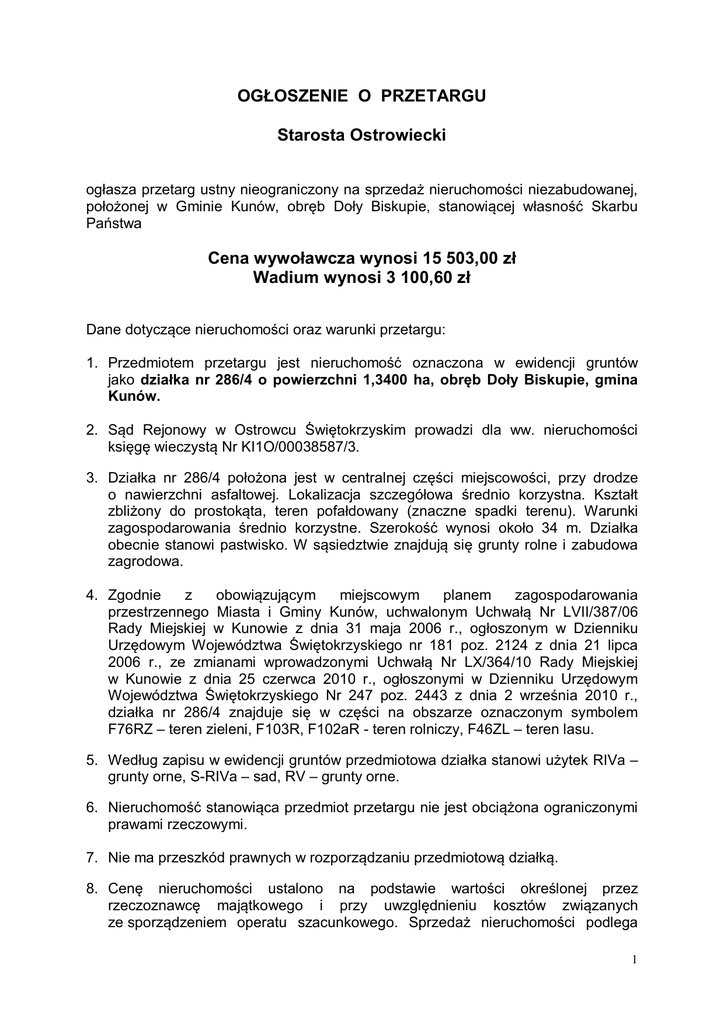 OGŁOSZENIE O PRZETARGU Starosta Ostrowiecki ogłasza przetarg ustny nieograniczony na sprzedaż nieruchomości niezabudowanej, położonej w Gminie Kunów, obręb Doły Biskupie, stanowiącej własność Skarbu Państwa Cena wywoławcza wynosi 15 503,00 zł Wadium wynosi 3 100,60 zł Dane dotyczące nieruchomości oraz warunki przetargu: 1. Przedmiotem przetargu jest nieruchomość oznaczona w ewidencji gruntów jako działka nr 286/4 o powierzchni 1,3400 ha, obręb Doły Biskupie, gmina Kunów. 2. Sąd Rejonowy w Ostrowcu Świętokrzyskim prowadzi dla ww. nieruchomości księgę wieczystą Nr KI1O/00038587/3. 3. Działka nr 286/4 położona jest w centralnej części miejscowości, przy drodze o nawierzchni asfaltowej. Lokalizacja szczegółowa średnio korzystna. Kształt zbliżony do prostokąta, teren pofałdowany (znaczne spadki terenu). Warunki zagospodarowania średnio korzystne. Szerokość wynosi około 34 m. Działka obecnie stanowi pastwisko. W sąsiedztwie znajdują się grunty rolne i zabudowa zagrodowa. 4. Zgodnie z obowiązującym miejscowym planem zagospodarowania przestrzennego Miasta i Gminy Kunów, uchwalonym Uchwałą Nr LVII/387/06 Rady Miejskiej w Kunowie z dnia 31 maja 2006 r., ogłoszonym w Dzienniku Urzędowym Województwa Świętokrzyskiego nr 181 poz. 2124 z dnia 21 lipca 2006 r., ze zmianami wprowadzonymi Uchwałą Nr LX/364/10 Rady Miejskiej w Kunowie z dnia 25 czerwca 2010 r., ogłoszonymi w Dzienniku Urzędowym Województwa Świętokrzyskiego Nr 247 poz. 2443 z dnia 2 września 2010 r., działka nr 286/4 znajduje się w części na obszarze oznaczonym symbolem F76RZ – teren zieleni, F103R, F102aR - teren rolniczy, F46ZL – teren lasu. 5. Według zapisu w ewidencji gruntów przedmiotowa działka stanowi użytek RIVa – grunty orne, S-RIVa – sad, RV – grunty orne. 6. Nieruchomość stanowiąca przedmiot przetargu nie jest obciążona ograniczonymi prawami rzeczowymi. 7. Nie ma przeszkód prawnych w rozporządzaniu przedmiotową działką. 8. Cenę nieruchomości ustalono na podstawie wartości określonej przez rzeczoznawcę majątkowego i przy uwzględnieniu kosztów związanych ze sporządzeniem operatu szacunkowego. Sprzedaż nieruchomości podlega 1 zwolnieniu od podatku VAT na podstawie art. 43 ust. 1 pkt 9 ustawy o podatku od towarów i usług z dnia 11 marca 2004 r. (tekst jedn. Dz. U. z 2011, Nr 177, poz. 1054 ze zm.). 9. Cena wywoławcza nieruchomości wynosi 15 503,00 zł netto (słownie złotych: piętnaście tysięcy pięćset trzy 00/100), bez podatku VAT. 10. Przetarg odbędzie się w dniu 23 marca 2015 r. o godzinie 10:30 w budynku Starostwa Powiatowego w Ostrowcu Św. przy ul. Iłżeckiej 37, sala konferencyjna (parter). 11. Warunkiem przystąpienia do przetargu jest wniesienie wadium w pieniądzu w wysokości 20 % ceny wywoławczej, tj. 3 100,60 zł netto (słownie złotych: trzy tysiące sto 60/100) na konto Starostwa Powiatowego w Ostrowcu Bank Spółdzielczy O/Ostrowiec Św. Nr 78 8507 0004 2001 0047 5042 0003 - Wydział Finansowy Starostwa Powiatowego w Ostrowcu Świętokrzyskim, w terminie najpóźniej do dnia 19 marca 2015 r. 12. W tytule przelewu należy podać nr działki, będącej przedmiotem sprzedaży, oraz imię, nazwisko i adres osoby biorącej udział w przetargu. 13. Wadium wpłacone przez uczestników, którzy przetargu nie wygrali, zostanie zwrócone niezwłocznie po odwołaniu, zamknięciu, unieważnieniu lub zakończeniu przetargu wynikiem negatywnym, jednak nie później niż przed upływem 3 dni od dnia odwołania, zamknięcia, unieważnienia lub zakończenia przetargu wynikiem negatywnym, przelewem bankowym na wskazane konto. Natomiast wadium wniesione przez uczestnika, który przetarg wygra, zaliczone zostanie na poczet ceny nabycia nieruchomości. W przypadku uchylenia się od zawarcia umowy sprzedaży nieruchomości, wpłacone wadium nie podlega zwrotowi. Uchylenie się od zawarcia umowy stanowi w szczególności niestawienie się uczestnika, który przetarg wygrał, w miejscu i terminie wyznaczonym przez organizatora przetargu w celu zawarcia umowy sprzedaży. 14. Postąpienie powyżej ceny wywoławczej nie może wynosić mniej niż 1% ceny wywoławczej, z zaokrągleniem w górę do pełnych dziesiątek złotych. 15. Uczestnik przetargu winien przedłożyć Komisji Przetargowej dowód wniesienia wadium na rachunek bankowy lub pokwitowanie z kasy Starostwa Powiatowego w Ostrowcu Św. 16. Osoba reprezentująca w przetargu uczestników winna się okazać stosownym pełnomocnictwem. 17. Cena uzyskana w przetargu (pomniejszona o wcześniej wpłacone wadium) podlega zapłacie w całości na konto Starostwa Powiatowego w Ostrowcu Świętokrzyskim najpóźniej w dniu zawarcia notarialnej umowy sprzedaży. W dniu zawarcia ww. umowy, kwota równa cenie uzyskanej w przetargu, powinna być zaksięgowana na rachunku bankowym Starosta Powiatowego w Ostrowcu Świętokrzyskim. 2 18. Sprzedaż ww. nieruchomości nie podlega opodatkowaniu podatkiem od towarów i usług VAT co wynika z art. 43 ust.1 pkt 9 ustawy o podatku od towarów i usług z dnia 11 marca 2004 r. (tekst jedn. Dz. U. z 2011, Nr 177, poz. 1054 ze zm.). 19. Koszty zawarcia aktu notarialnego ponosi nabywca. 20. Nieruchomość można oglądać po uprzednim uzgodnieniu terminu w Wydziale Gospodarki Nieruchomościami pod nr telefonu: 41 247-52-78. 21. Dodatkowych informacji na temat: a) nieruchomości, będącej przedmiotem przetargu, udziela Wydział Gospodarki Nieruchomościami Starostwa Powiatowego w Ostrowcu Św. z siedzibą przy ul. Iłżeckiej 37, III piętro, pokój nr 304 lub pod nr telefonu 41 247-52-78, b) warunków przetargu udziela Wydział Rozwoju Powiatu Referat Zamówień Publicznych i Przetargów Starostwa Powiatowego w Ostrowcu Św. z siedzibą przy ul. Iłżeckiej 37, pokój nr 214 lub pod nr telefonu 41 247-64-68. 3