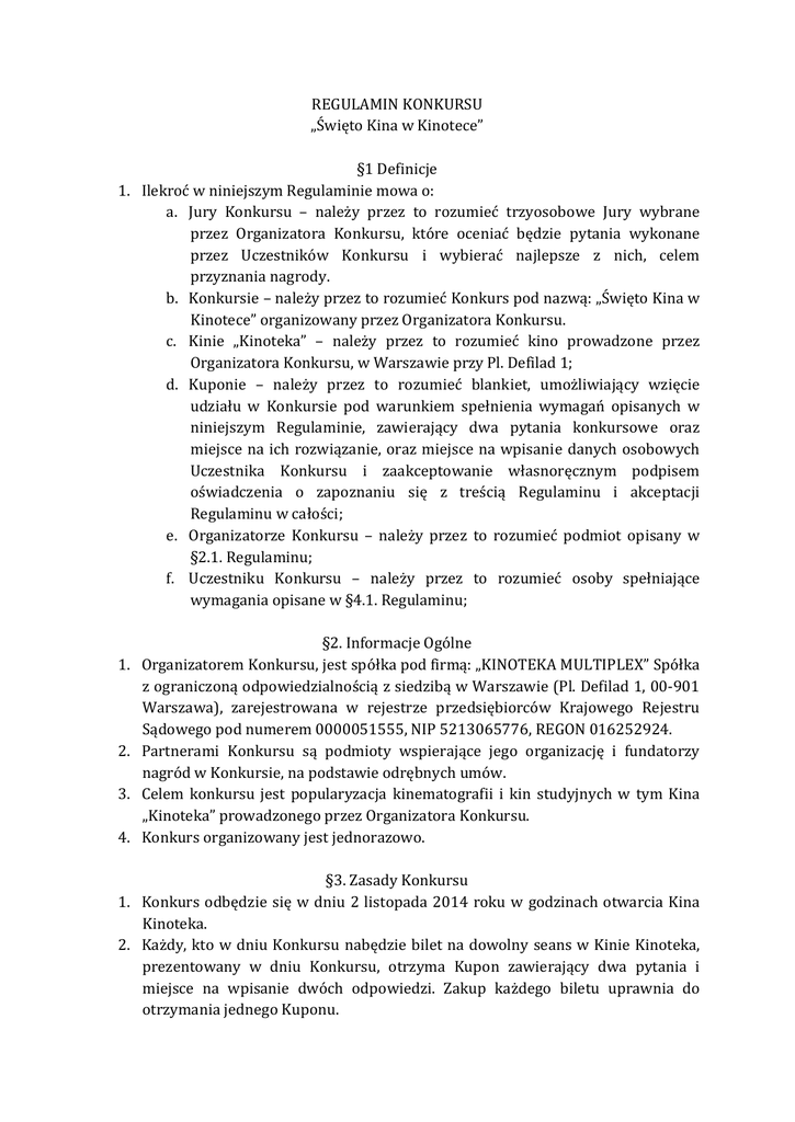 REGULAMIN KONKURSU „Święto Kina w Kinotece” §1 Definicje 1. Ilekroć w niniejszym Regulaminie mowa o: a. Jury Konkursu – należy przez to rozumieć trzyosobowe Jury wybrane przez Organizatora Konkursu, które oceniać będzie pytania wykonane przez Uczestników Konkursu i wybierać najlepsze z nich, celem przyznania nagrody. b. Konkursie – należy przez to rozumieć Konkurs pod nazwą: „Święto Kina w Kinotece” organizowany przez Organizatora Konkursu. c. Kinie „Kinoteka” – należy przez to rozumieć kino prowadzone przez Organizatora Konkursu, w Warszawie przy Pl. Defilad 1; d. Kuponie – należy przez to rozumieć blankiet, umożliwiający wzięcie udziału w Konkursie pod warunkiem spełnienia wymagań opisanych w niniejszym Regulaminie, zawierający dwa pytania konkursowe oraz miejsce na ich rozwiązanie, oraz miejsce na wpisanie danych osobowych Uczestnika Konkursu i zaakceptowanie własnoręcznym podpisem oświadczenia o zapoznaniu się z treścią Regulaminu i akceptacji Regulaminu w całości; e. Organizatorze Konkursu – należy przez to rozumieć podmiot opisany w §2.1. Regulaminu; f. Uczestniku Konkursu – należy przez to rozumieć osoby spełniające wymagania opisane w §4.1. Regulaminu; 1. 2. 3. 4. §2. Informacje Ogólne Organizatorem Konkursu, jest spółka pod firmą: „KINOTEKA MULTIPLEX” Spółka z ograniczoną odpowiedzialnością z siedzibą w Warszawie (Pl. Defilad 1, 00-901 Warszawa), zarejestrowana w rejestrze przedsiębiorców Krajowego Rejestru Sądowego pod numerem 0000051555, NIP 5213065776, REGON 016252924. Partnerami Konkursu są podmioty wspierające jego organizację i fundatorzy nagród w Konkursie, na podstawie odrębnych umów. Celem konkursu jest popularyzacja kinematografii i kin studyjnych w tym Kina „Kinoteka” prowadzonego przez Organizatora Konkursu. Konkurs organizowany jest jednorazowo. §3. Zasady Konkursu 1. Konkurs odbędzie się w dniu 2 listopada 2014 roku w godzinach otwarcia Kina Kinoteka. 2. Każdy, kto w dniu Konkursu nabędzie bilet na dowolny seans w Kinie Kinoteka, prezentowany w dniu Konkursu, otrzyma Kupon zawierający dwa pytania i miejsce na wpisanie dwóch odpowiedzi. Zakup każdego biletu uprawnia do otrzymania jednego Kuponu. 3. Każdy kto otrzymał Kupon i spełnia wymagania uprawiające go do wzięcia udziału w Konkursie opisane w §4 Regulaminu, może dobrowolnie wziąć udział w Konkursie. 4. Konkurs polegać będzie na wykonaniu przez Uczestnika, jednego lub dwóch pytań konkursowych (w zależności od woli Uczestnika), poprzez udzielenie kreatywnej i twórczej odpowiedzi na jedno lub oba pytania znajdujące się na Kuponie. Odpowiedź na pytanie konkursowe musi być na tyle zwięzła, aby zmieściła się na miejscu przeznaczonym na jej udzielenie w Kuponie i na tyle czytelna, aby umożliwić Jury zapoznanie się z nią. Odpowiedź musi być udzielona w języku polskim. 5. Odpowiedź na pierwsze pytanie znajdujące się na Kuponie, uprawniać będzie Uczestnika Konkursu, do wzięciu udziału w konkursie seansu, w ramach którego Jury wybierze zwycięzców spośród Uczestników Konkursu, którzy są widzami danego seansu filmowego. 6. Odpowiedź na drugie pytanie znajdujące się na Kuponie, uprawniać będzie Uczestnika Konkursu, do wzięcia udziału w konkursie głównym, w ramach którego Jury wybierze zwycięzców spośród wszystkich Uczestników Konkursu. §4. Uczestnicy Konkursu 1. Uczestnikiem Konkursu jest każda pełnoletnia osoba fizyczna o pełnej zdolności do czynności prawnych, która spełnia łącznie wszystkie poniższe wymagania: a. nabędzie w dniu Konkursu bilet na dowolny film wyświetlany w dniu Konkursu w Kinie Kinoteka; b. wypełni Kupon, który zostanie jej przekazany wraz z nabyciem biletu, podając swoje imię, nazwisko, datę urodzenia, adres zamieszkania, telefon kontaktowy i adres e-mail, oraz zaakceptuje własnoręcznym podpisem oświadczenie o zapoznaniu się z treścią Regulaminu Konkursu i akceptacją tego Regulaminu w całości; c. udzieli kreatywnej i twórczej odpowiedzi na pytanie biorące udział w wyborze zwycięzcy nagrody seansu i/lub na pytanie biorące udział w wyborze zwycięzcy nagrody głównej; d. przekaże należycie wypełniony Kupon osobie wyznaczonej do odbioru Kuponów przed wejściem na seans. 2. W przypadku osoby, która nabyła więcej niż jeden bilet i otrzymała więcej niż jeden Kupon, ma ona prawo zostać Uczestnikiem Konkursu tyle razy, ile Kuponów otrzymała. 3. Uczestnikiem Konkursu, pomimo spełnienia wymagań określonych w ustępie 1, nie mogą być pracownicy Organizatora Konkursu ani ich osoby najbliższe w rozumieniu przepisu art. 115 §11 Kodeksu karnego. §5. Wybór zwycięzców. 1. Wyboru zwycięzców nagrody seansu i nagrody głównej, dokonuje Jury. Wybór dokonywany jest przez Jury w oparciu o subiektywną ocenę kreatywności i twórczego charakteru odpowiedzi na pytania konkursowe udzielonych przez Uczestników Konkursu. Wybór dokonany przez Jury jest ostateczny i nie podlega procedurze odwoławczej. 2. Wybór zwycięzców nagrody seansu, dokonywany jest w trakcie trwania każdego seansu filmowego w dniu Konkursu, spośród wszystkich odpowiedzi udzielonych na pierwsze pytanie konkursowe umieszczone na Kuponie, przez Uczestników Konkursu przebywających na danym seansie i obwieszczany jest ustnie przez członka Jury niezwłocznie po zakończeniu seansu, na sali kinowej na której odbywała się projekcja seansu filmowego. 3. Wybór zwycięzców nagród głównych, dokonywany jest do dnia 5 listopada 2014 roku, spośród wszystkich odpowiedzi udzielonych na drugie pytanie konkursowe umieszczone na Kuponie przez Uczestników Konkursu i obwieszczony do godziny 17 w dniu 5 listopada 2014 roku na stronie internetowej Kina Kinoteka. 4. Organizator Konkursu umieści imiona i nazwiska zwycięzców nagród głównych, wraz z podaniem informacji o nagrodzie, na stronie internetowej Kina Kinoteka, oraz zawiadomi