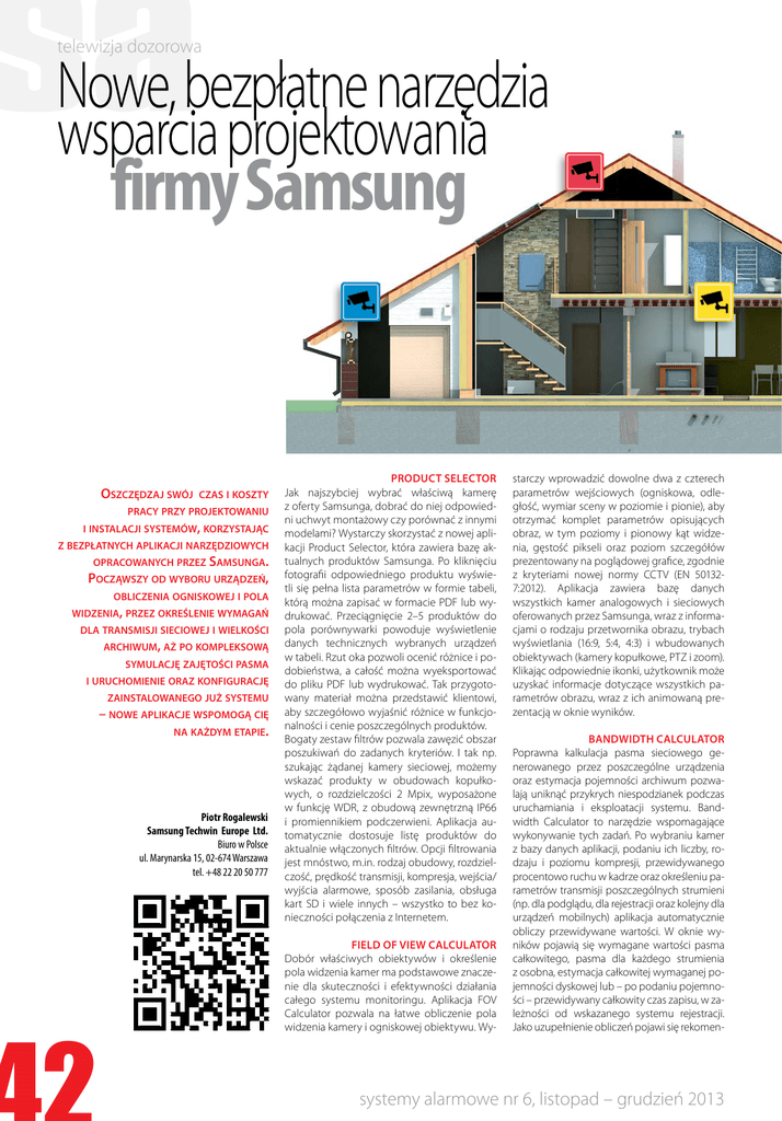 telewizja dozorowa Nowe, bezpłatne narzędzia wsparcia projektowania firmy Samsung Oszczędzaj swój czas i koszty pracy przy projektowaniu i instalacji systemów, korzystając z bezpłatnych aplikacji narzędziowych opracowanych przez Samsunga. Począwszy od wyboru urządzeń, obliczenia ogniskowej i pola widzenia, przez określenie wymagań dla transmisji sieciowej i wielkości archiwum, aż po kompleksową symulację zajętości pasma i uruchomienie oraz konfigurację zainstalowanego już systemu – nowe aplikacje wspomogą cię na każdym etapie. Piotr Rogalewski Samsung Techwin Europe Ltd. Biuro w Polsce ul. Marynarska 15, 02-674 Warszawa tel. +48 22 20 50 777 Product Selector Jak najszybciej wybrać właściwą kamerę z oferty Samsunga, dobrać do niej odpowiedni uchwyt montażowy czy porównać z innymi modelami? Wystarczy skorzystać z nowej aplikacji Product Selector, która zawiera bazę aktualnych produktów Samsunga. Po kliknięciu fotografii odpowiedniego produktu wyświetli się pełna lista parametrów w formie tabeli, którą można zapisać w formacie PDF lub wydrukować. Przeciągnięcie 2–5 produktów do pola porównywarki powoduje wyświetlenie danych technicznych wybranych urządzeń w tabeli. Rzut oka pozwoli ocenić różnice i podobieństwa, a całość można wyeksportować do pliku PDF lub wydrukować. Tak przygotowany materiał można przedstawić klientowi, aby szczegółowo wyjaśnić różnice w funkcjonalności i cenie poszczególnych produktów. Bogaty zestaw filtrów pozwala zawęzić obszar poszukiwań do zadanych kryteriów. I tak np. szukając żądanej kamery sieciowej, możemy wskazać produkty w obudowach kopułkowych, o rozdzielczości 2 Mpix, wyposażone w funkcję WDR, z obudową zewnętrzną IP66 i promiennikiem podczerwieni. Aplikacja automatycznie dostosuje listę produktów do aktualnie włączonych filtrów. Opcji filtrowania jest mnóstwo, m.in. rodzaj obudowy, rozdzielczość, prędkość transmisji, kompresja, wejścia/ wyjścia alarmowe, sposób zasilania, obsługa kart SD i wiele innych – wszystko to bez konieczności połączenia z Internetem. Field of View Calculator Dobór właściwych obiektywów i określenie pola widzenia kamer ma podstawowe znaczenie dla skuteczności i efektywności działania całego systemu monitoringu. Aplikacja FOV Calculator pozwala na łatwe obliczenie pola widzenia kamery i ogniskowej obiektywu. Wy- starczy wprowadzić dowolne dwa z czterech parametrów wejściowych (ogniskowa, odległość, wymiar sceny w poziomie i pionie), aby otrzymać komplet parametrów opisujących obraz, w tym poziomy i pionowy kąt widzenia, gęstość pikseli oraz poziom szczegółów prezentowany na poglądowej grafice, zgodnie z kryteriami nowej normy CCTV (EN 501327:2012). Aplikacja zawiera bazę danych wszystkich kamer analogowych i sieciowych oferowanych przez Samsunga, wraz z informacjami o rodzaju przetwornika obrazu, trybach wyświetlania (16:9, 5:4, 4:3) i wbudowanych obiektywach (kamery kopułkowe, PTZ i zoom). Klikając odpowiednie ikonki, użytkownik może uzyskać informacje dotyczące wszystkich parametrów obrazu, wraz z ich animowaną prezentacją w oknie wyników. Bandwidth Calculator Poprawna kalkulacja pasma sieciowego generowanego przez poszczególne urządzenia oraz estymacja pojemności archiwum pozwalają uniknąć przykrych niespodzianek podczas uruchamiania i eksploatacji systemu. Bandwidth Calculator to narzędzie wspomagające wykonywanie tych zadań. Po wybraniu kamer z bazy danych aplikacji, podaniu ich liczby, rodzaju i poziomu kompresji, przewidywanego procentowo ruchu w kadrze oraz określeniu parametrów transmisji poszczególnych strumieni (np. dla podglądu, dla rejestracji oraz kolejny dla urządzeń mobilnych) aplikacja automatycznie obliczy przewidywane wartości. W oknie wyników pojawią się wymagane wartości pasma całkowitego, pasma dla każdego strumienia z osobna, estymacja całkowitej wymaganej pojemności dyskowej lub – po podaniu pojemności – przewidywany całkowity czas zapisu, w zależności od wskazanego systemu rejestracji. Jako uzupełnienie obliczeń pojawi się rekomen- systemy alarmowe nr 6, listopad – grudzień 2013 Product Selector Bandwidth Calculator iPolis Network Design Tool iPolis Device Manager dowana specyfikacja techniczna serwerów rejestracji i komputerów dla stacji roboczych. Aplikacja tworzy także szczegółowy raport z obliczeń, który można wydrukować lub zapisać w pliku PDF. iPolis Network Design Tool Ta aplikacja to ukłon w stronę projektantów i integratorów systemów CCTV. Pozwala m.in. na wykonanie szczegółowego schematu, z wykorzystaniem gotowych, predefiniowanych symboli dla urządzeń FOV Calculator i oprogramowania Samsunga. Filtrowanie biblioteki produktów (tak jak w Product Selector), definiowanie rodzaju połączeń (100 Mb/s, 1 Gb/s itd.), podgląd wszystkich parametrów aktualnie zaznaczonego urządzenia, definiowanie adresowania IP, parametrów transmisji, rozdzielczości, kompresji itd., to tylko niektóre ważne funkcje. Aby przyspieszyć rysowanie, można zdefiniować grupy urządzeń (np. zamiast rysować 10 kamer, wystarczy utworzyć grupę urządzeń i nadać jej wartość liczbową). Wbudowany moduł raportowania automatycznie tworzy szczegółową listę sprzętu, która po uzupełnieniu o ceny jednostkowe staje się automatycznie skalkulowanym, gotowym kosztorysem systemu. Na szczególną uwagę zasługuje funkcja symulacji zajętości pasma, przedstawiana w formie wykresu uzupełnionego tabelą wartości. Dla każdego elementu systemu (kamery, rejestratory, oprogramowanie itp.) są szczegółowo podawane przewidywane wartości (w Mb/s) dla transmisji zarówno przychodzącej, jak i wychodzącej (np. emulacja jednoczesnego zapisu i odtwarzania obrazu w rejestratorze). Schemat oraz wszystkie wyniki obliczeń i symulacji można zapisać na dysku w formatach Excel, Word lub PDF albo wydrukować. iPolis Device Ma